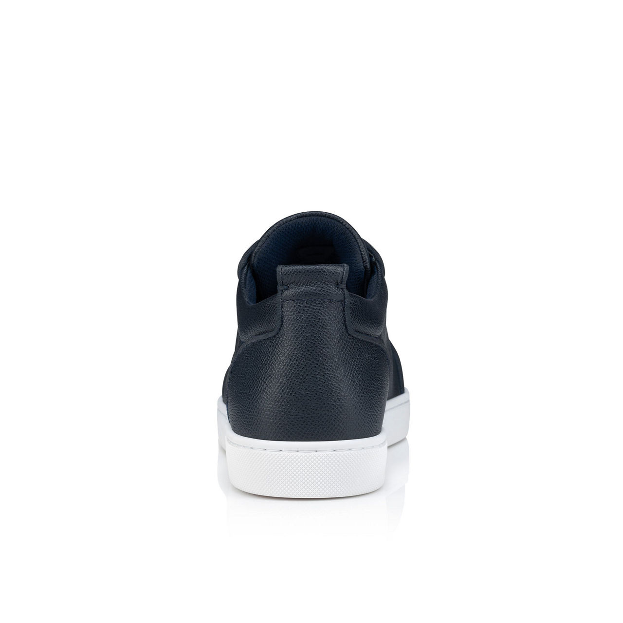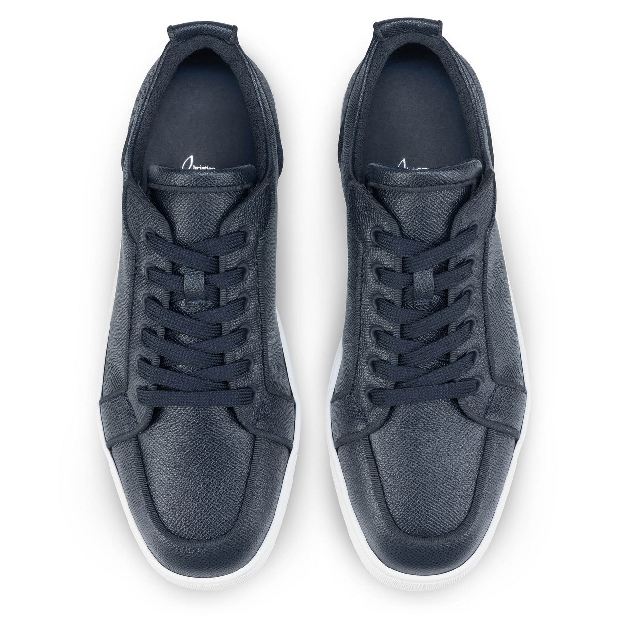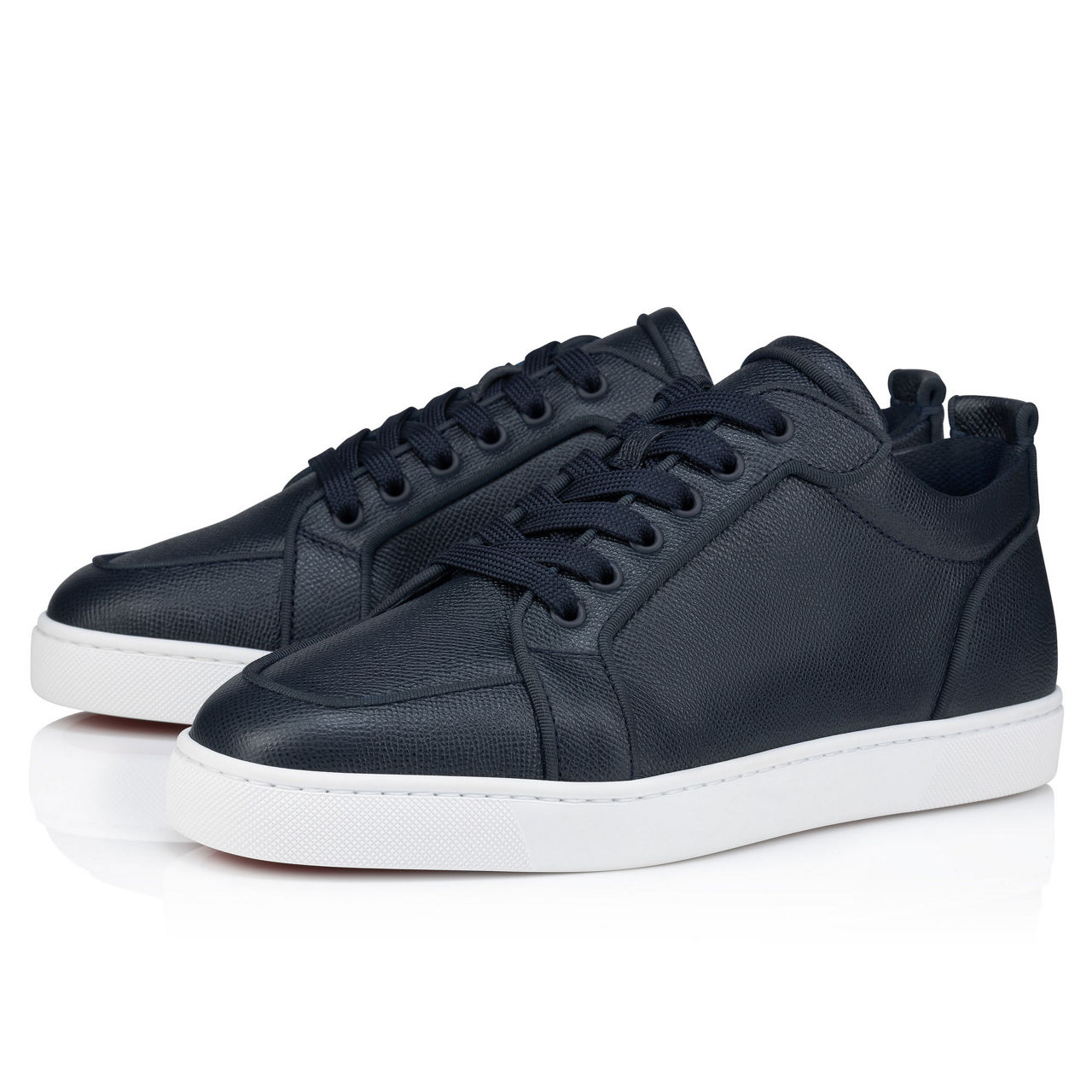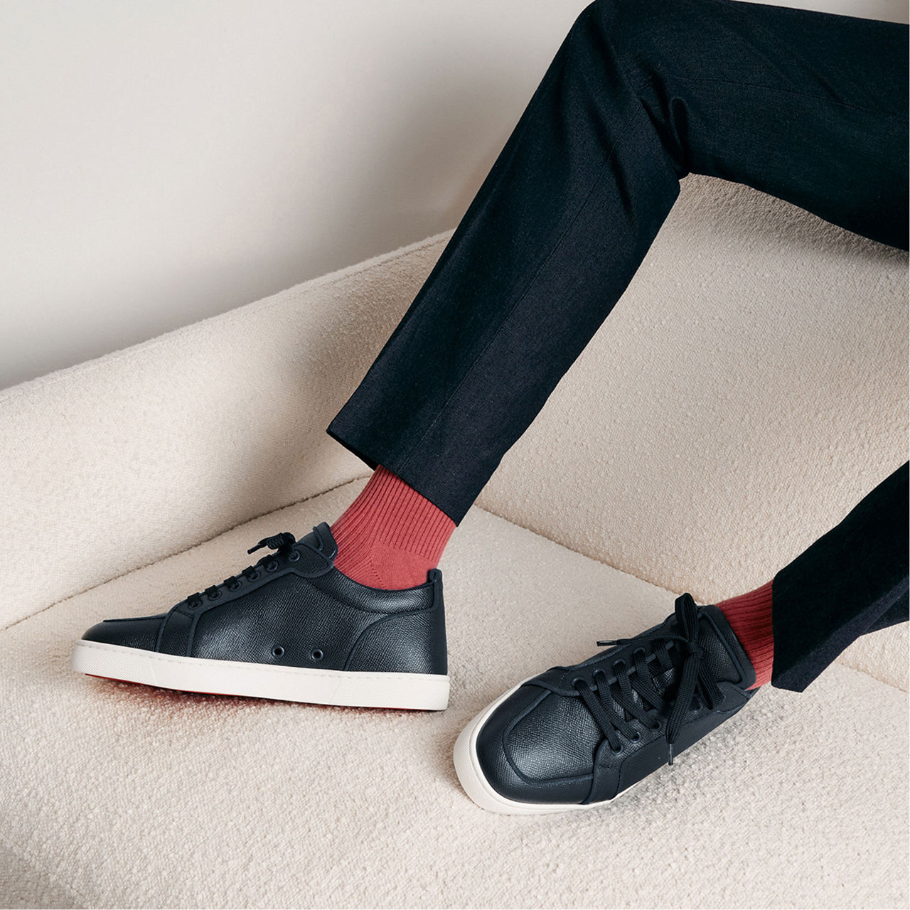 - Low-top profile, lace-up fastening, contrast rubber sole, heel tab, curved lines, signature red sole, brand logo details, almond toe