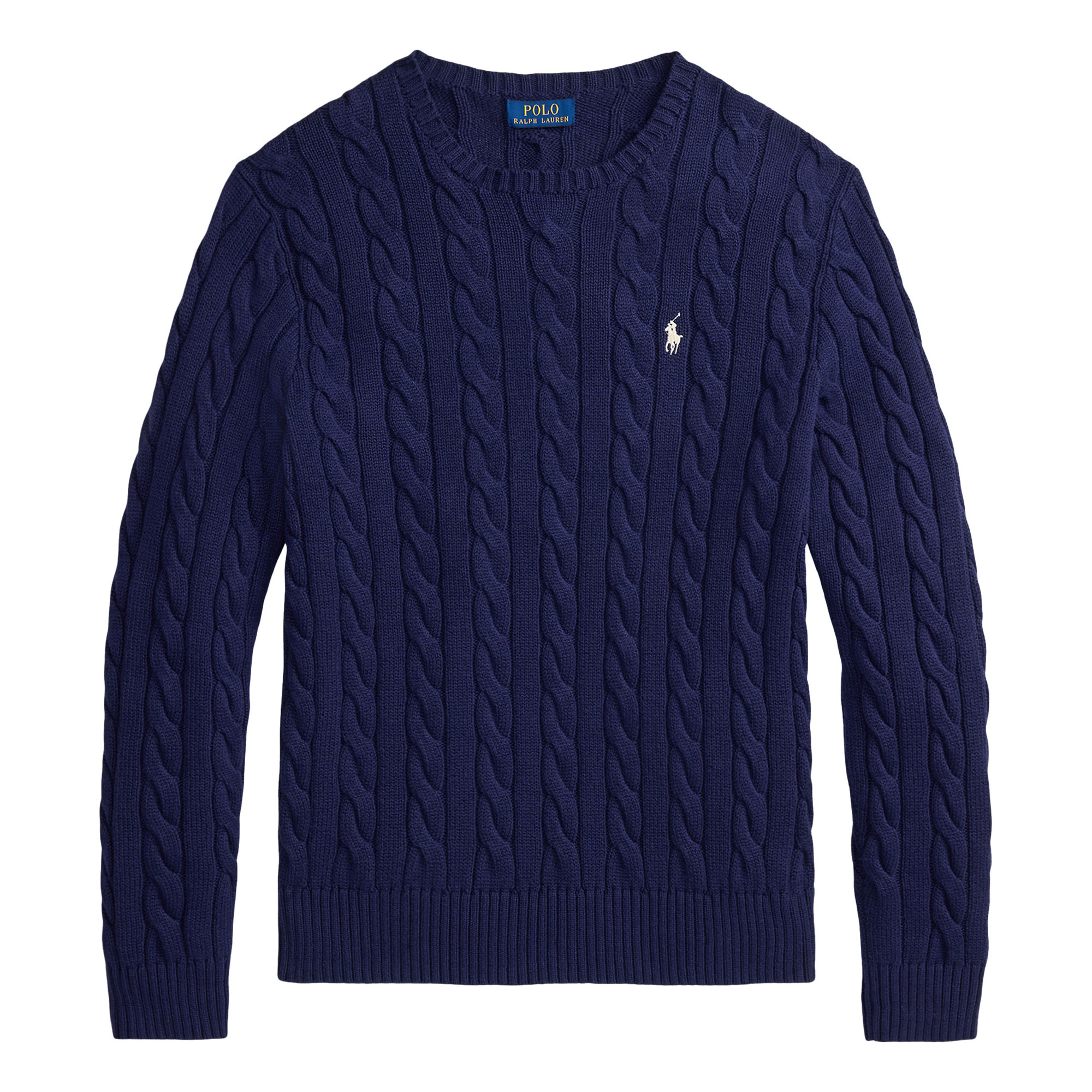 - Textural cable knit design, crew neck, long sleeves with rib knit cuffs, rib knit hem, logo detail at left chest