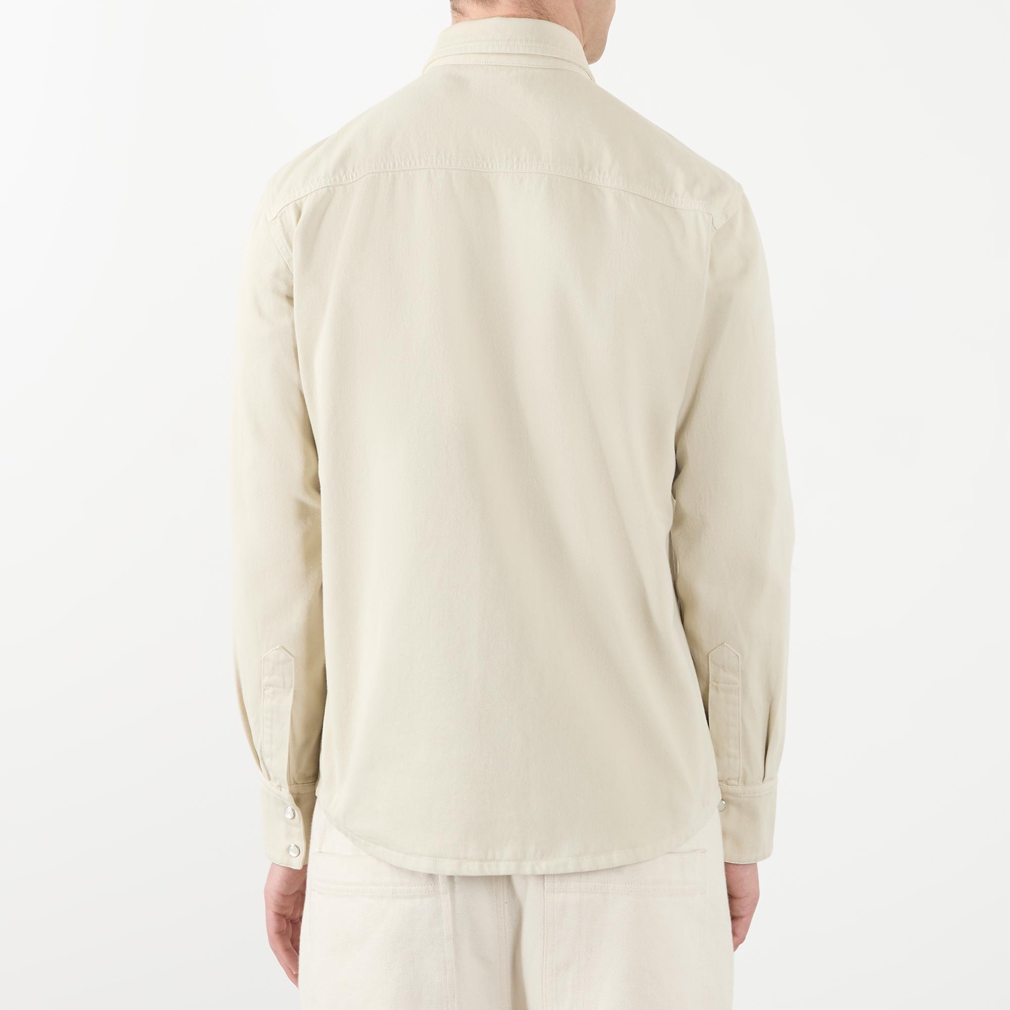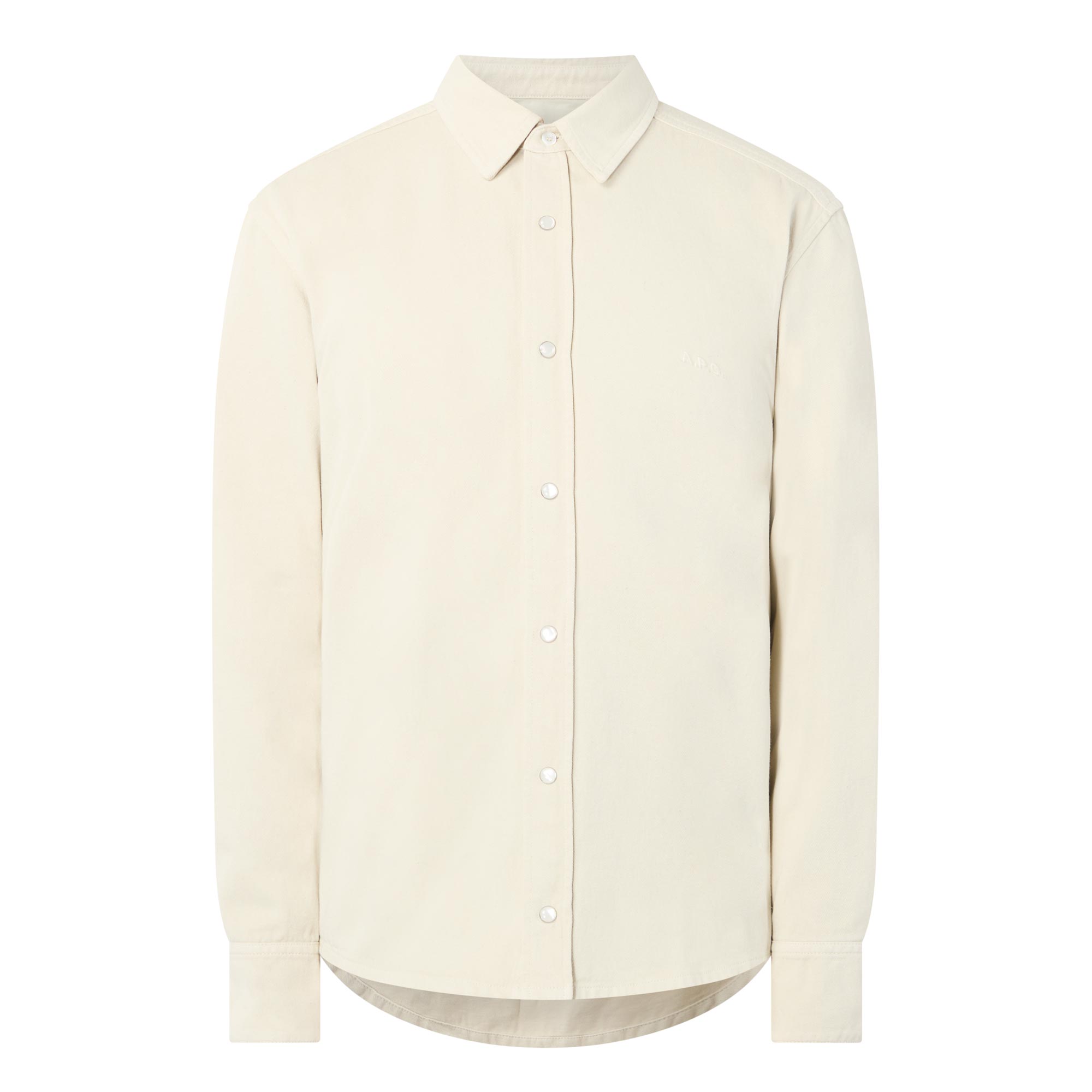 - Point collar, long sleeves, dropped shoulders, front button placket, tonal logo embroidery, tonal stitching, double-button cuffs, curved hemline, smooth fabric