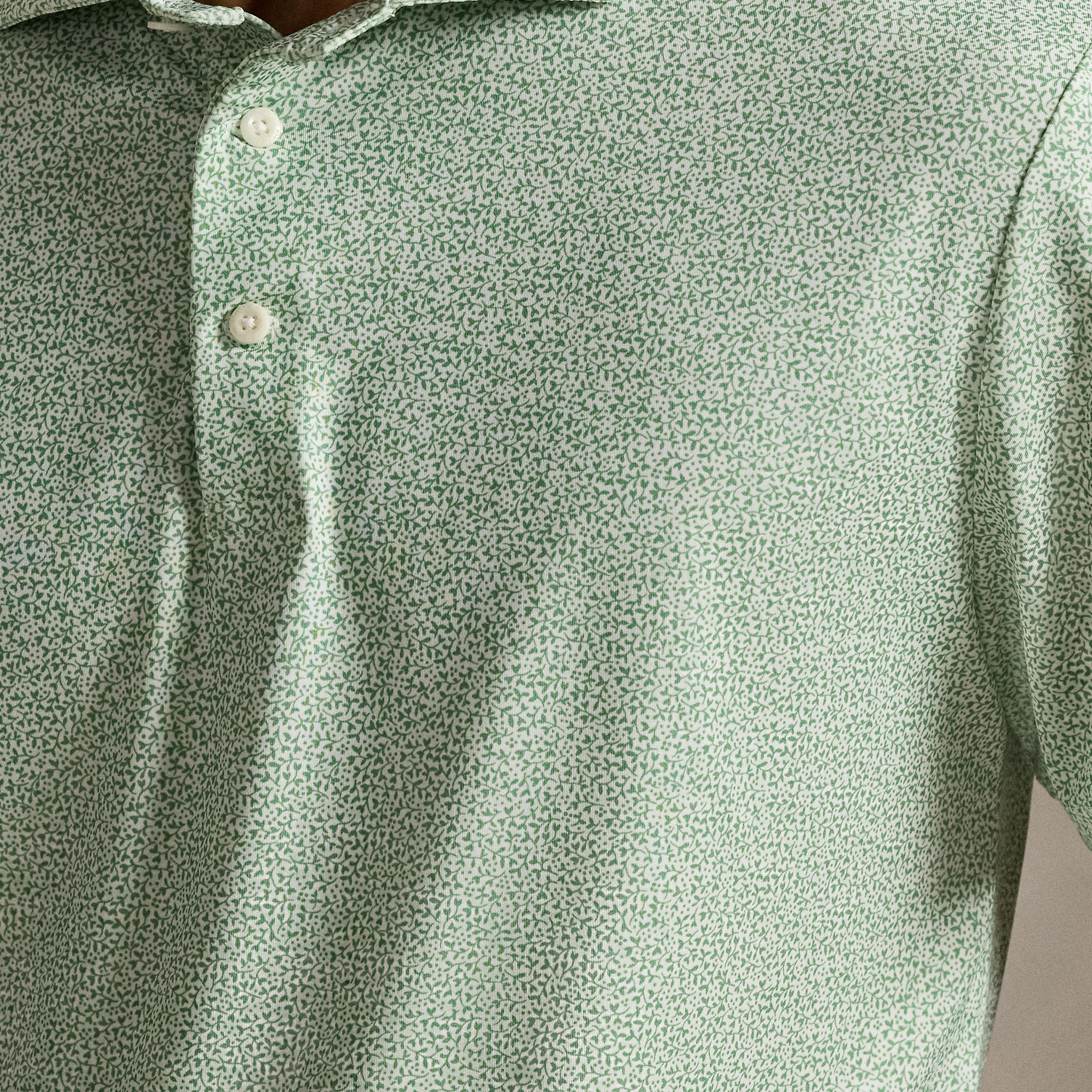 • Spread Polo collar, three-button placket, Corozo logo buttons, short sleeves, silicone logo tab, even vented hem, all-over vine print