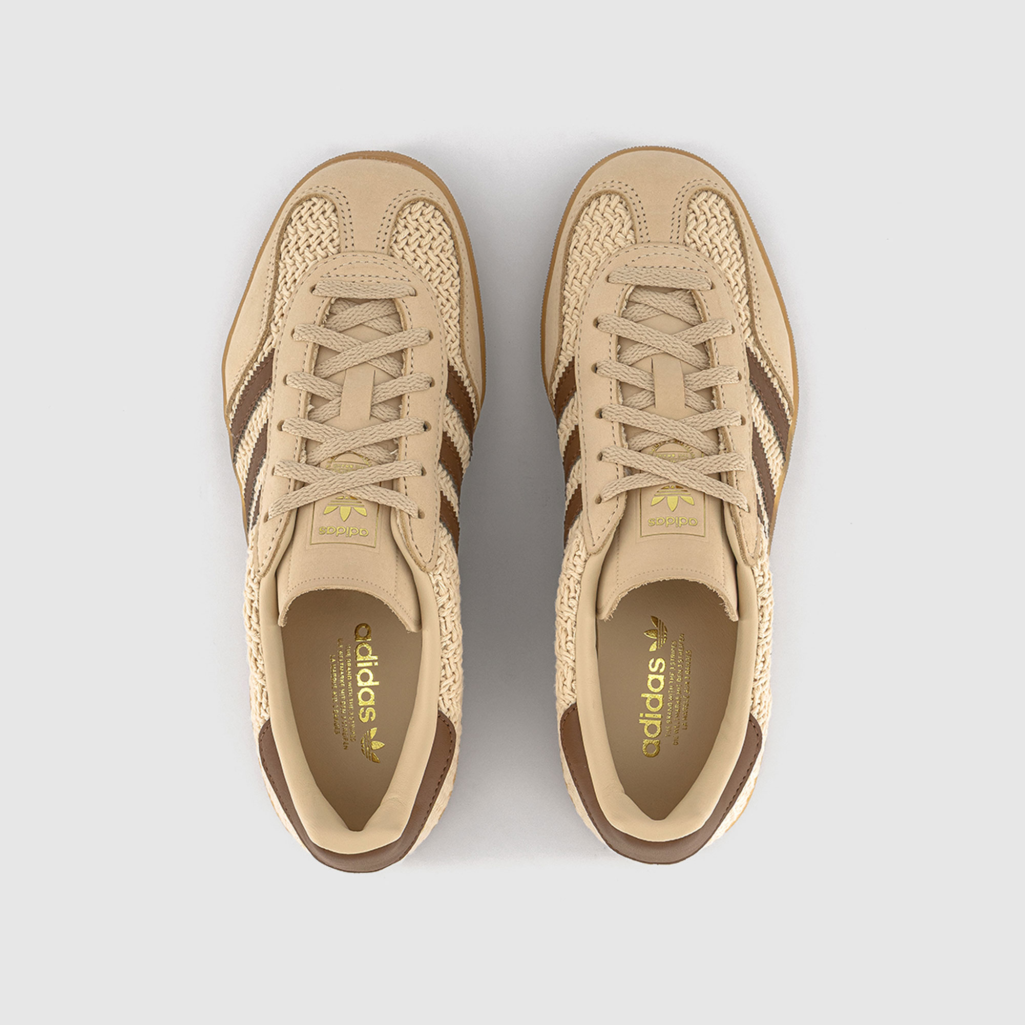 - Round toe, low top, padded collar, lace up fastening, gum sole, logo detail, iconic triple stripe detailing to the side, gold-foil lettering