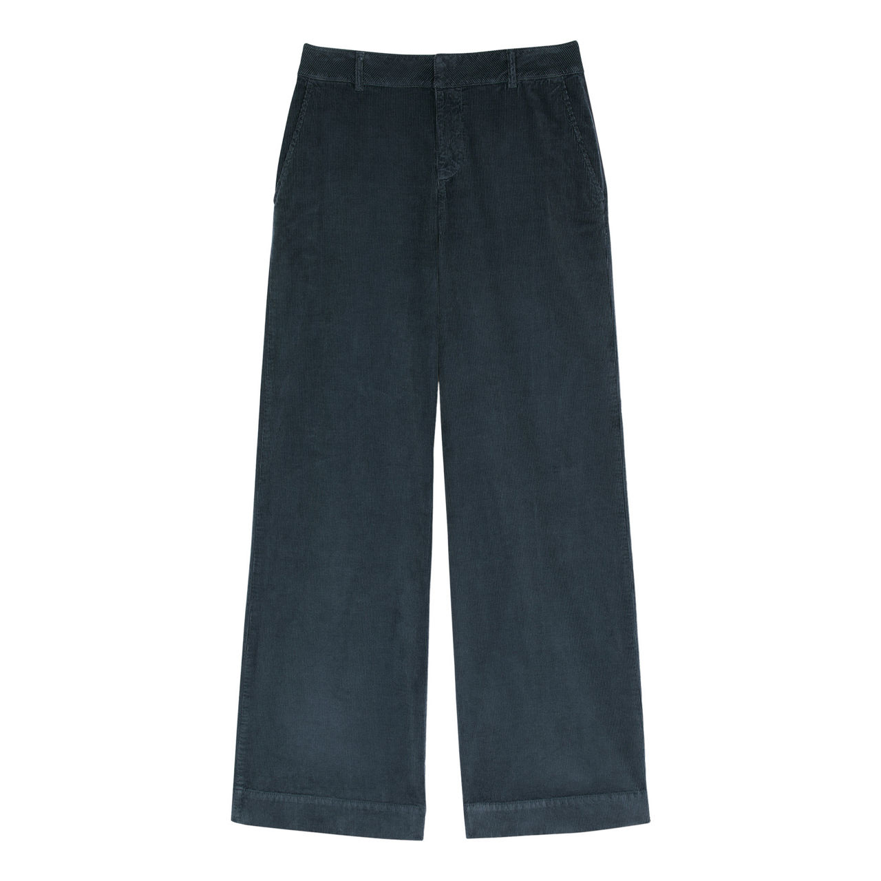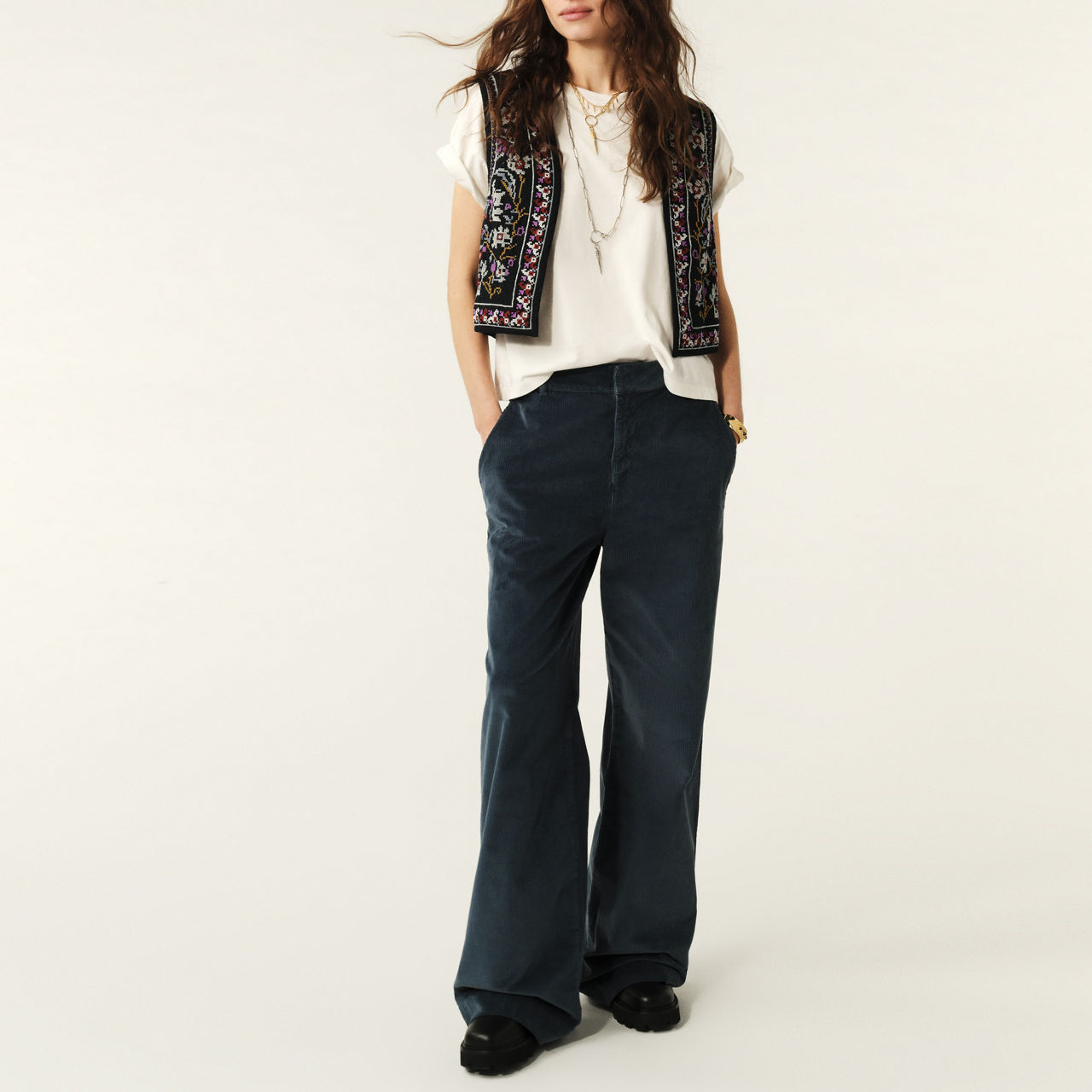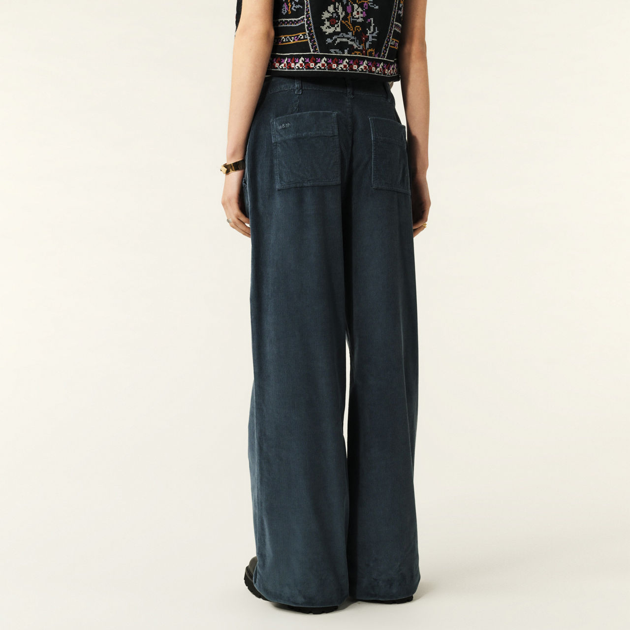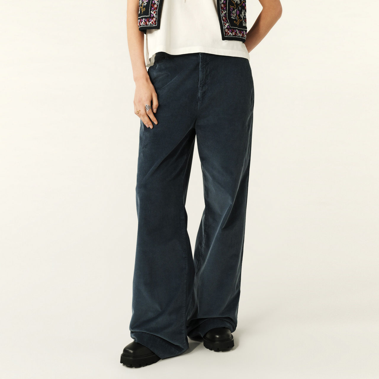 - High waist, wide leg, relaxed silhouette, zip and button fastening, side pockets, back patch pockets, belt loops, soft finish