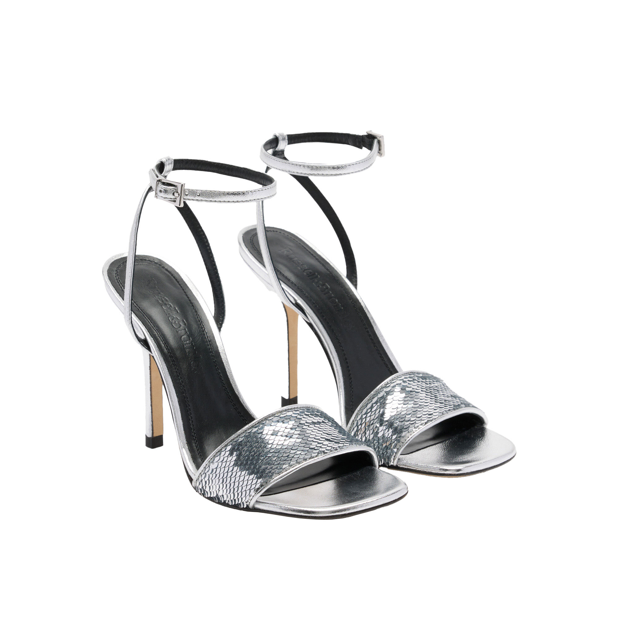 - Soft square toe, structured ankle strap, sequined surface, graphic design, light-catching sparkle