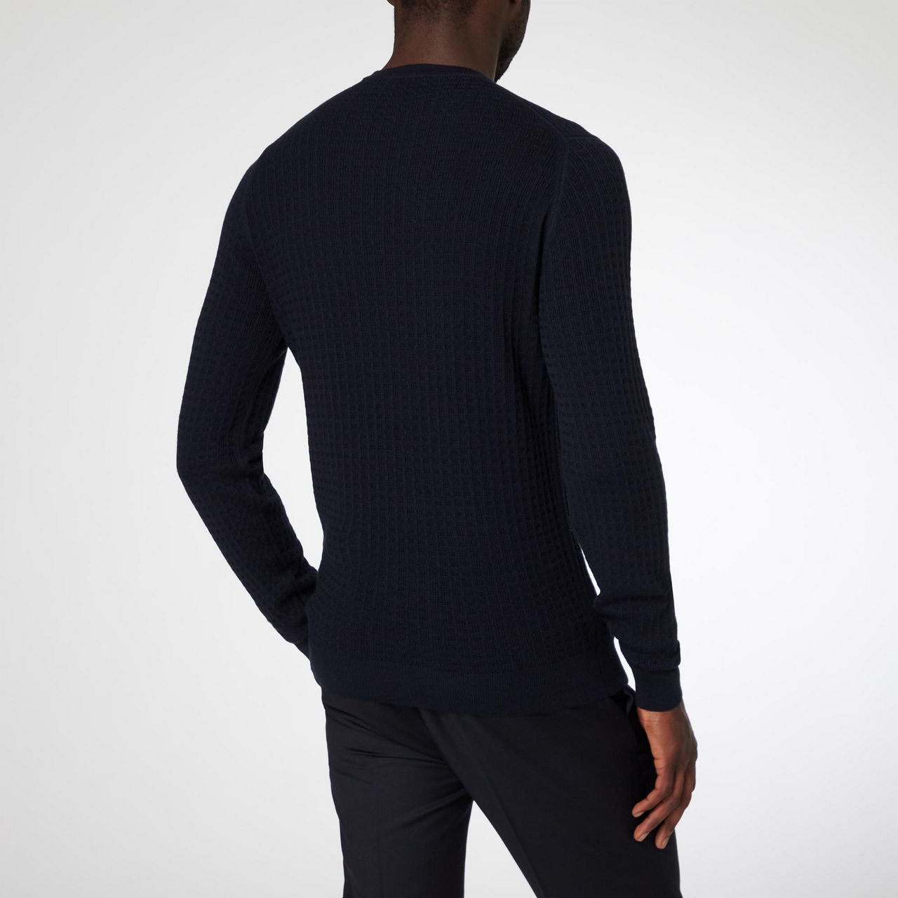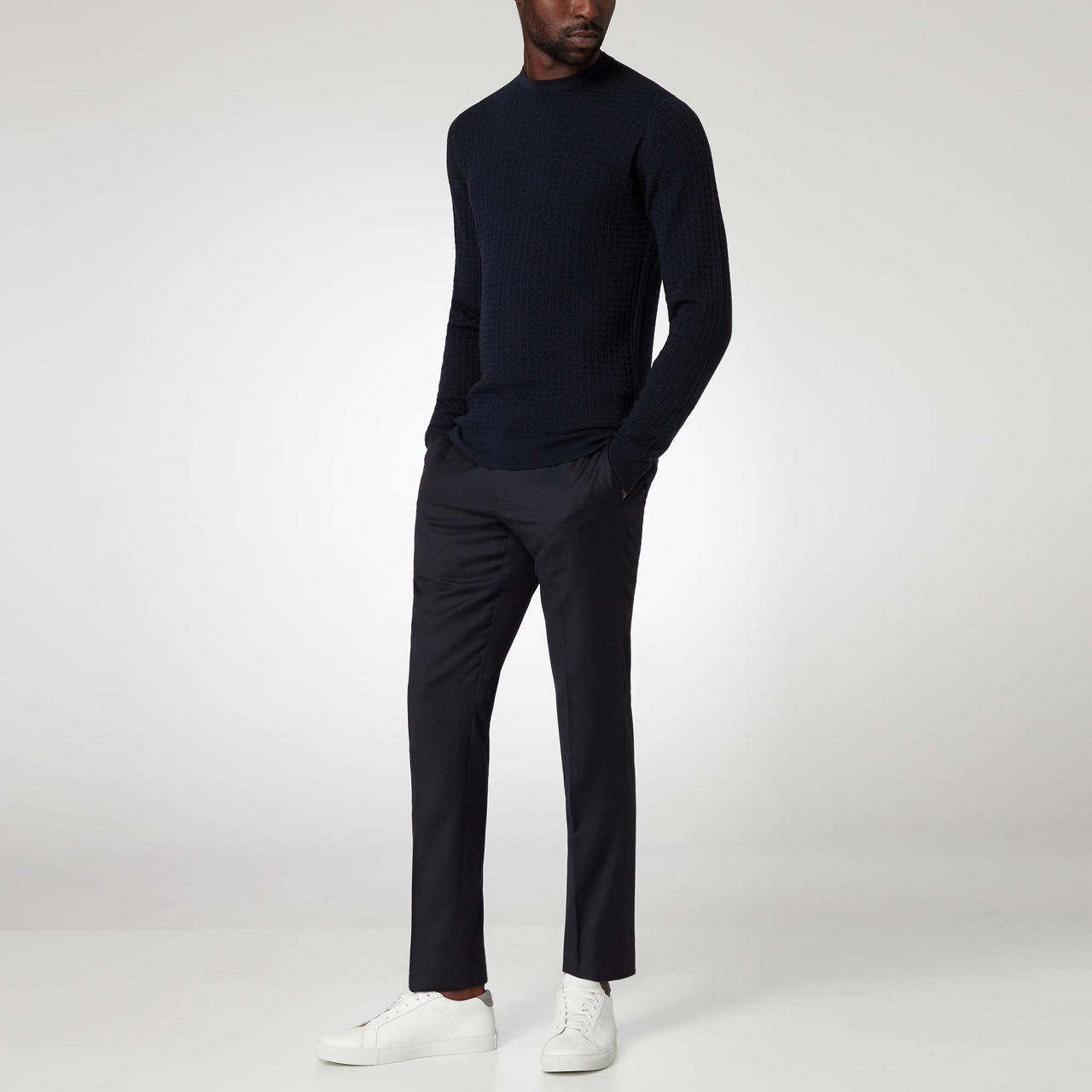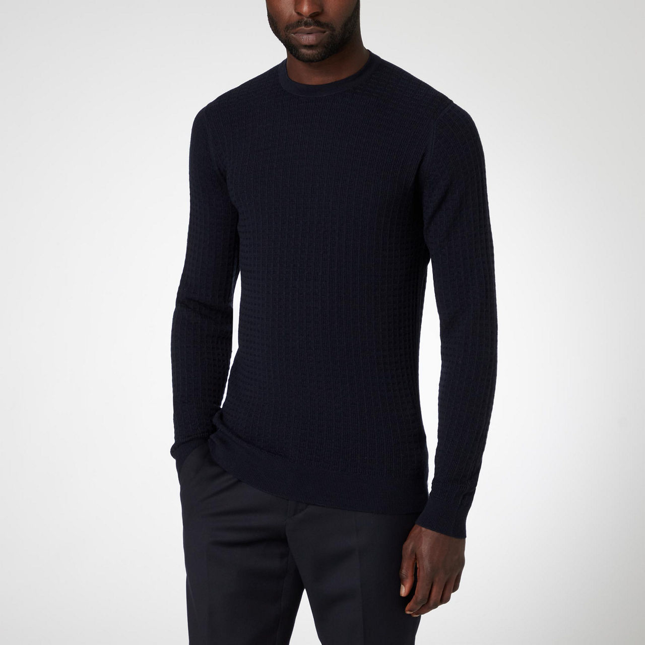 The Narrow Leaf Sweater from John Smedley is all about the texture. It's woven from rich merino wool in a waffle knit and it's breathable to ensure all-day comfort. Layer over pressed trousers or chinos.