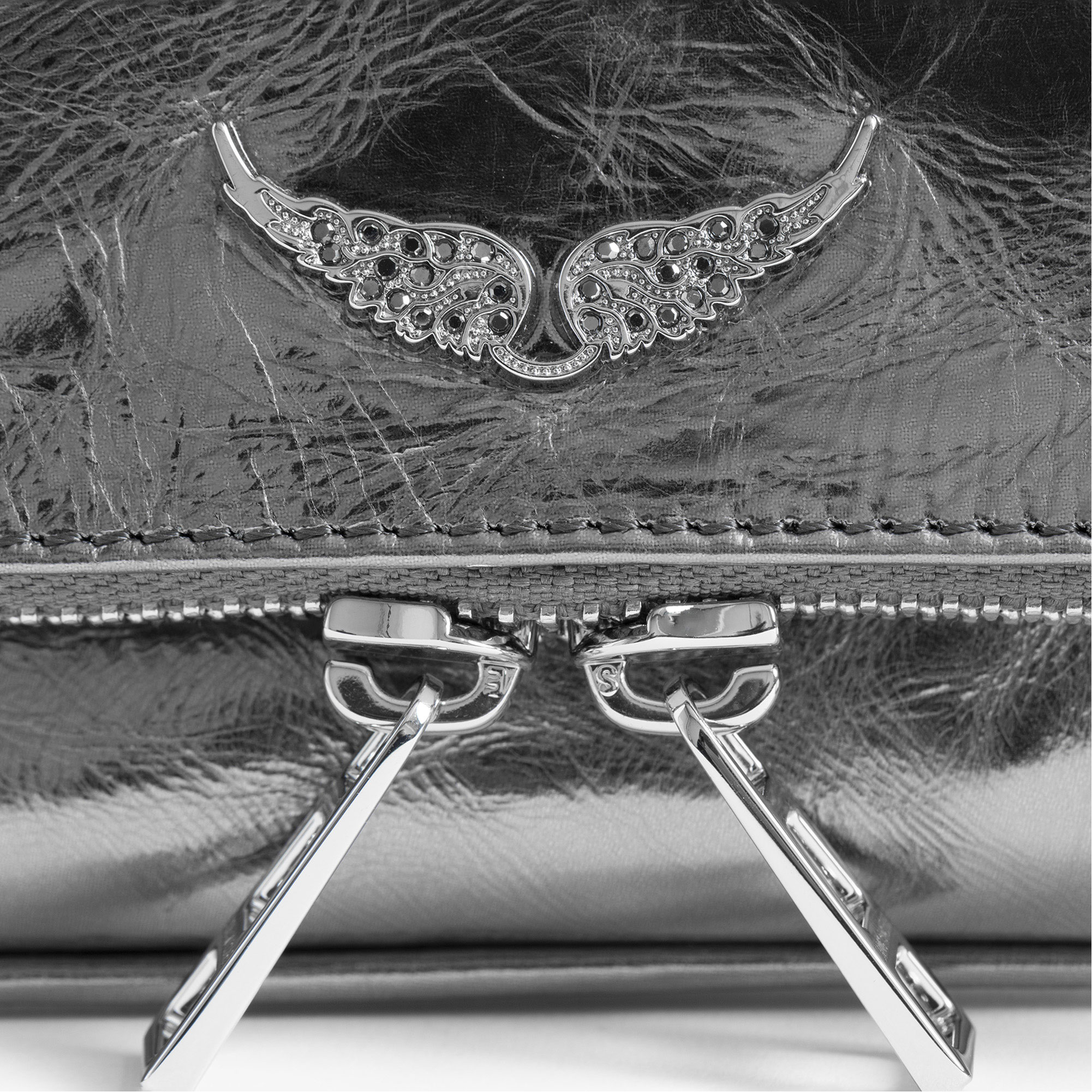 - Metallic leather, clutch style, signature rhinestone-embellished wings