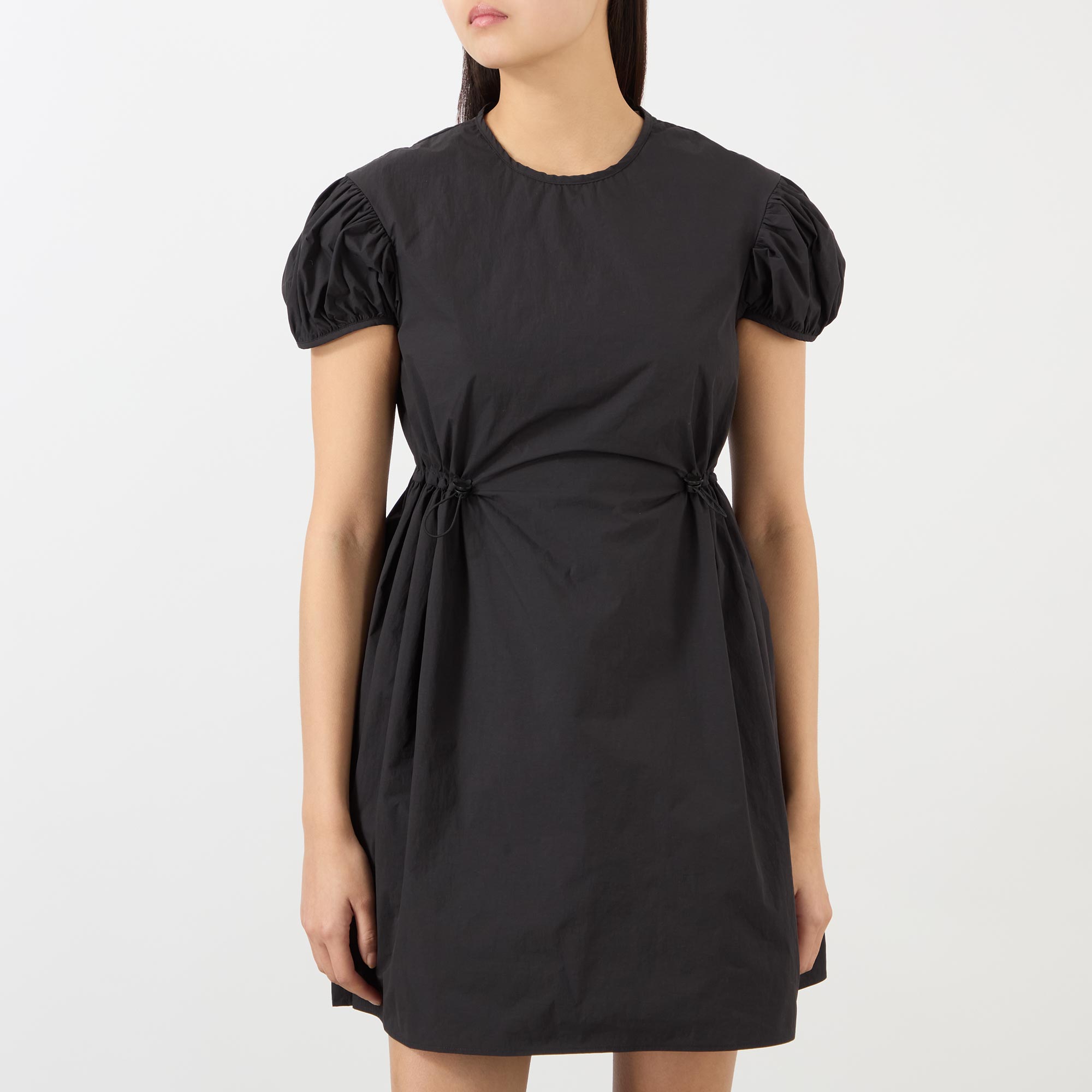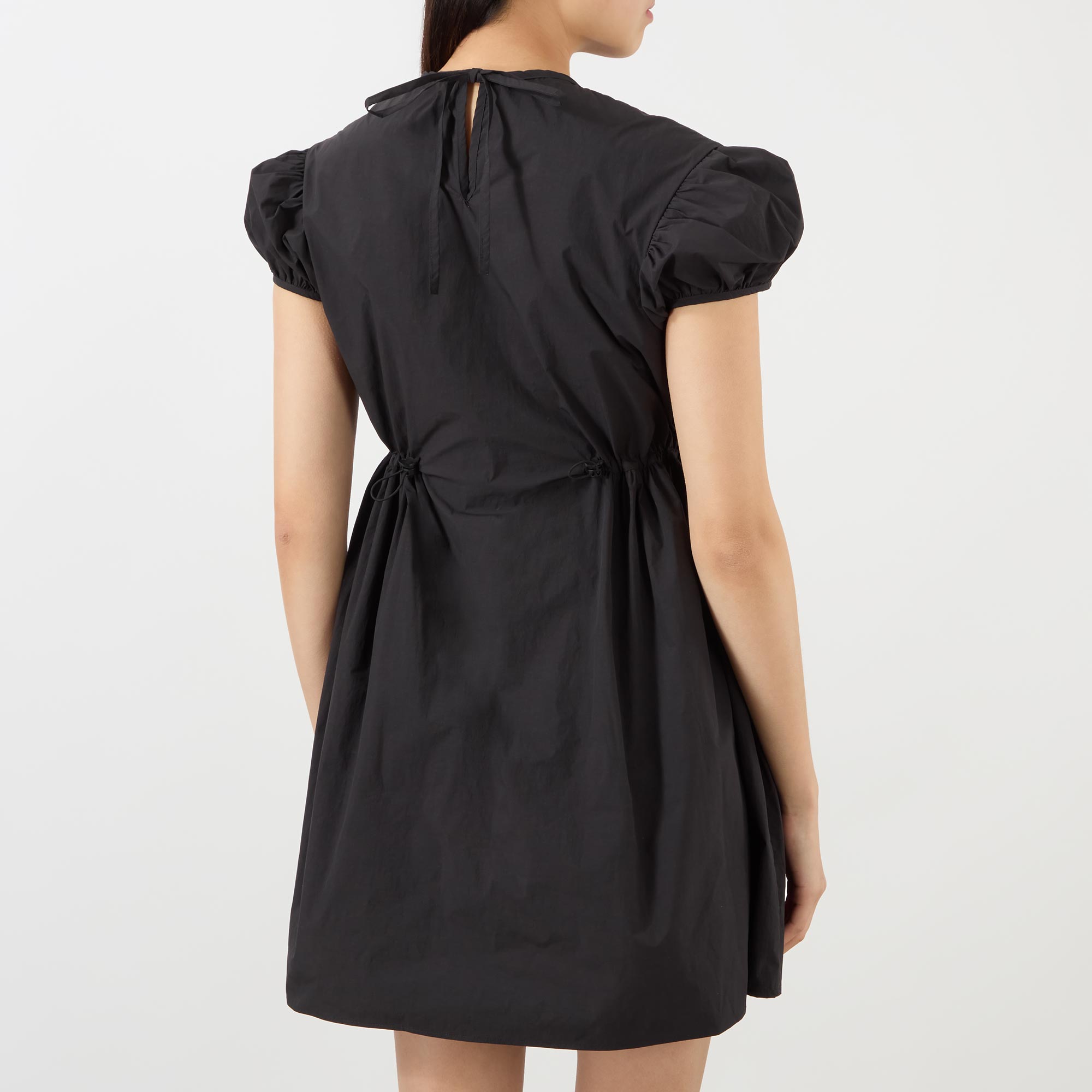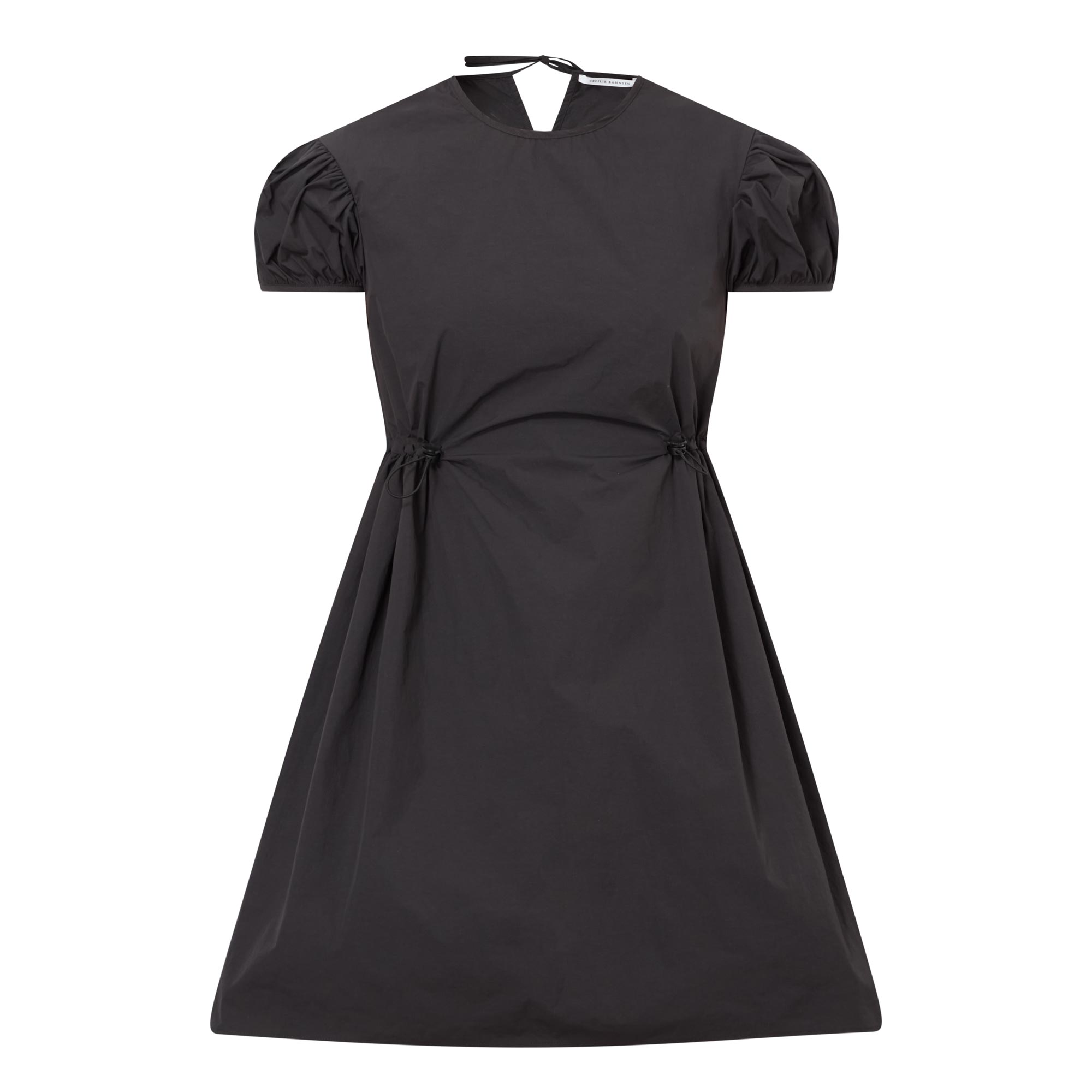 - Short puff sleeves, round neckline, back keyhole and tie-fastening closure, cinched drawcord waist, flared silhouette, mini length
