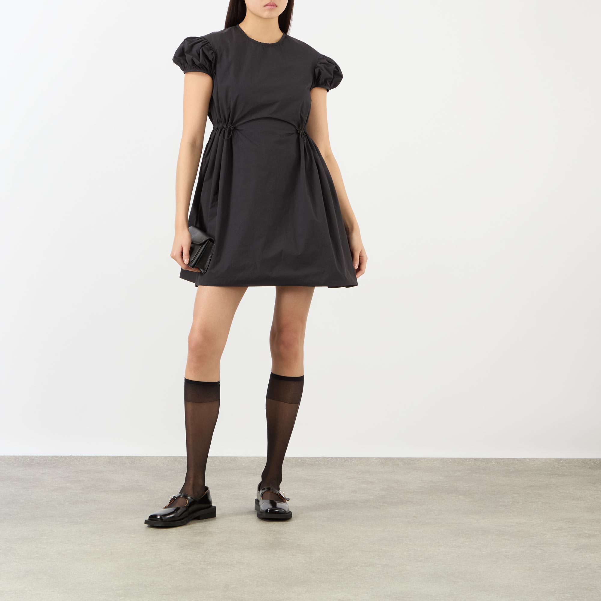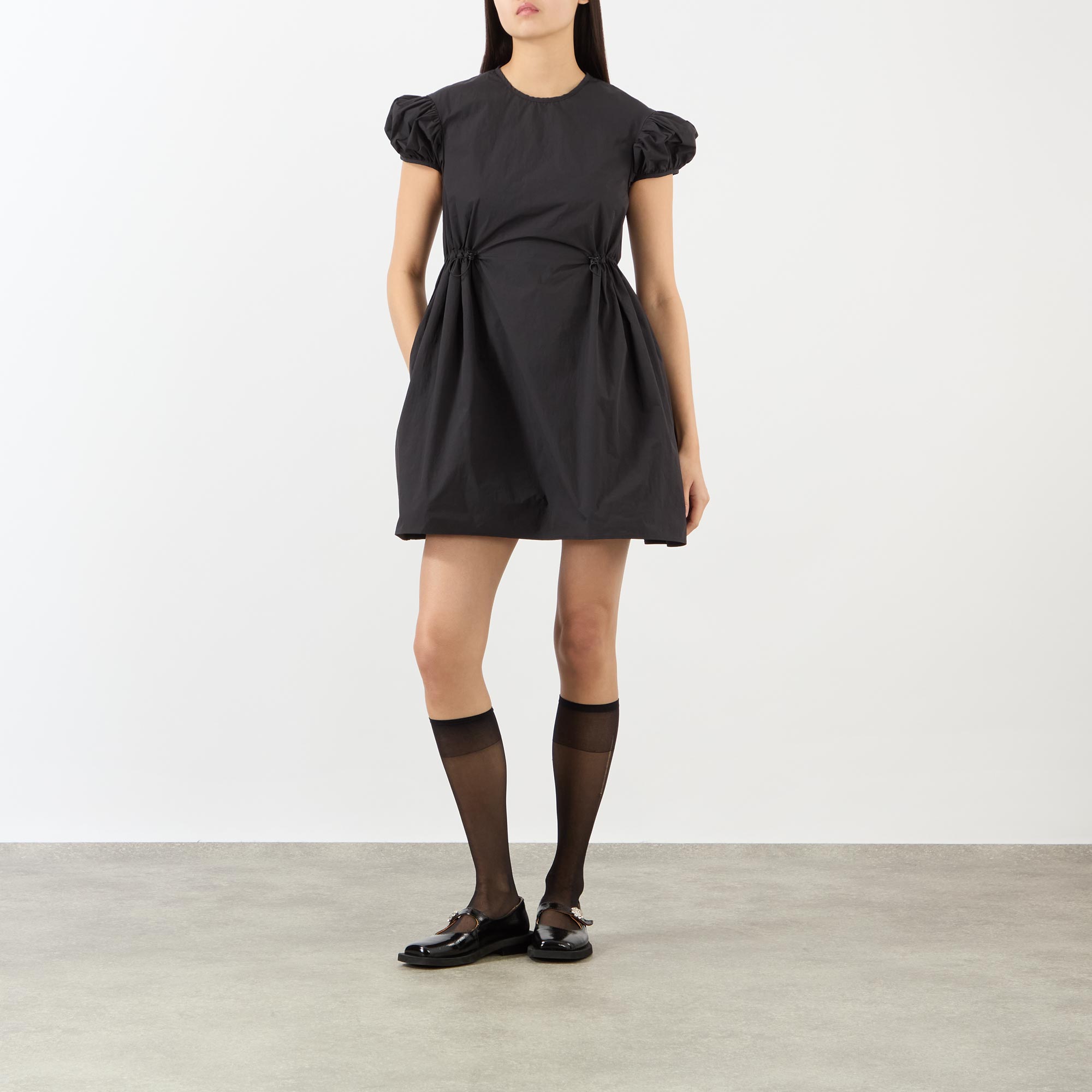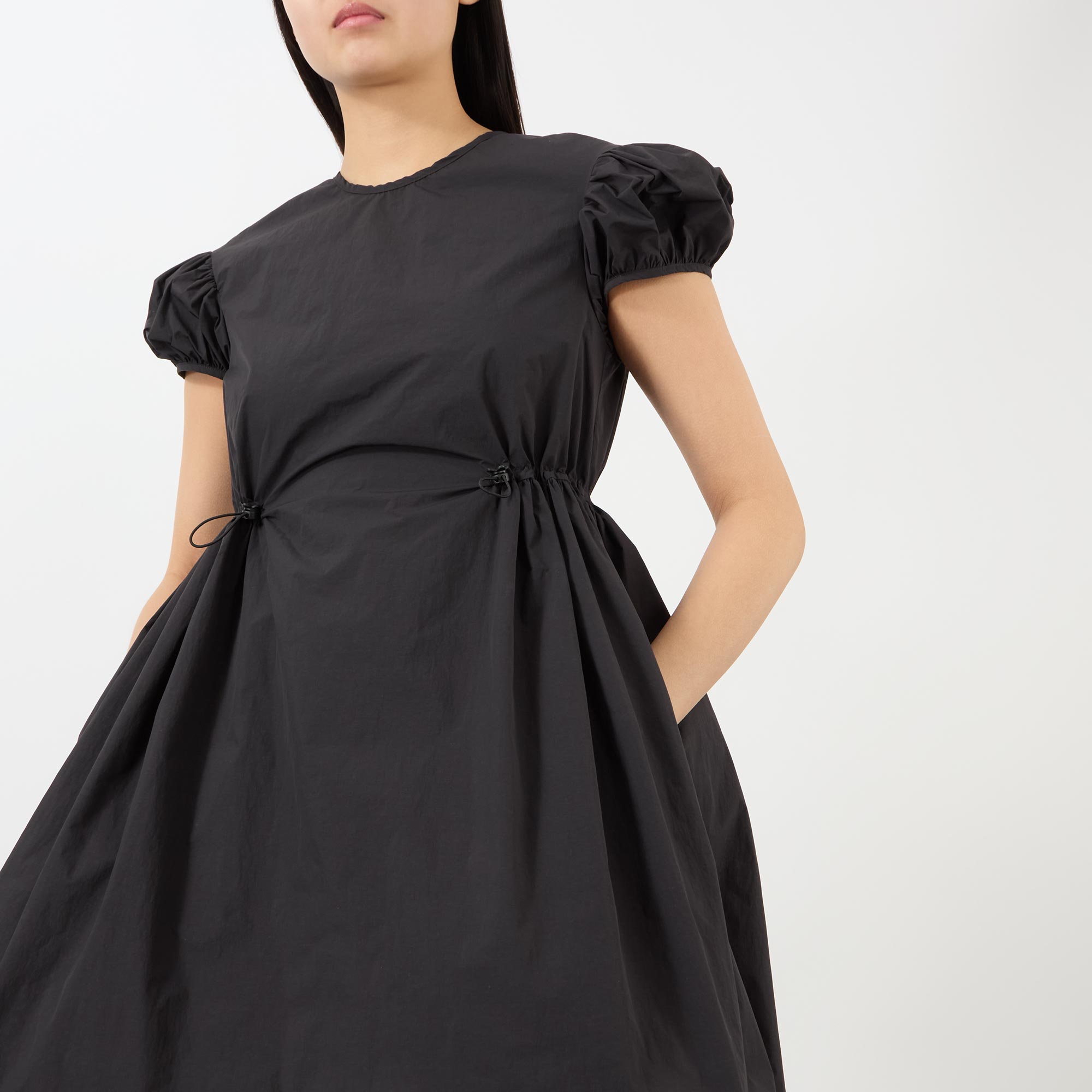 - Short puff sleeves, round neckline, back keyhole and tie-fastening closure, cinched drawcord waist, flared silhouette, mini length