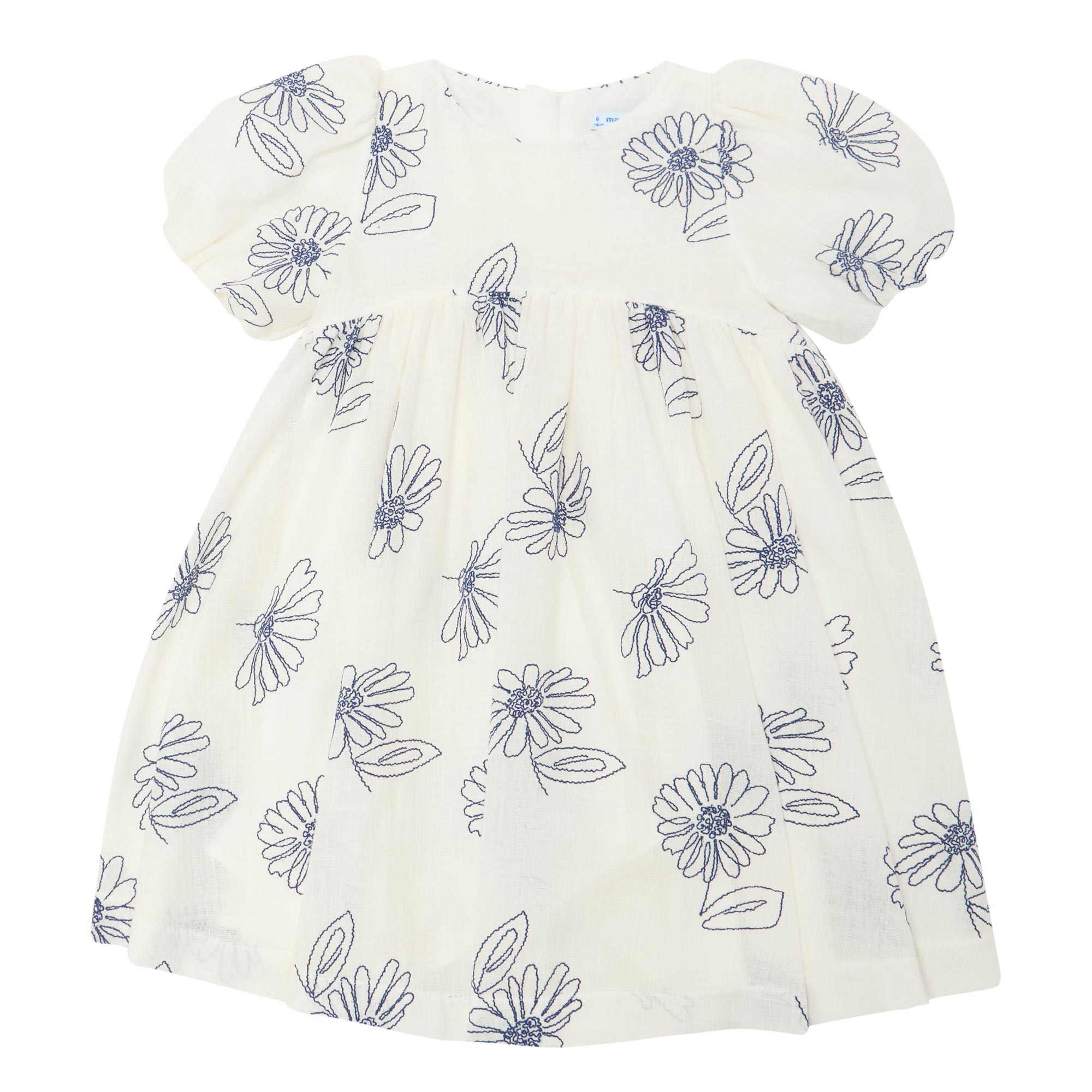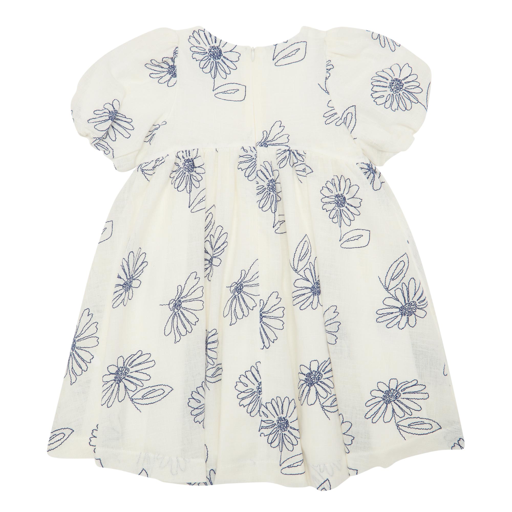 - Round neckline, short sleeves,, rear zip fastening, fitted through the waist, flared skirt, placement floral printed design