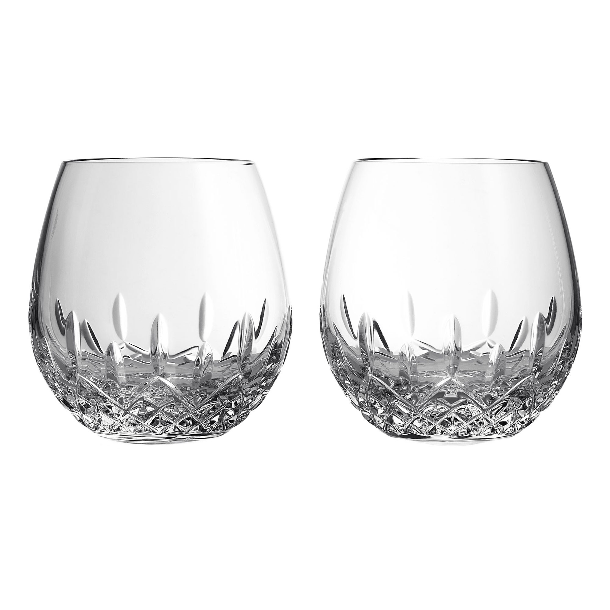 - Lismore pattern, two glasses, diamond/wedge accents, stemless design