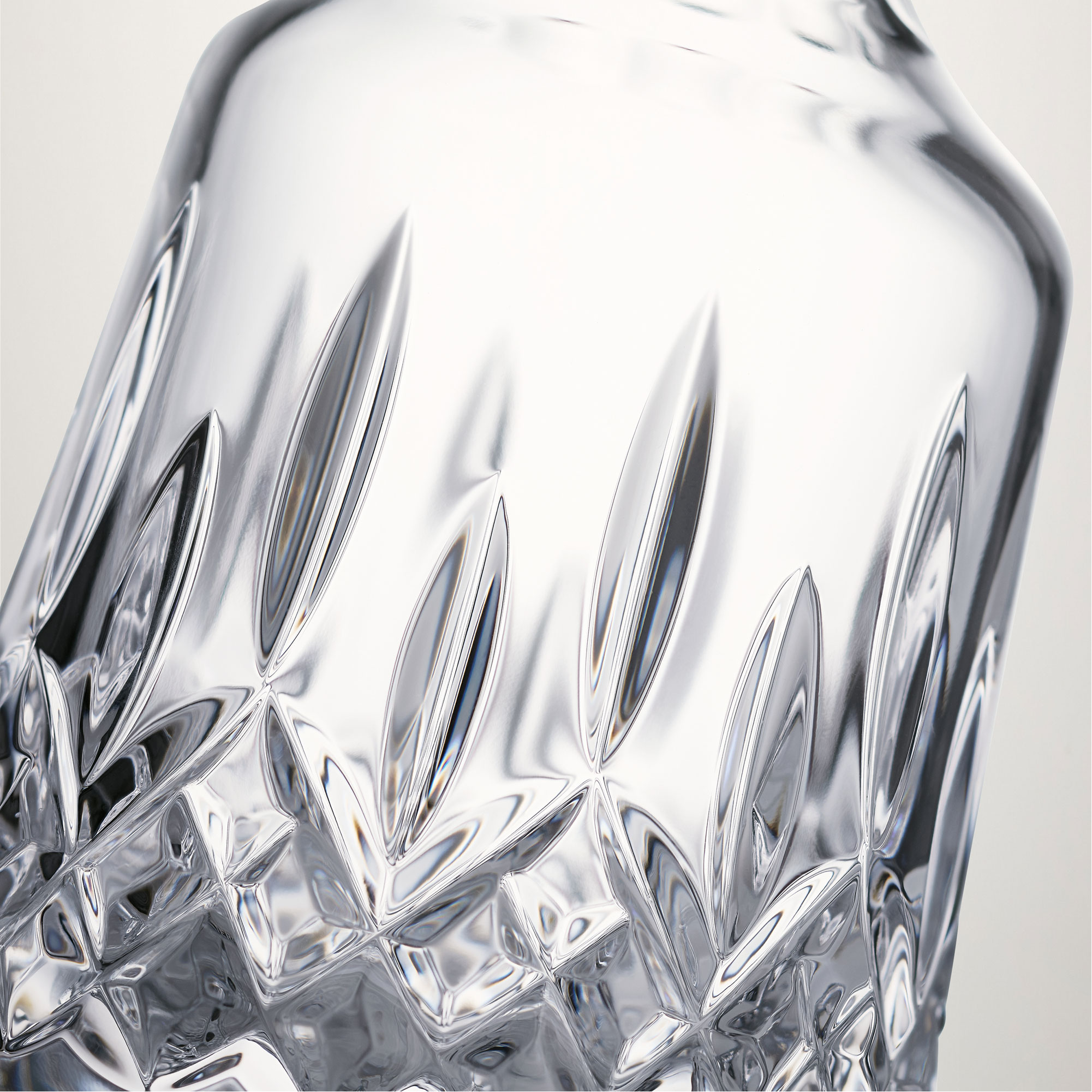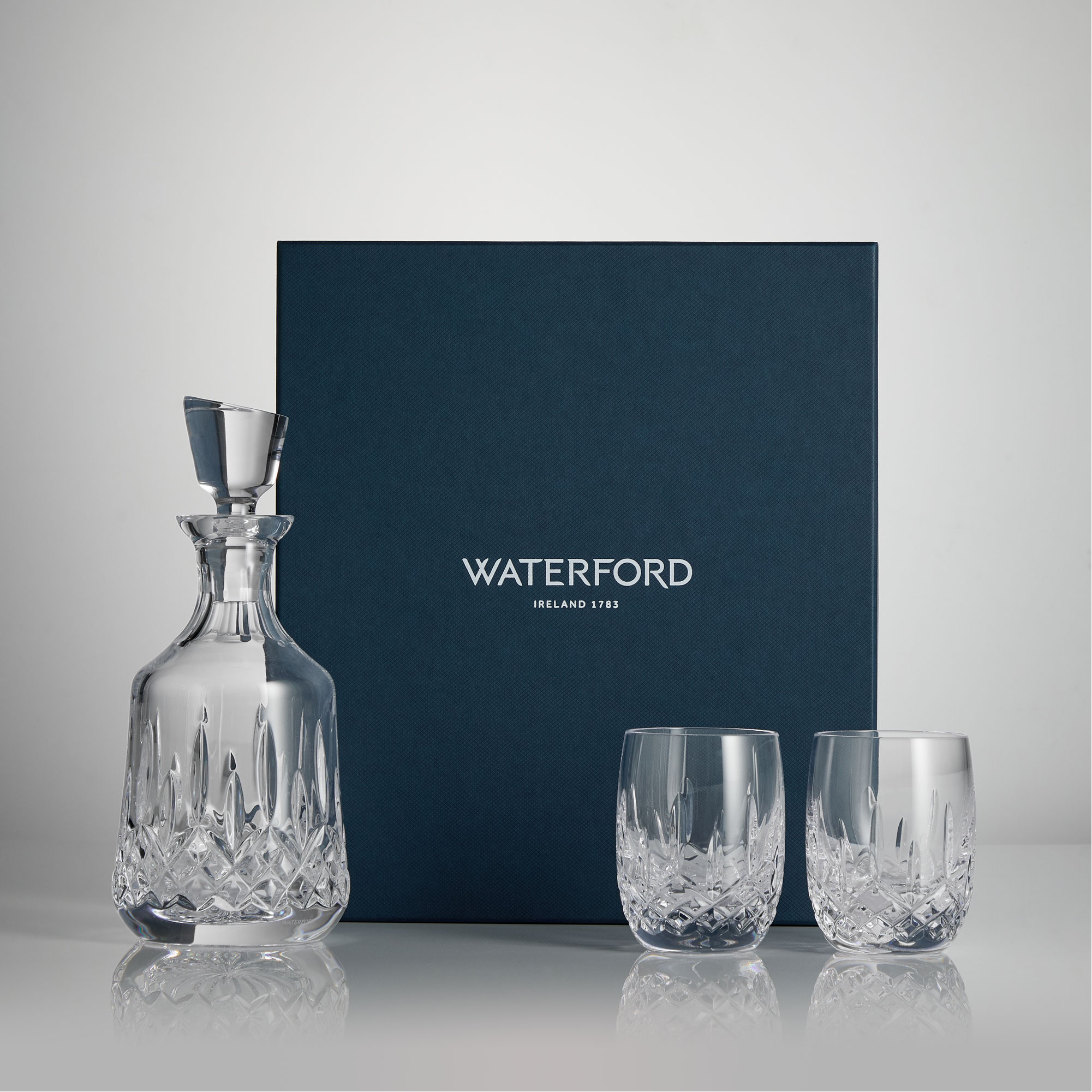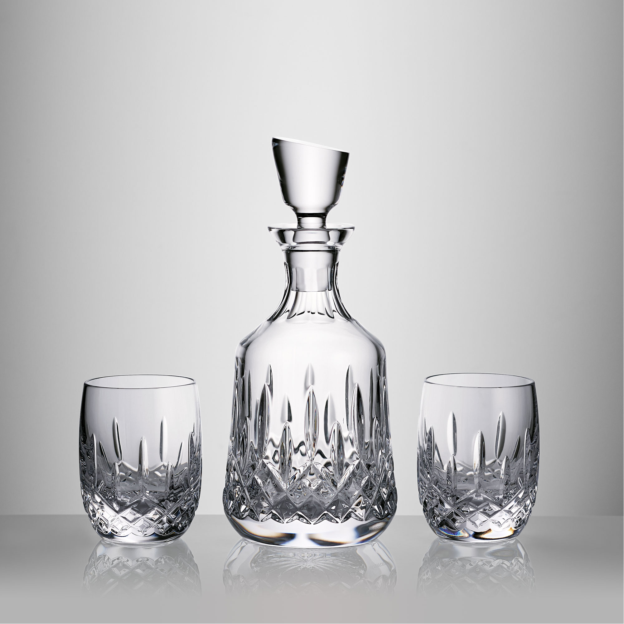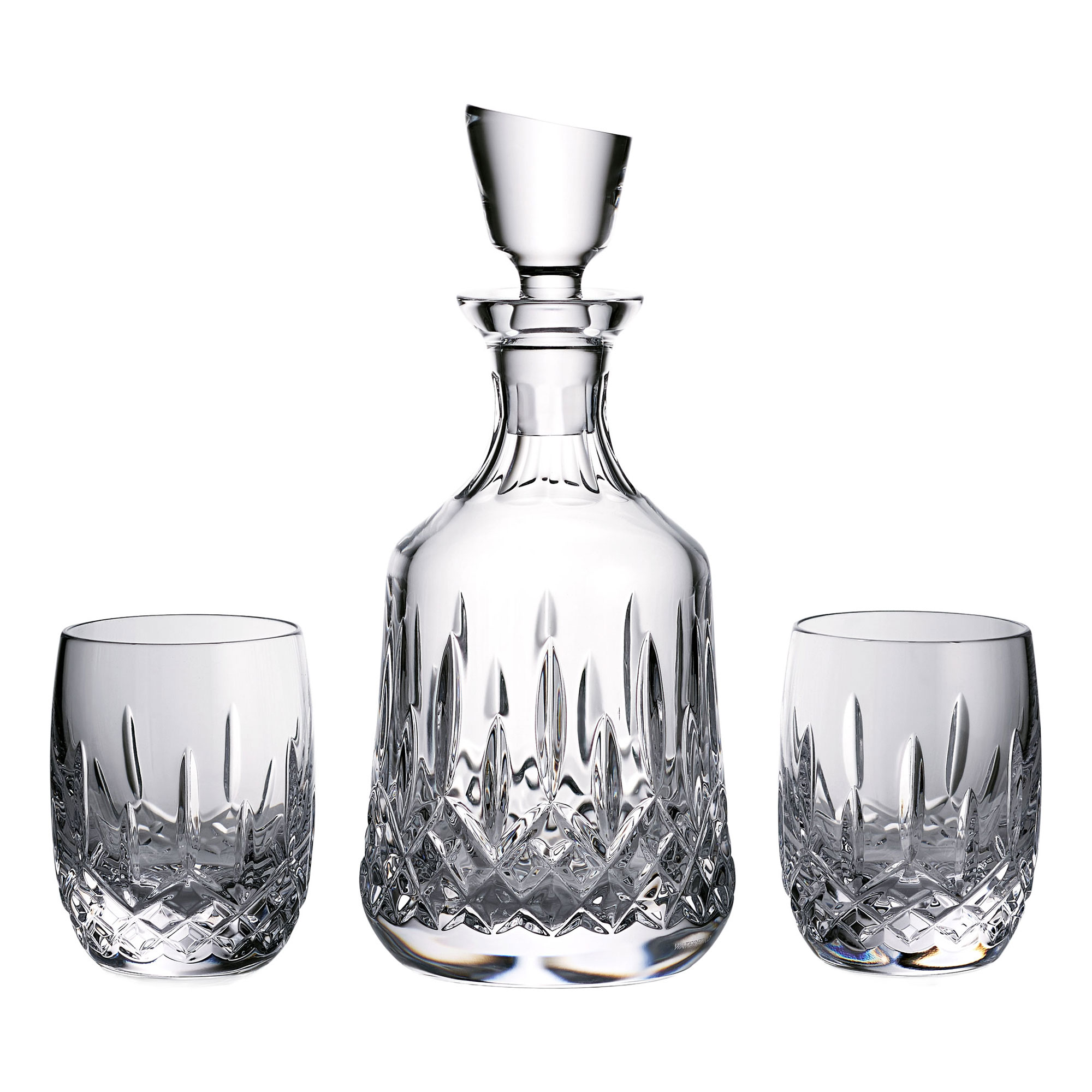 - Lismore pattern, lead-free crystal, hand-finished cuts, one decanter, two tumbler glasses