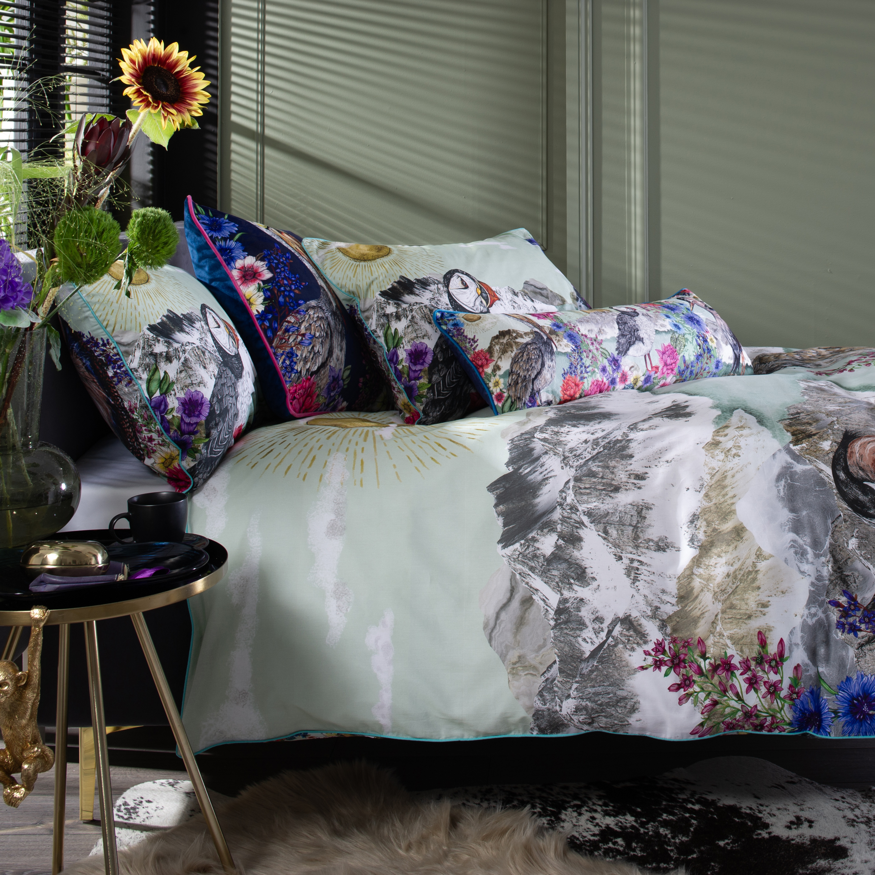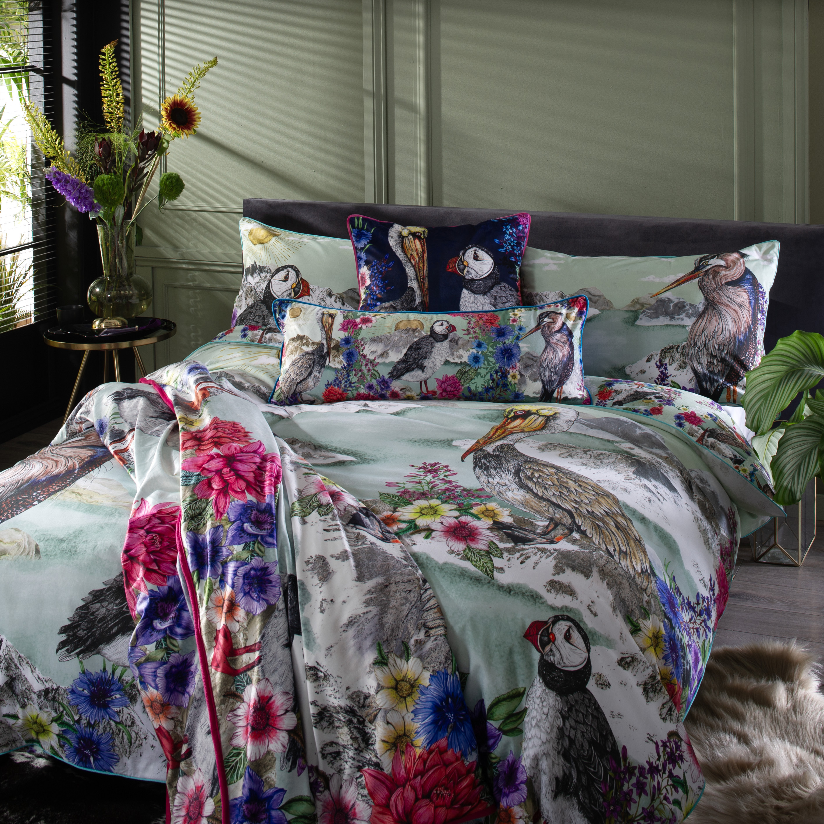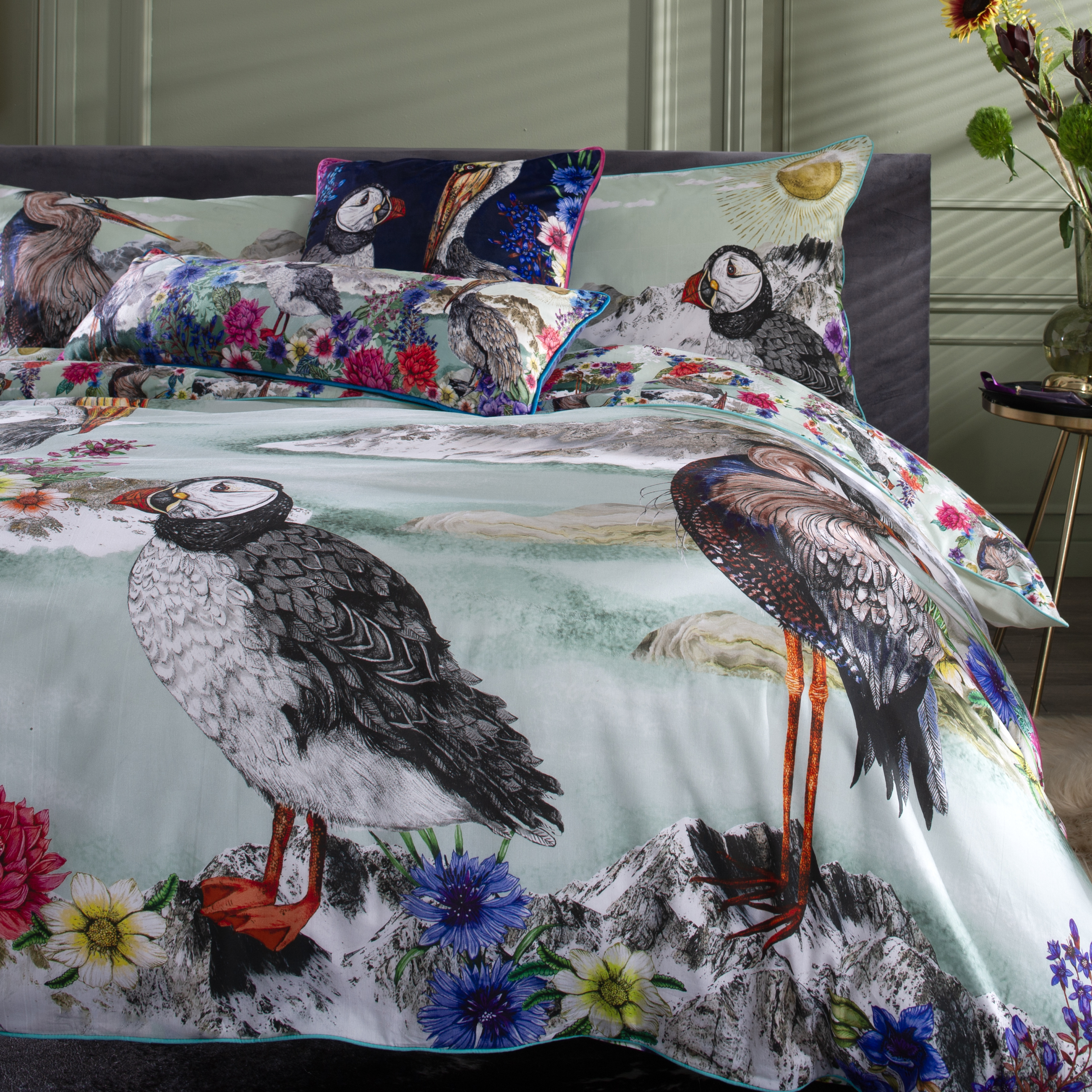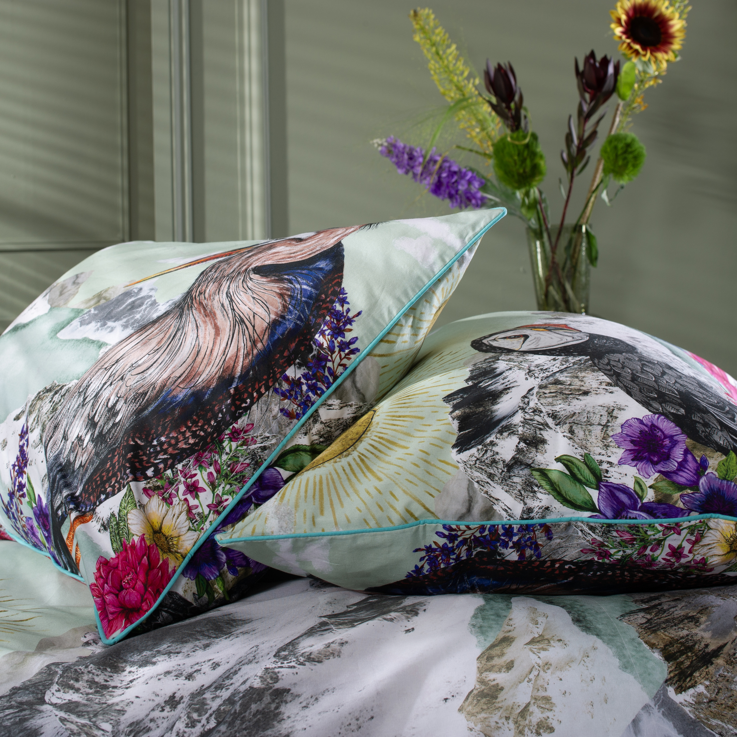 Refresh your bedroom with the intricate design of Mountain Lake bedding. Depicting a floral and puffin design this bedding offers a stunning focal point for your room. Made from 200tc digitally printed 100% pure cotton. Available in double, king and super king with co-ordinating accessories