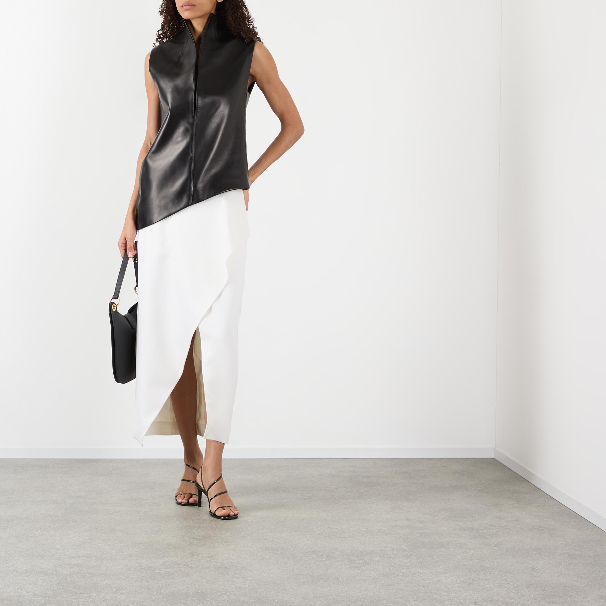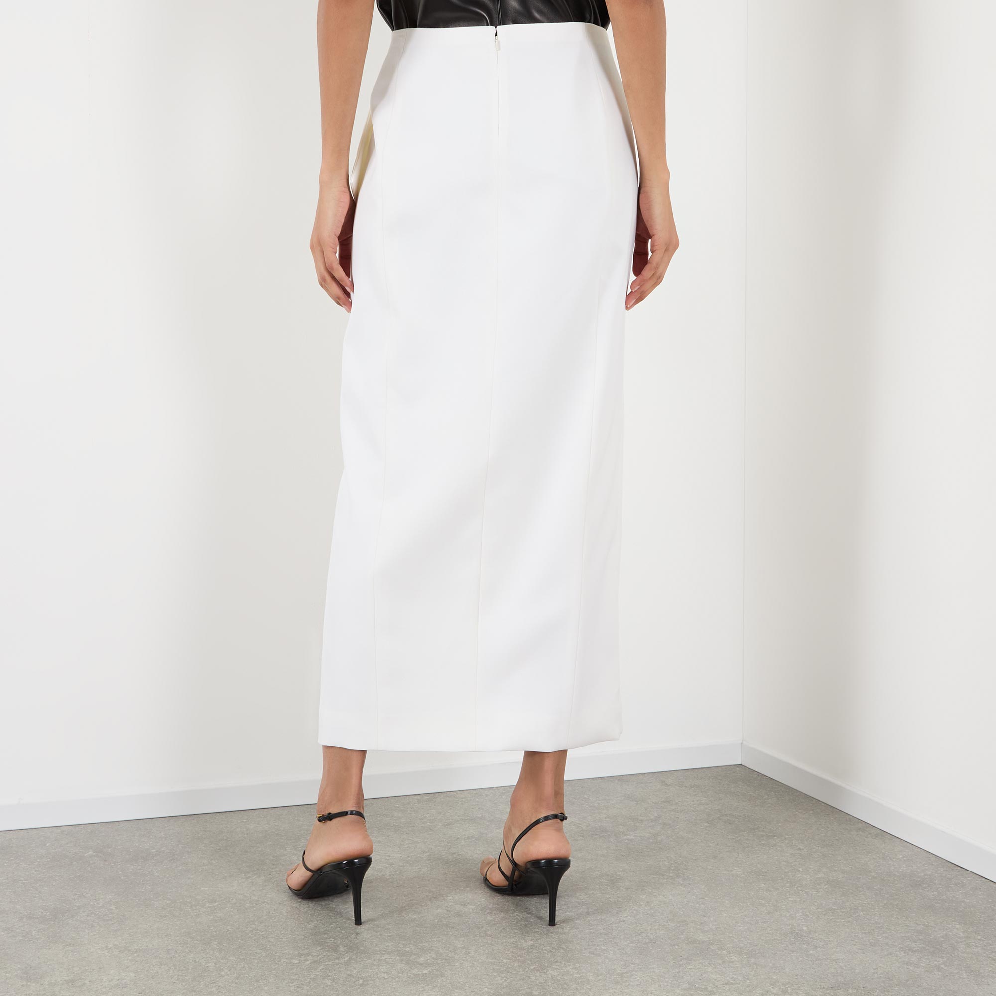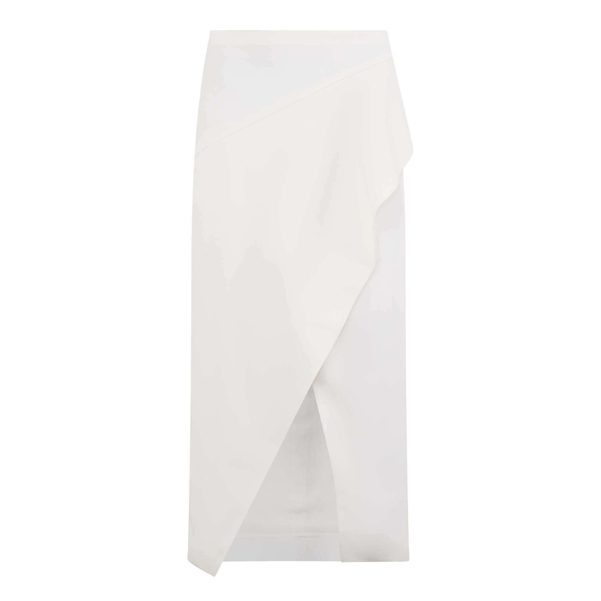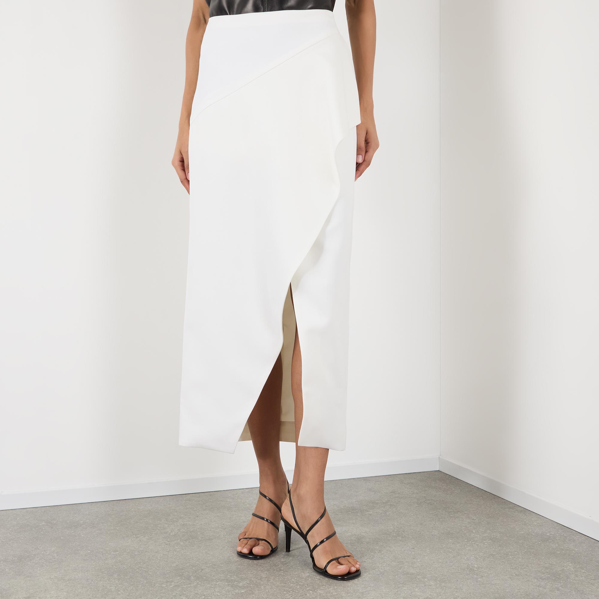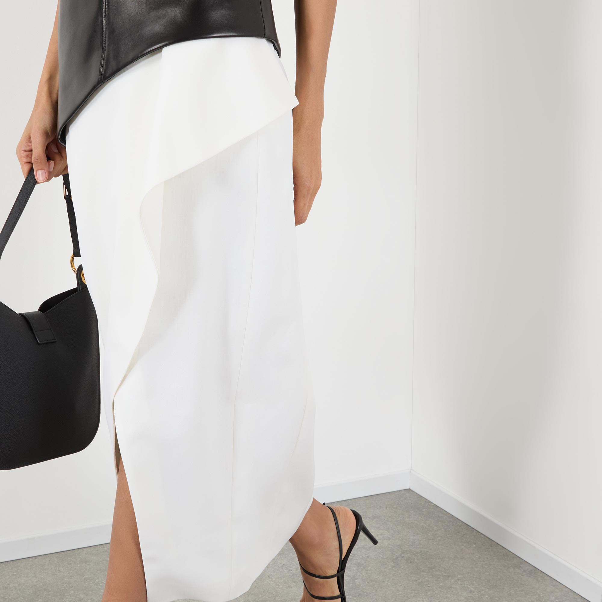 - High rise, rear zip fastening, draped panel detailing, bias cut, asymmetric hem, midi length, smooth finish