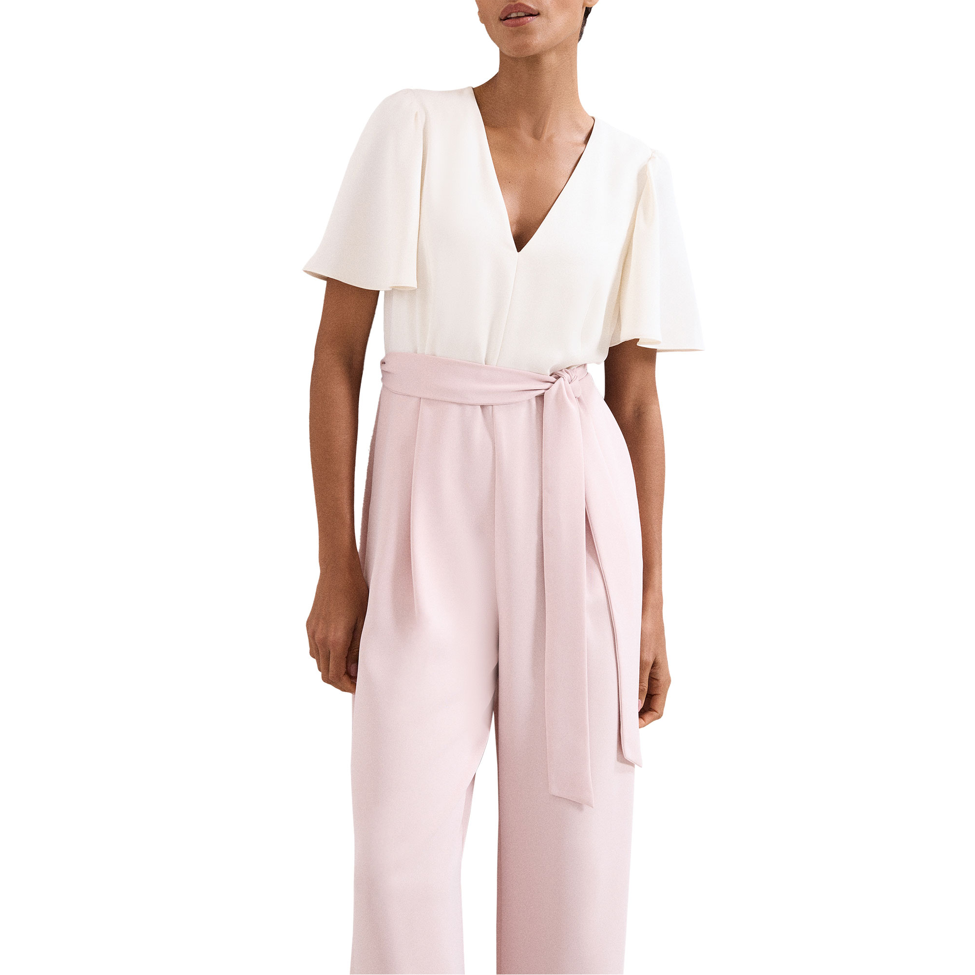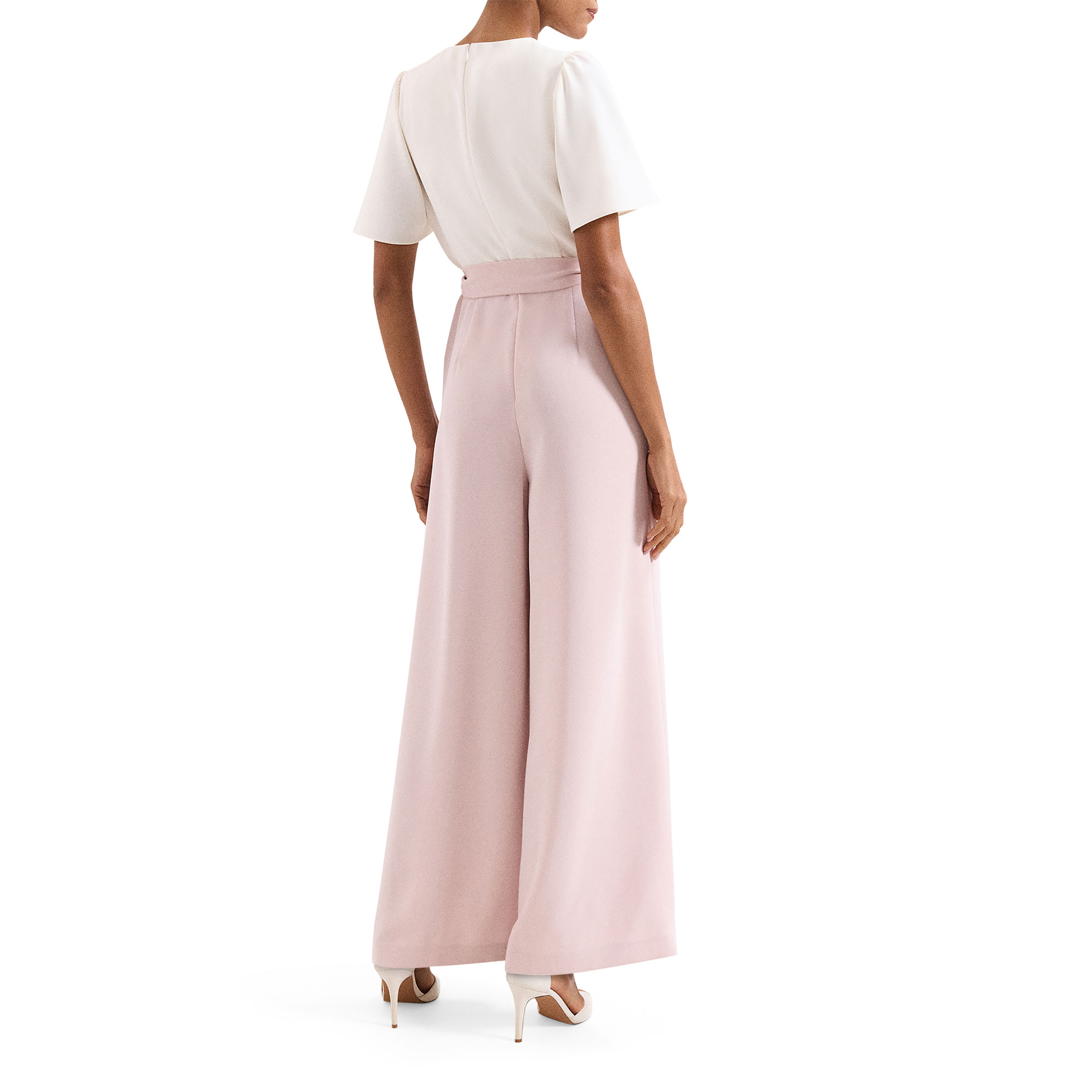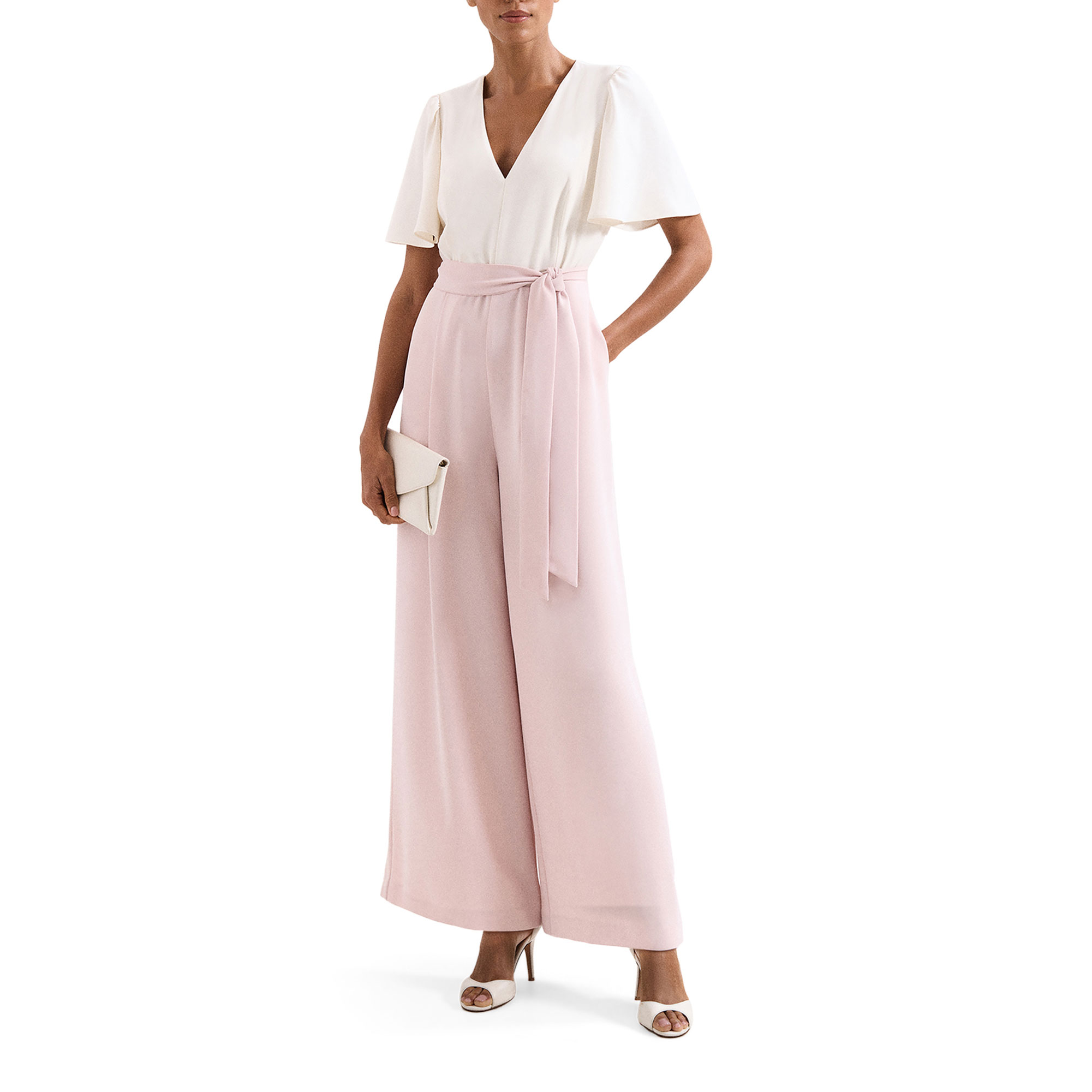 - Wide leg silhouette, V-neckline, frill details, matching tie waist belt, short sleeves, concealed zip fastening