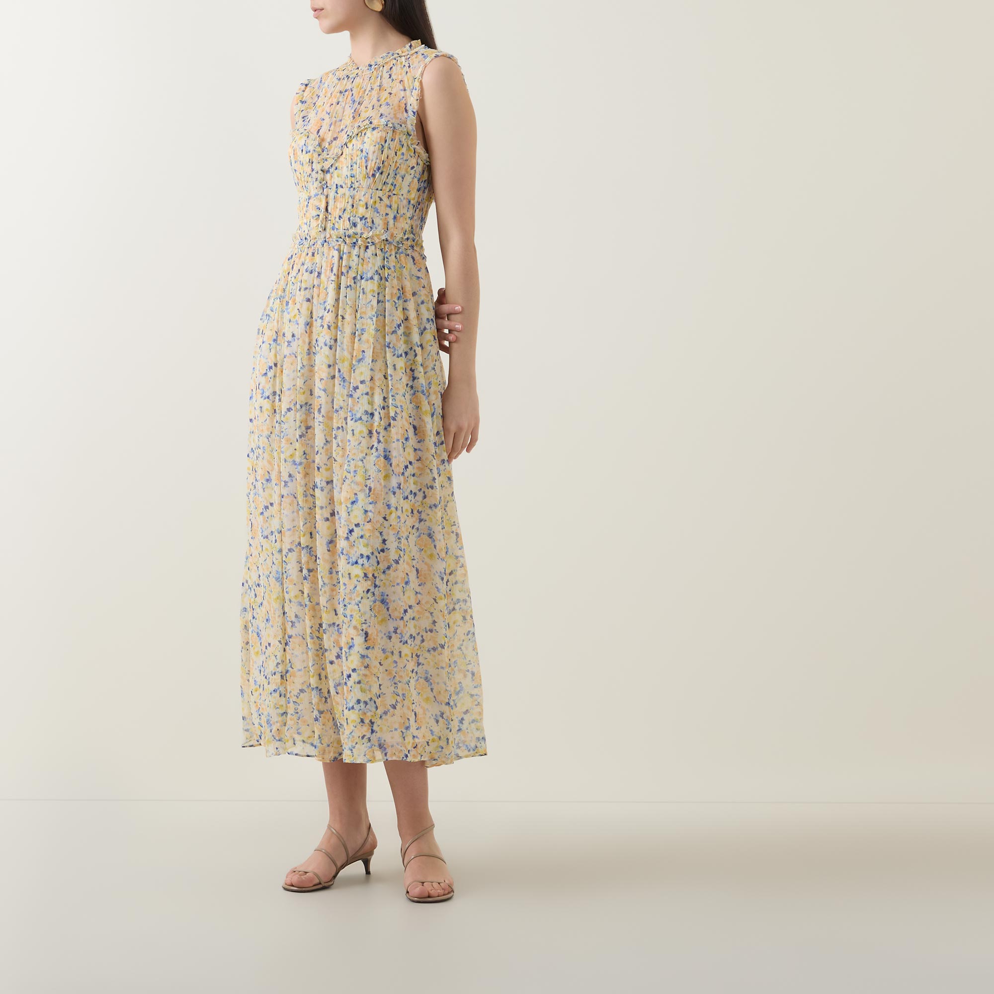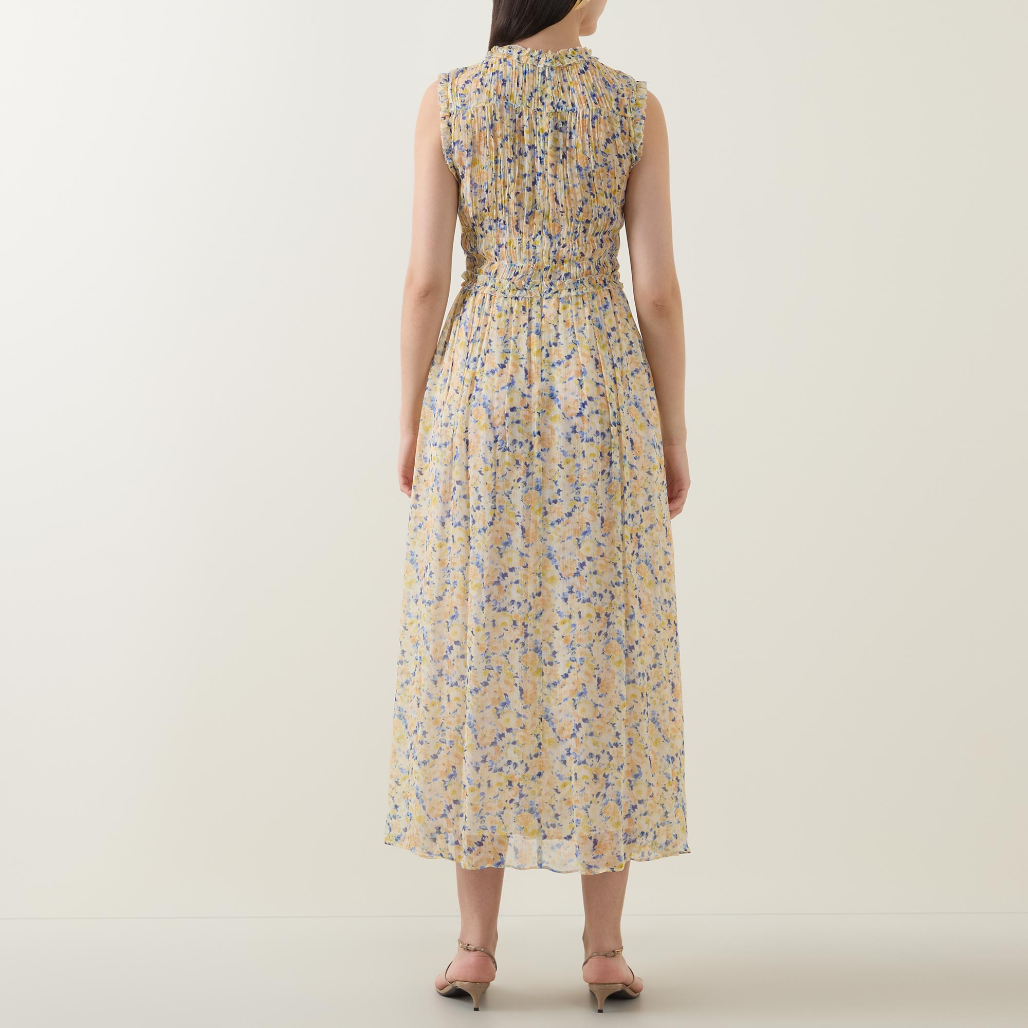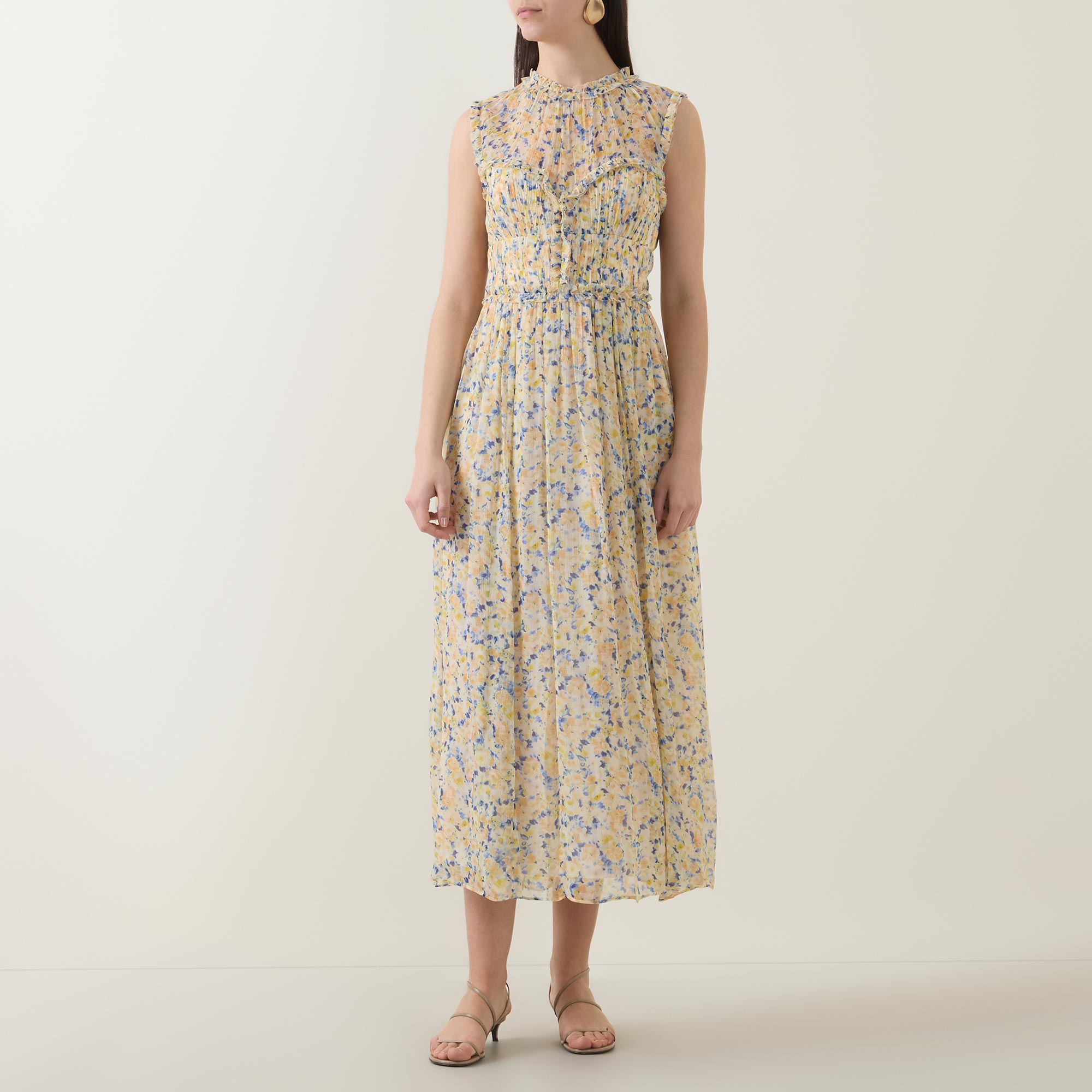 - Sleeveless, round neck, elasticated back waist, concealed zip back fastening, midi length, floral print, wispy ruffle detail