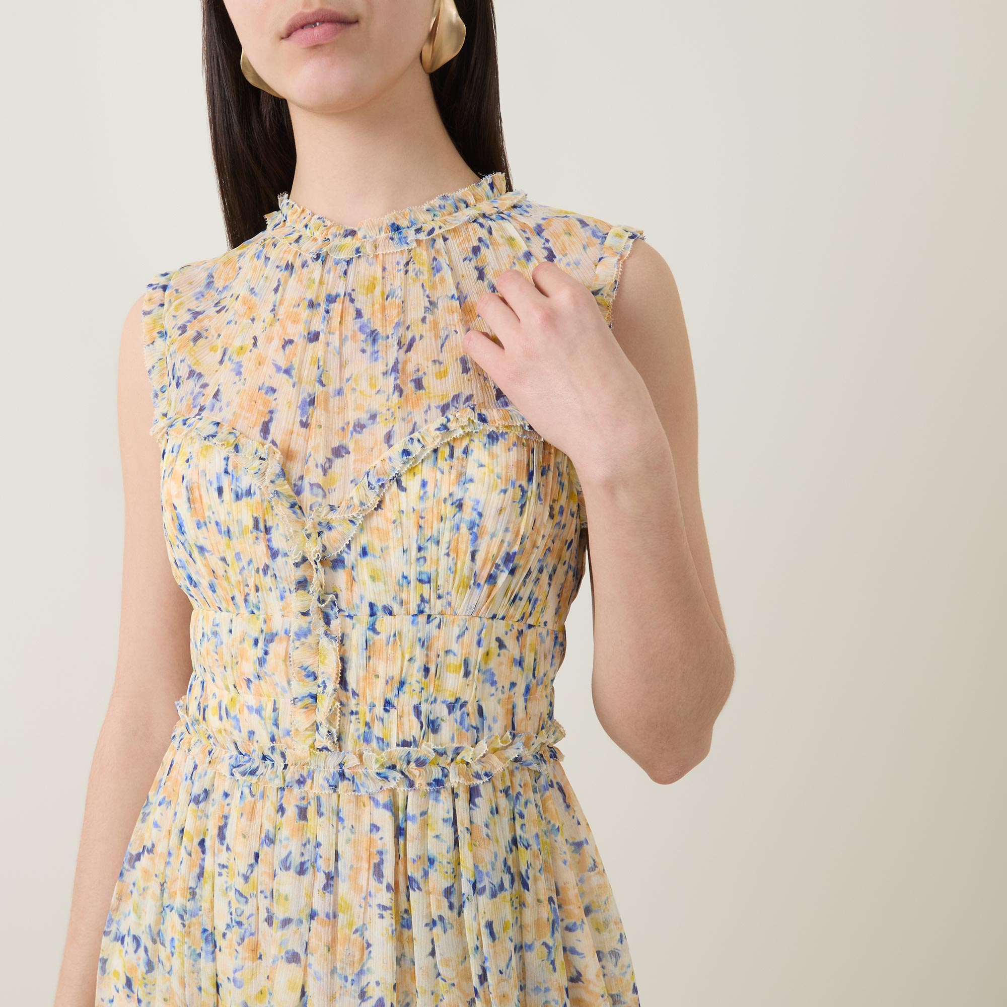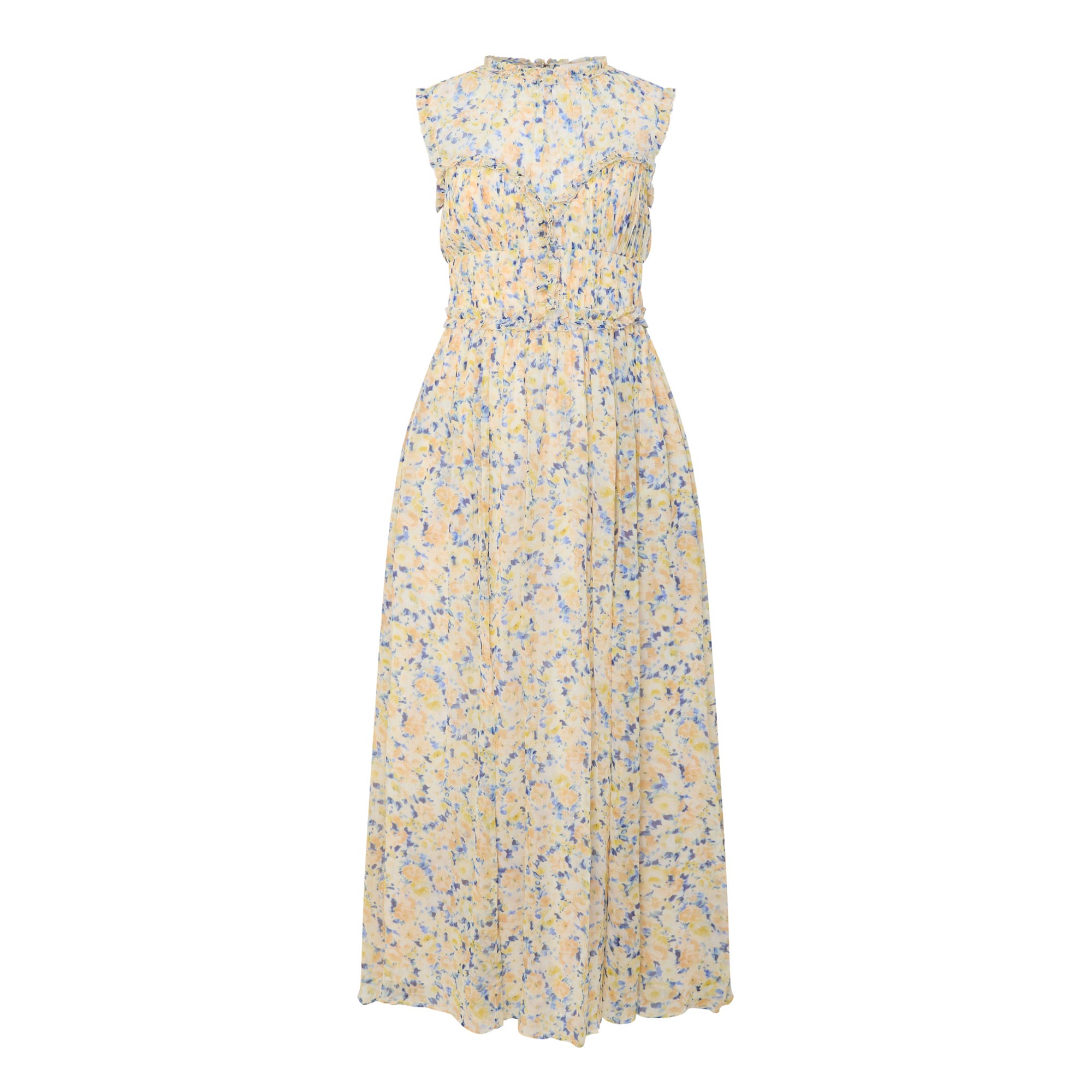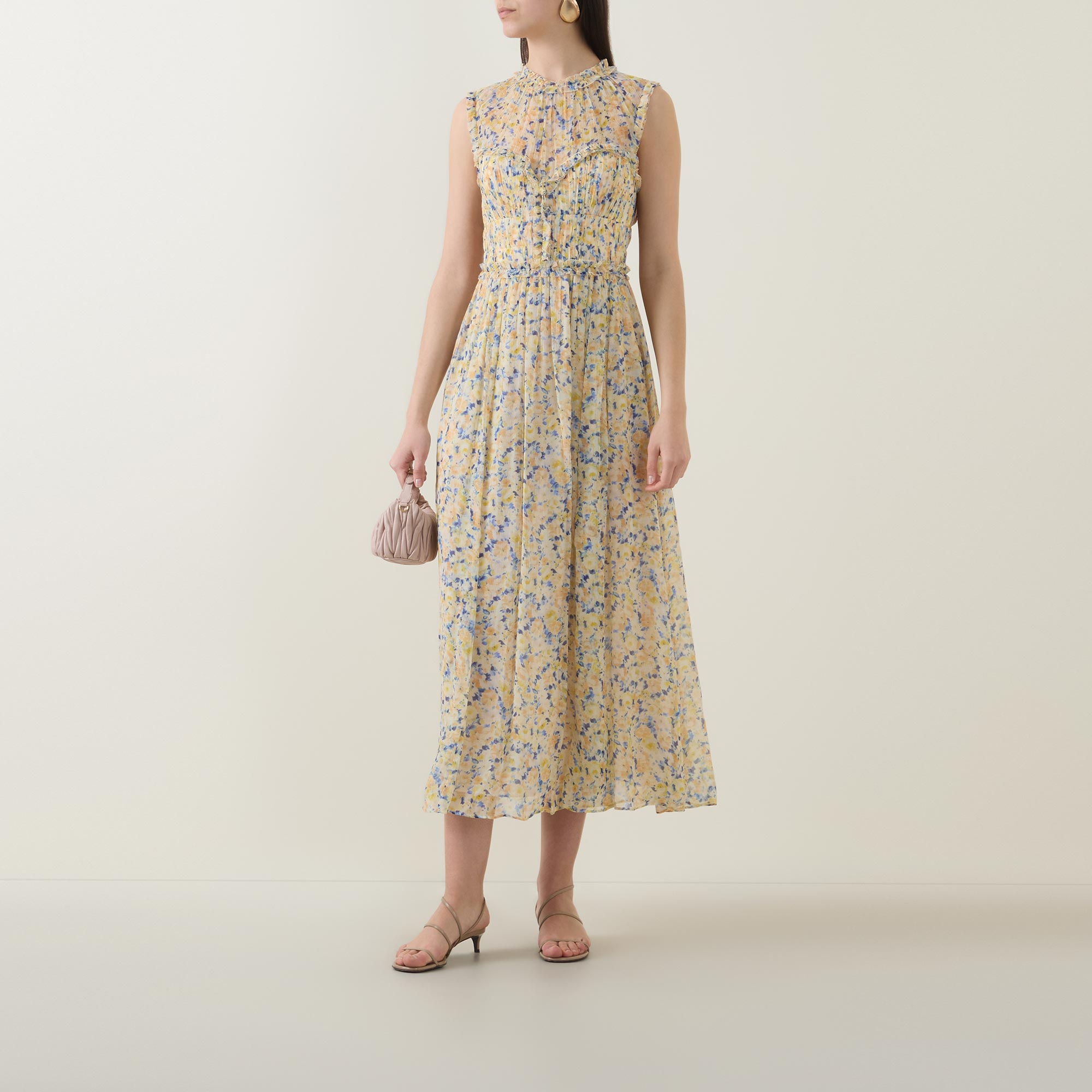 - Sleeveless, round neck, elasticated back waist, concealed zip back fastening, midi length, floral print, wispy ruffle detail