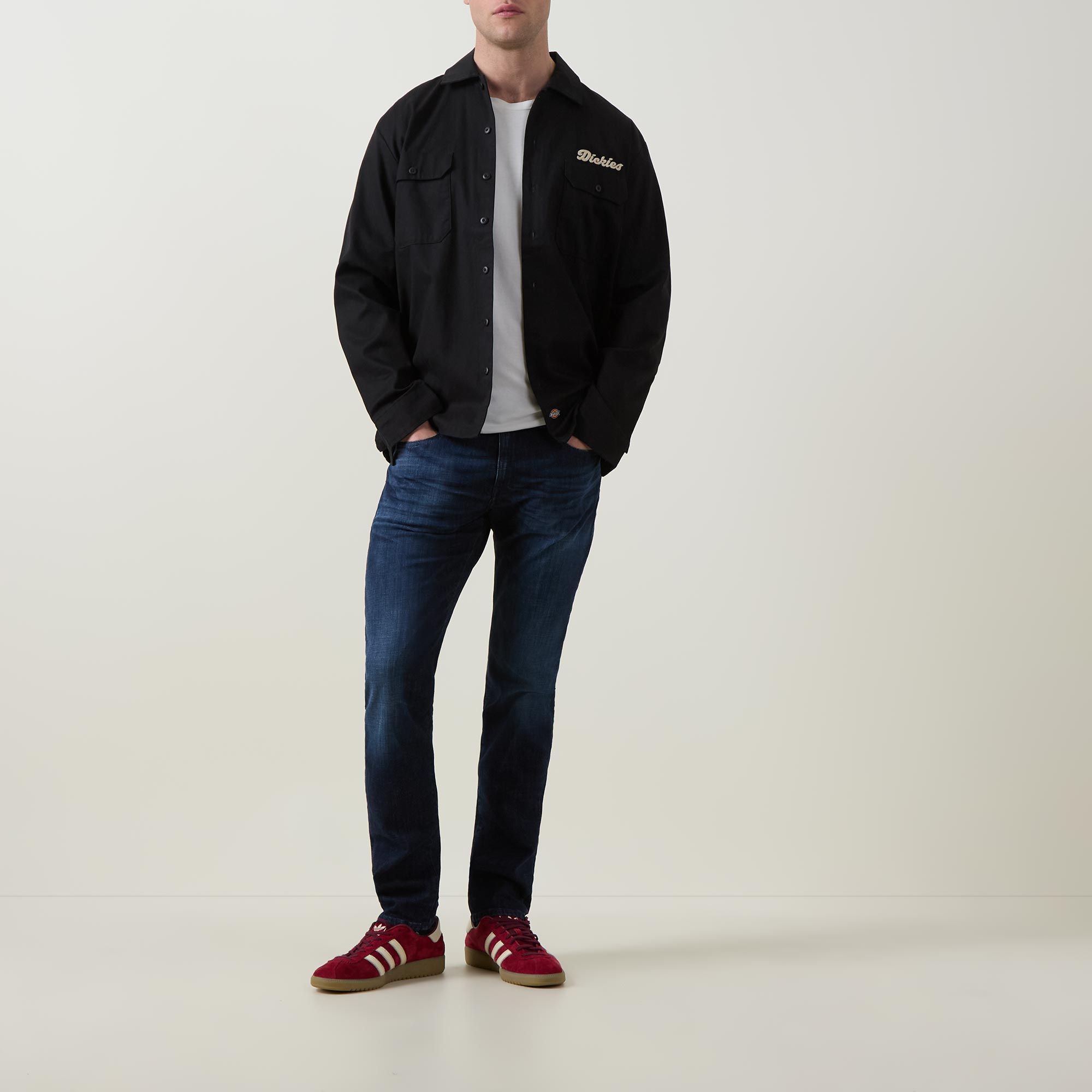 - Mid rise, slim leg, zip fly and button fastening, belt loops, five-pocket design, contrast top stitching, rear logo patch, whiskering and faded patches, dark wash denim finish
