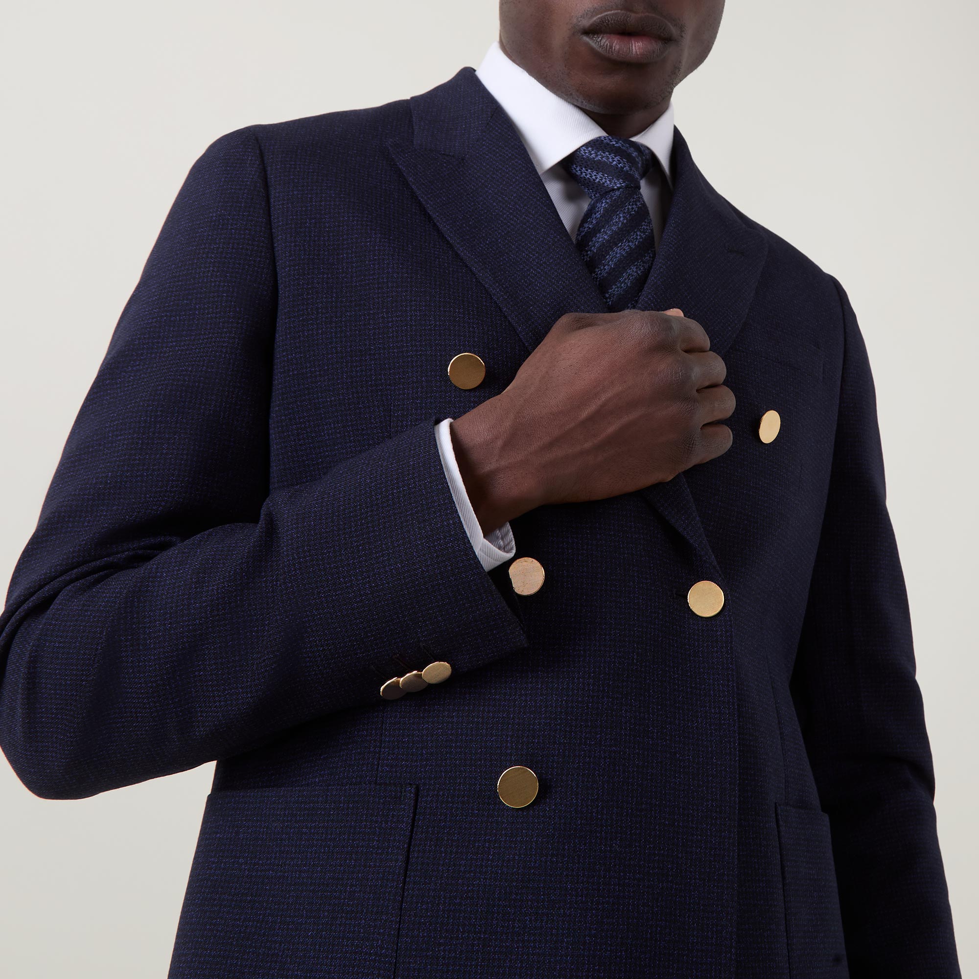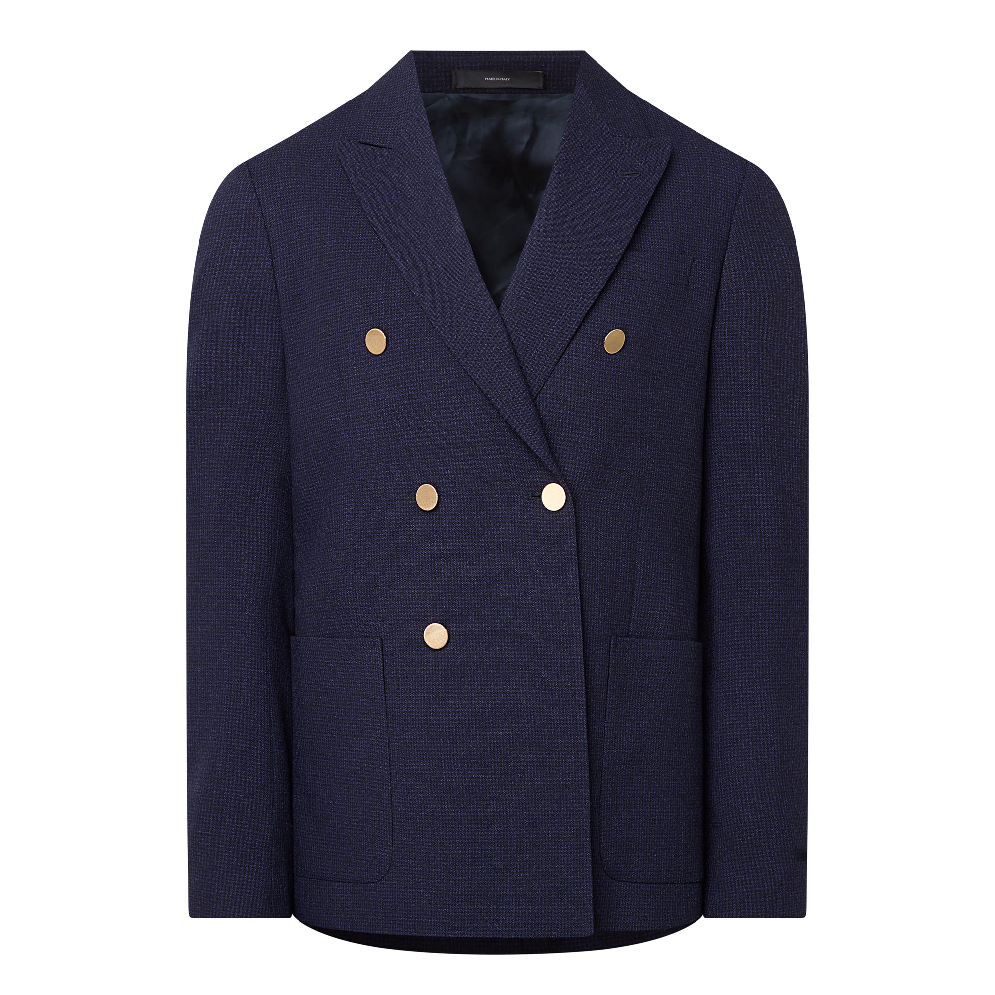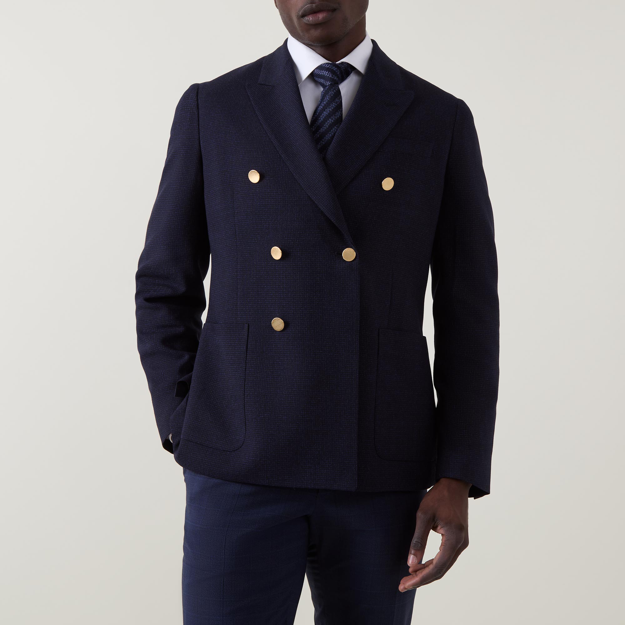 • Double-breasted, peak lapels, patch pockets, gold-tone button fastening, buttoned cuffs, double-vented, two-ply check wool fabric
