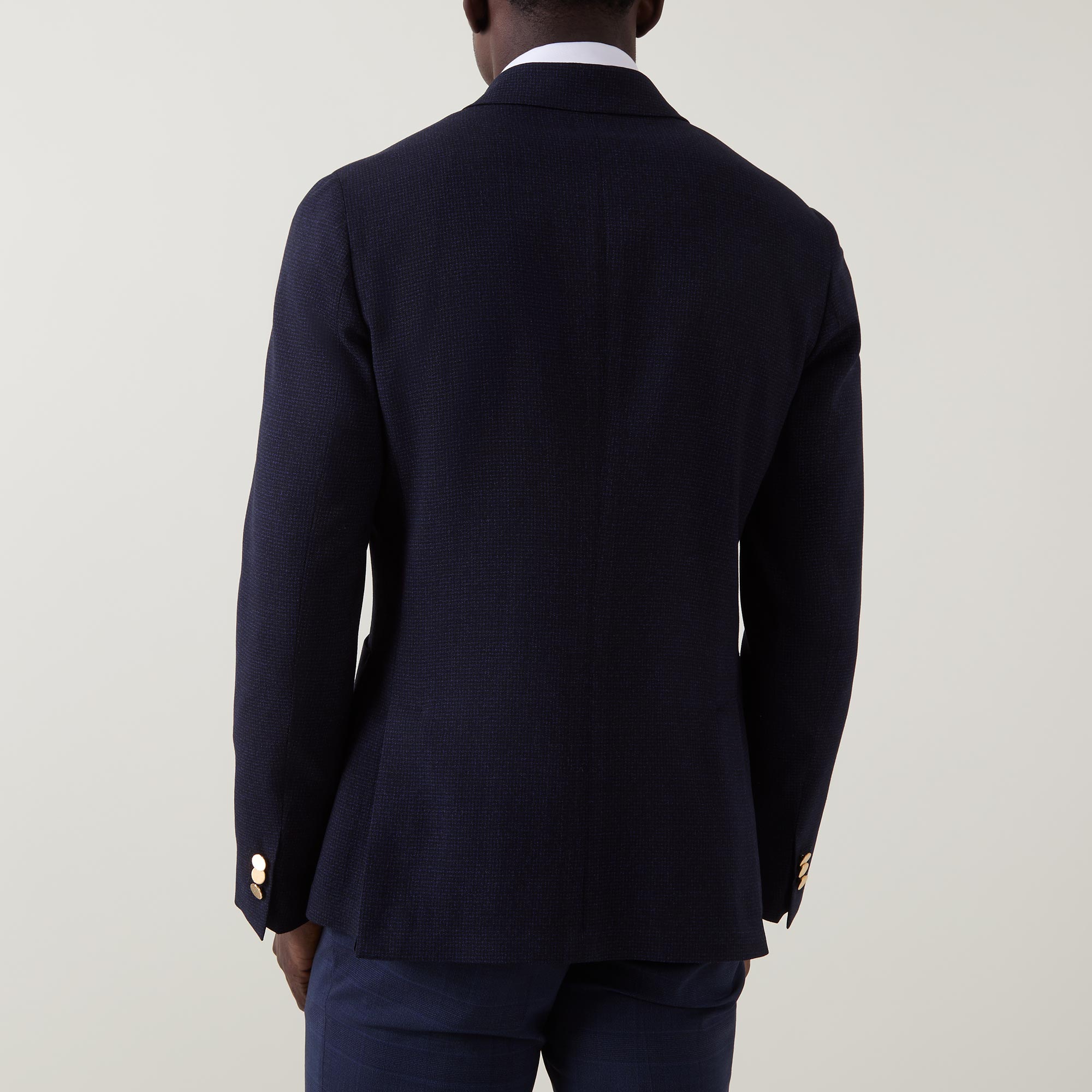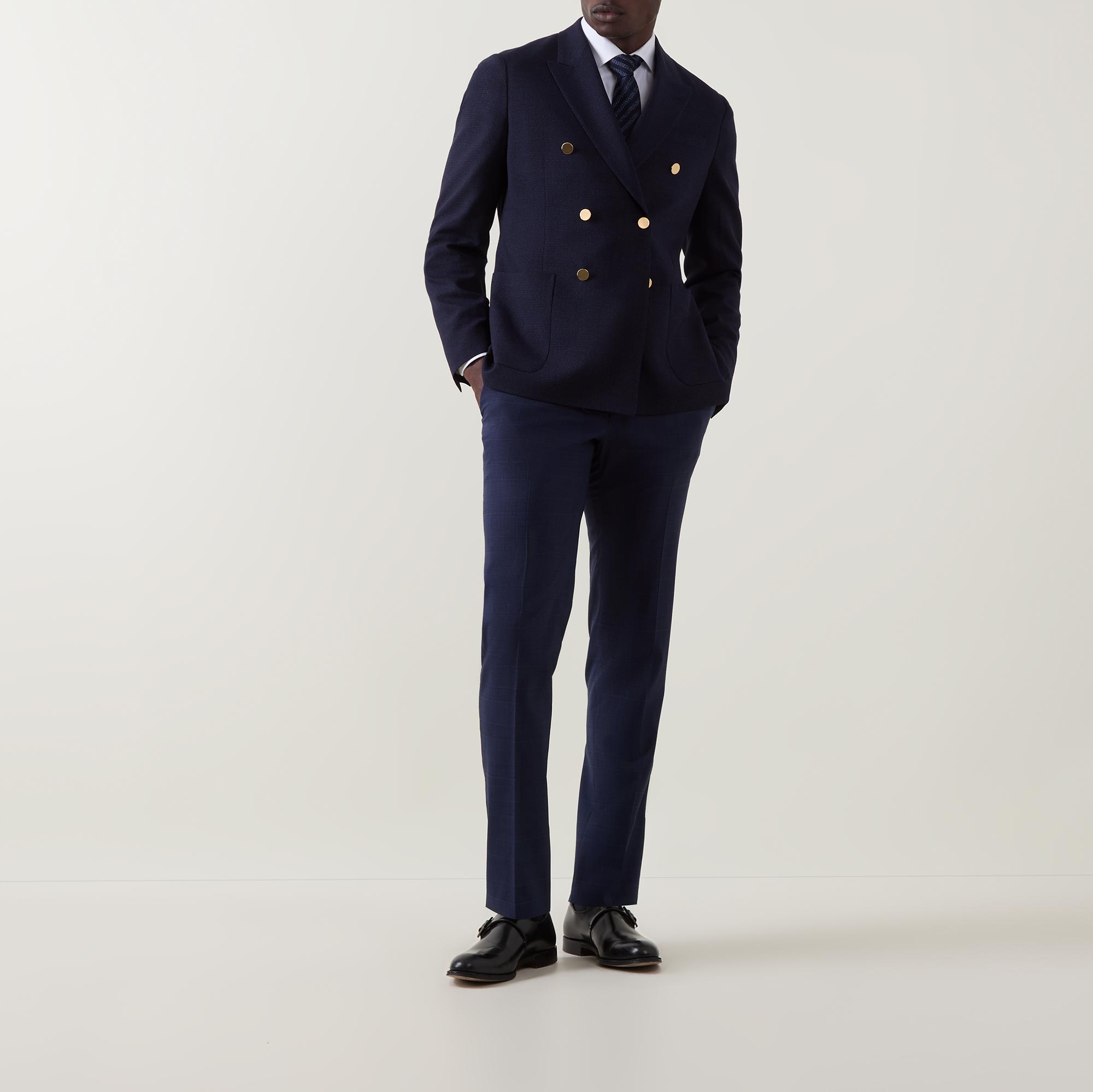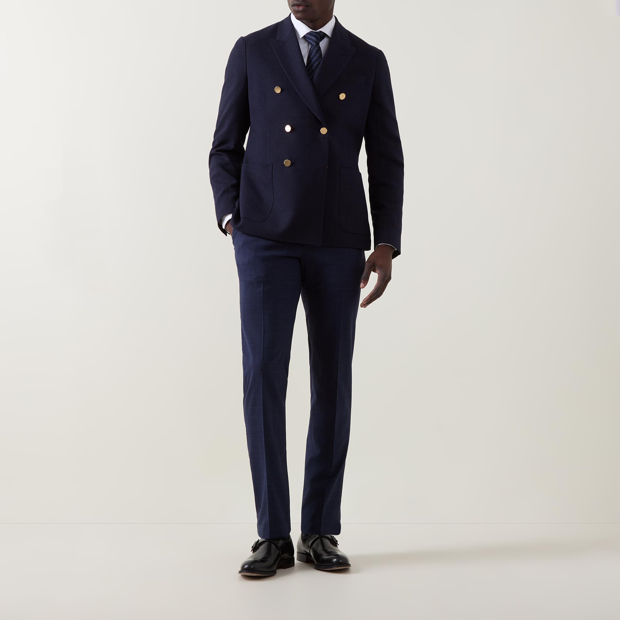 • Double-breasted, peak lapels, patch pockets, gold-tone button fastening, buttoned cuffs, double-vented, two-ply check wool fabric
