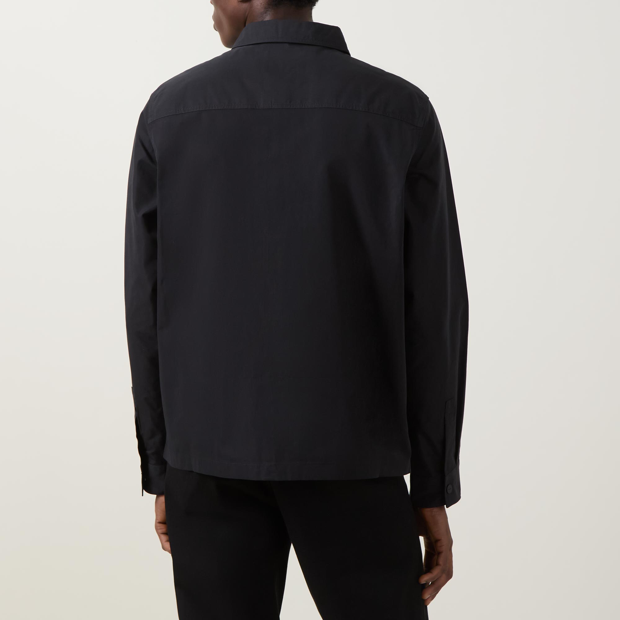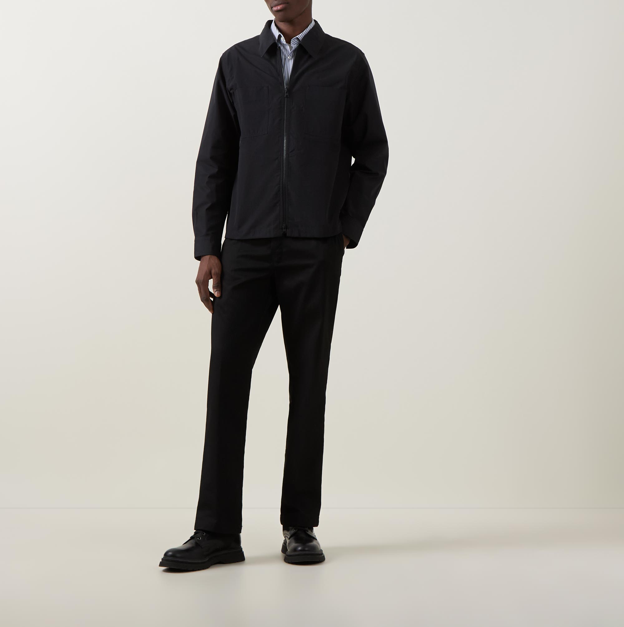 - Point collar, long sleeves, buttoned cuffs, two chest patch pockets, two-way front zip placket, straight hem, logo badge