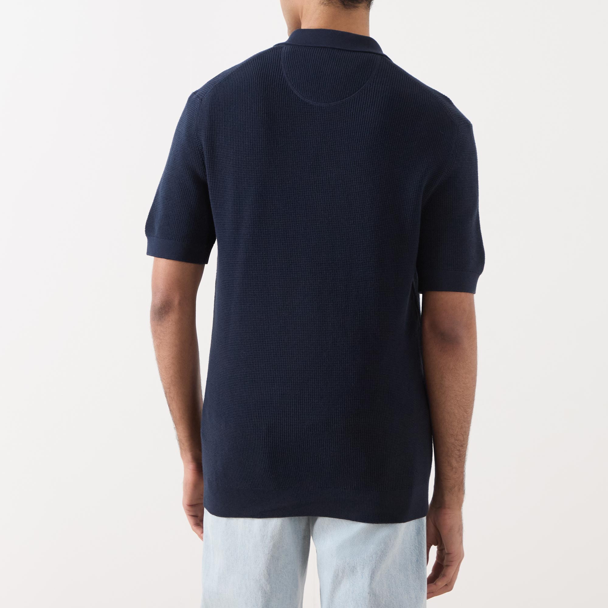- Flat knit collar and cuffs, short sleeves, button fastening, ribbed trims, shield logo detail