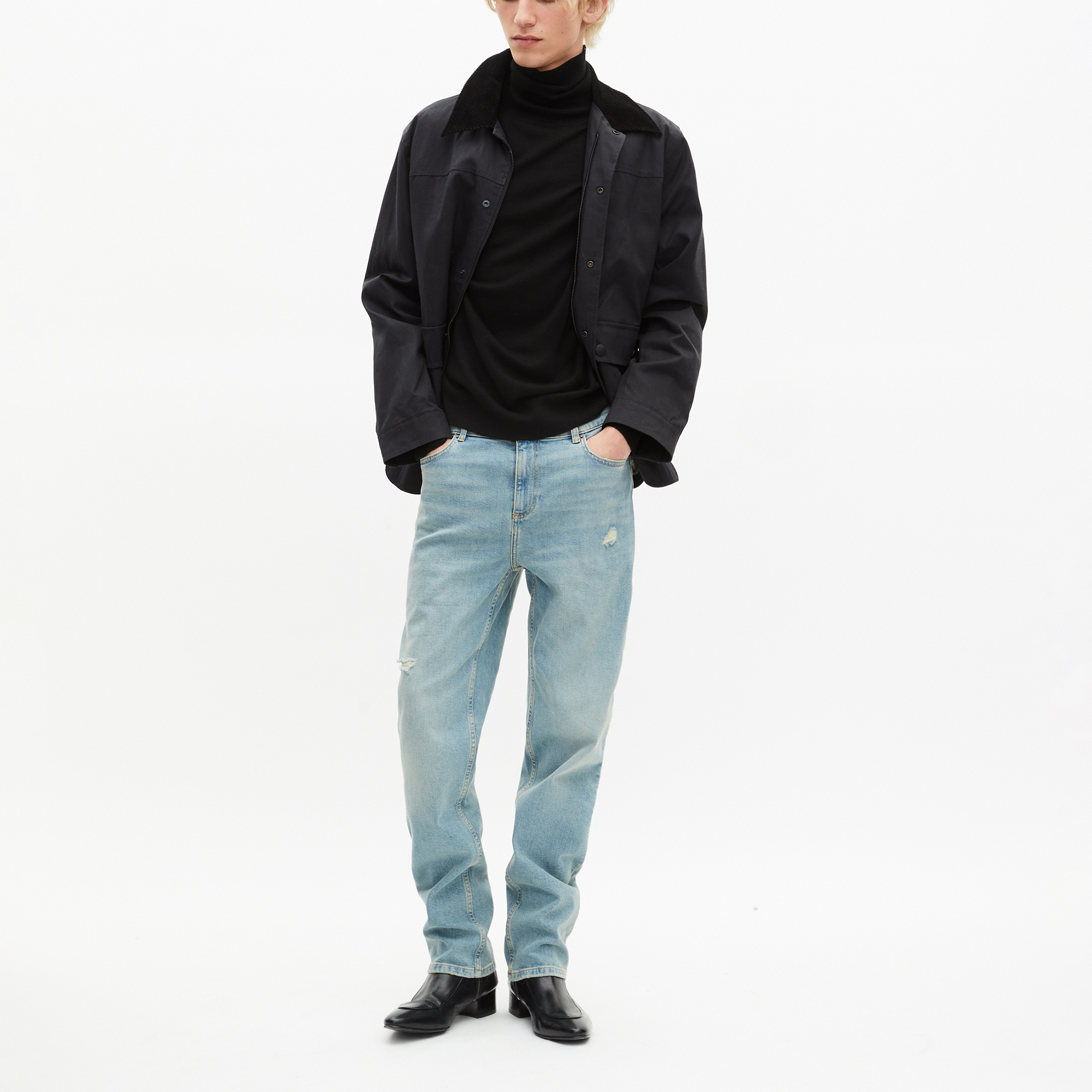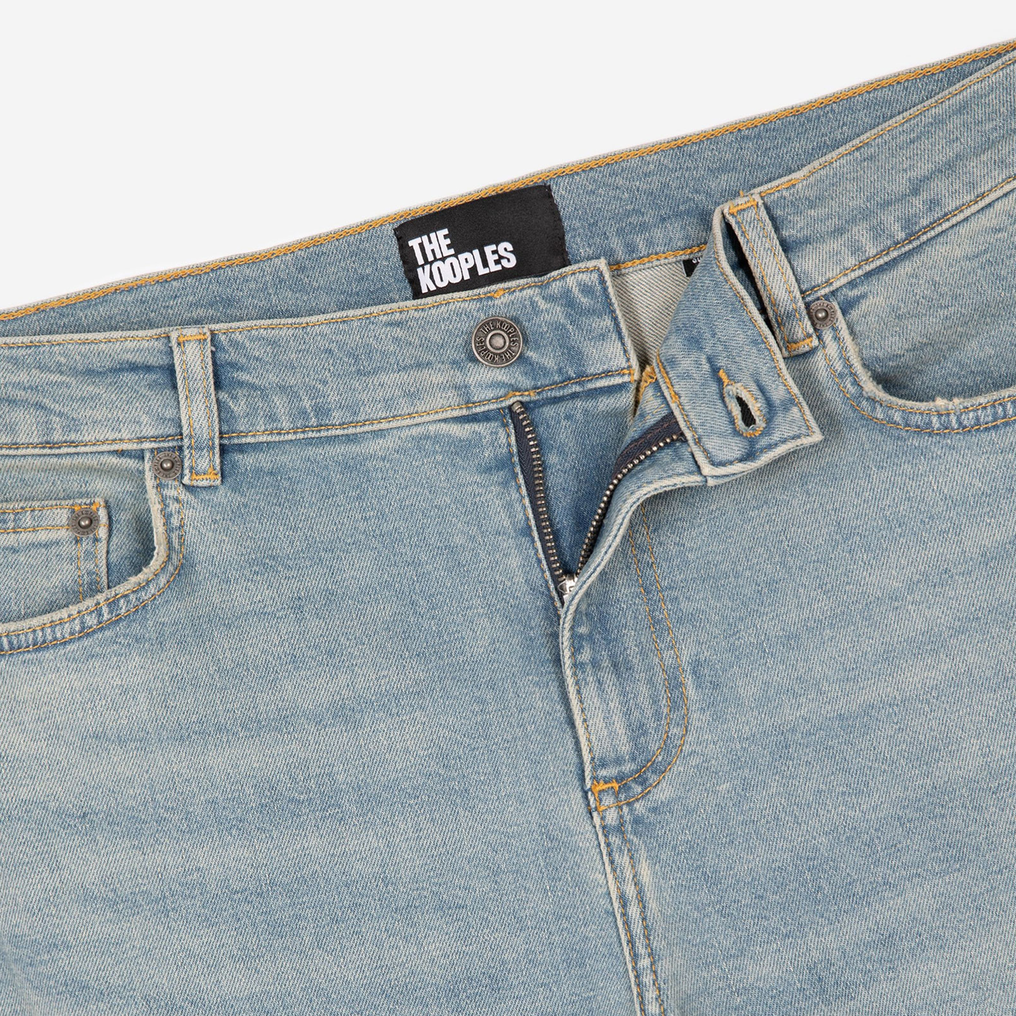- Mid rise, fitted leg, belt loops, button fastening, five-pocket design, abrasion detailing, washed finish