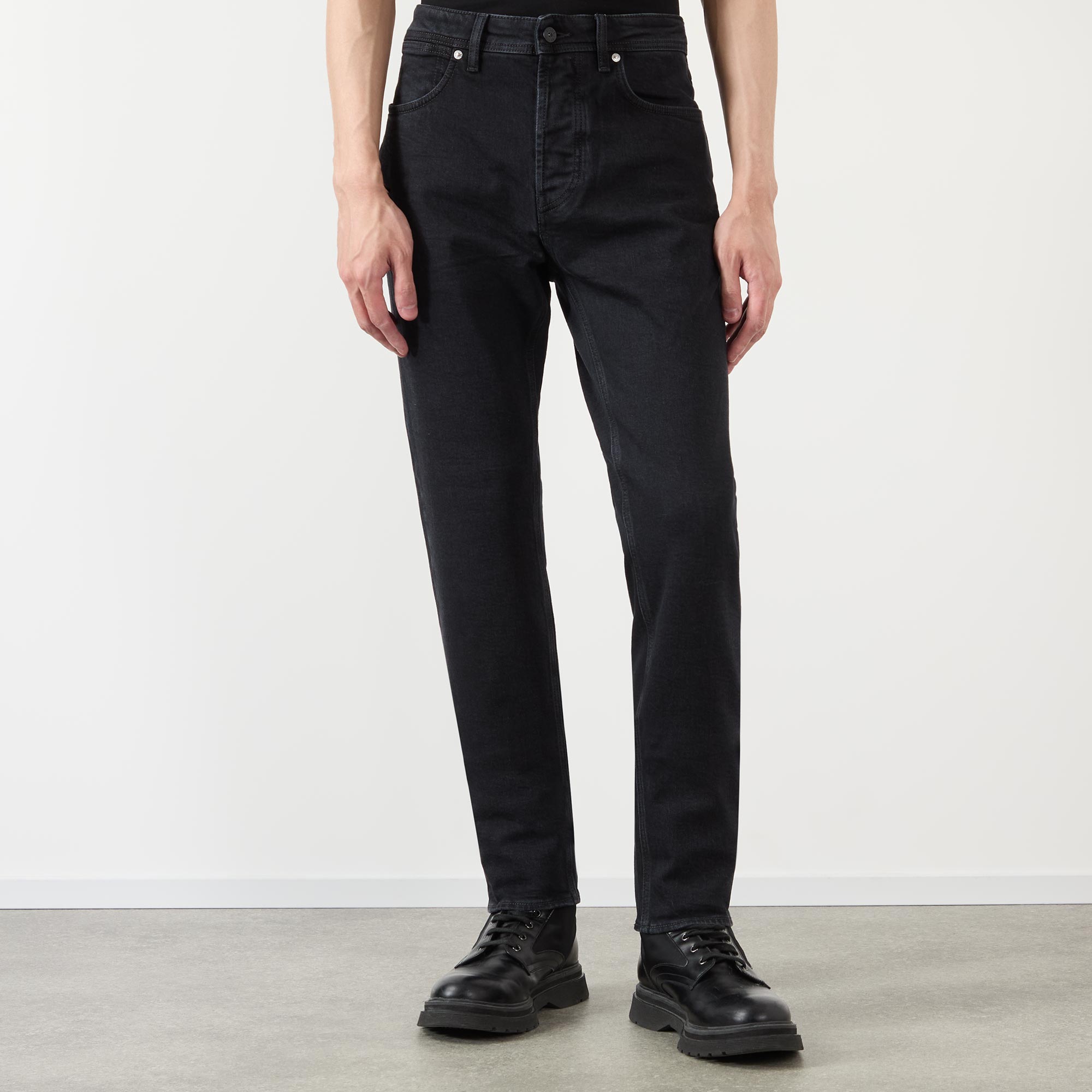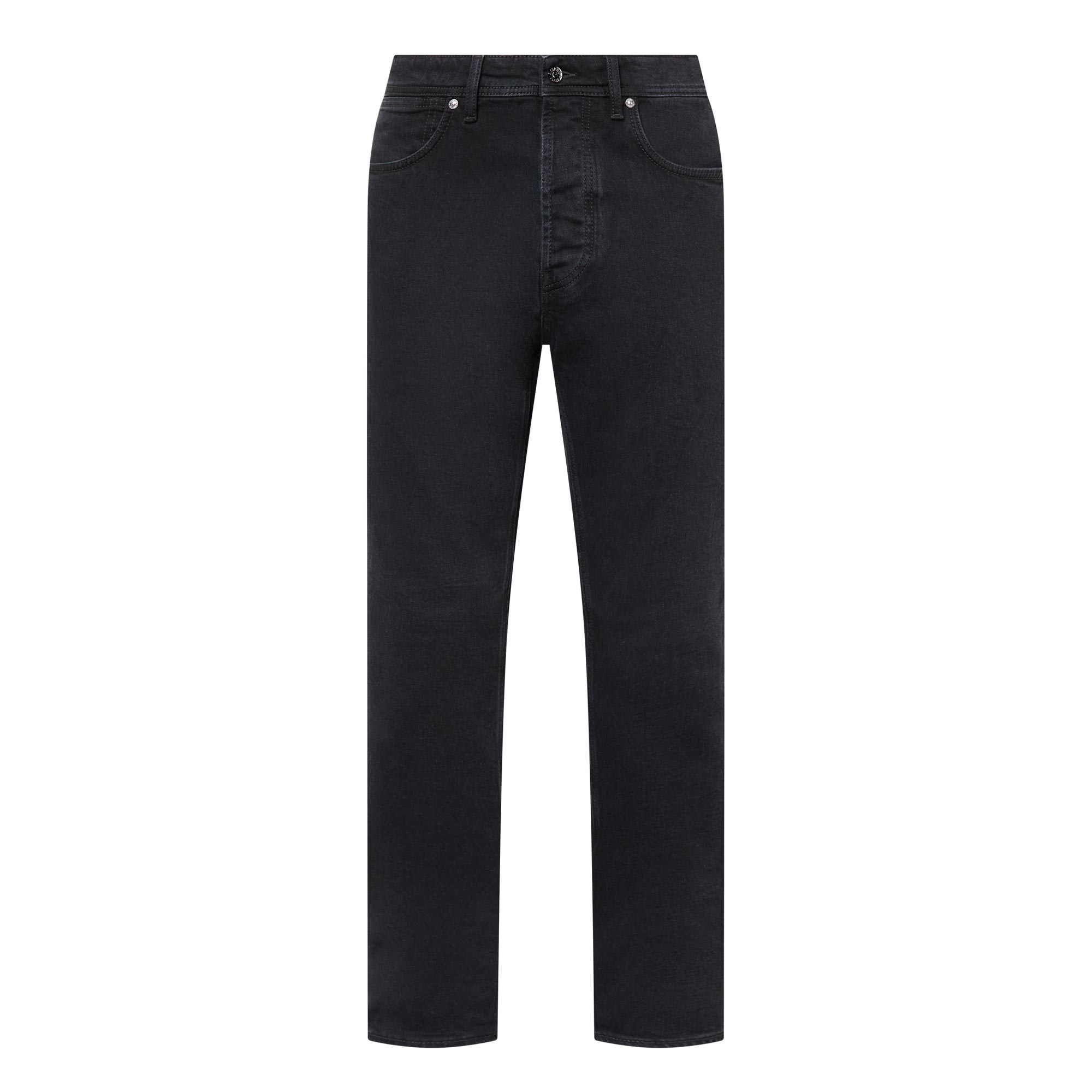 • Mid-rise, slim-leg, belt loops, concealed fly and button fastening, five-pocket styling, clean hems, tonal stitching, logo detail, washed finish