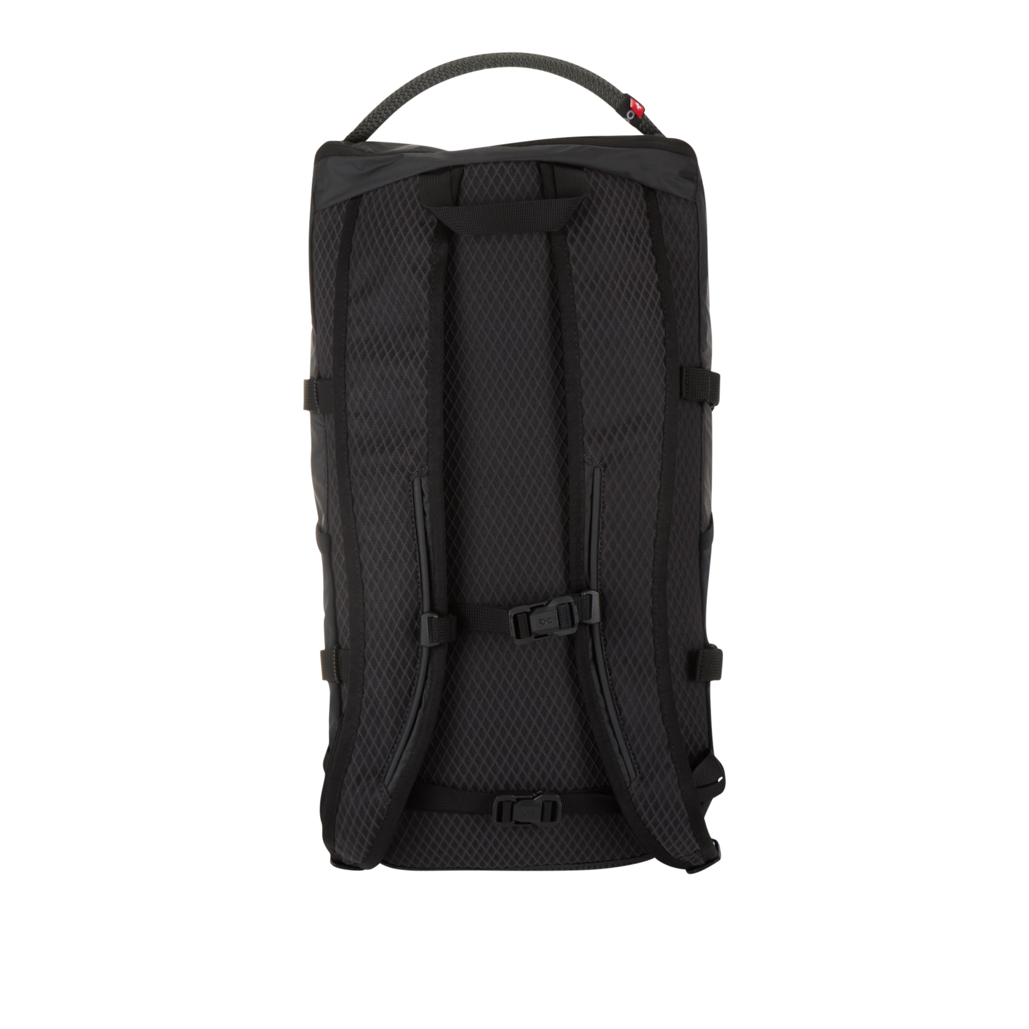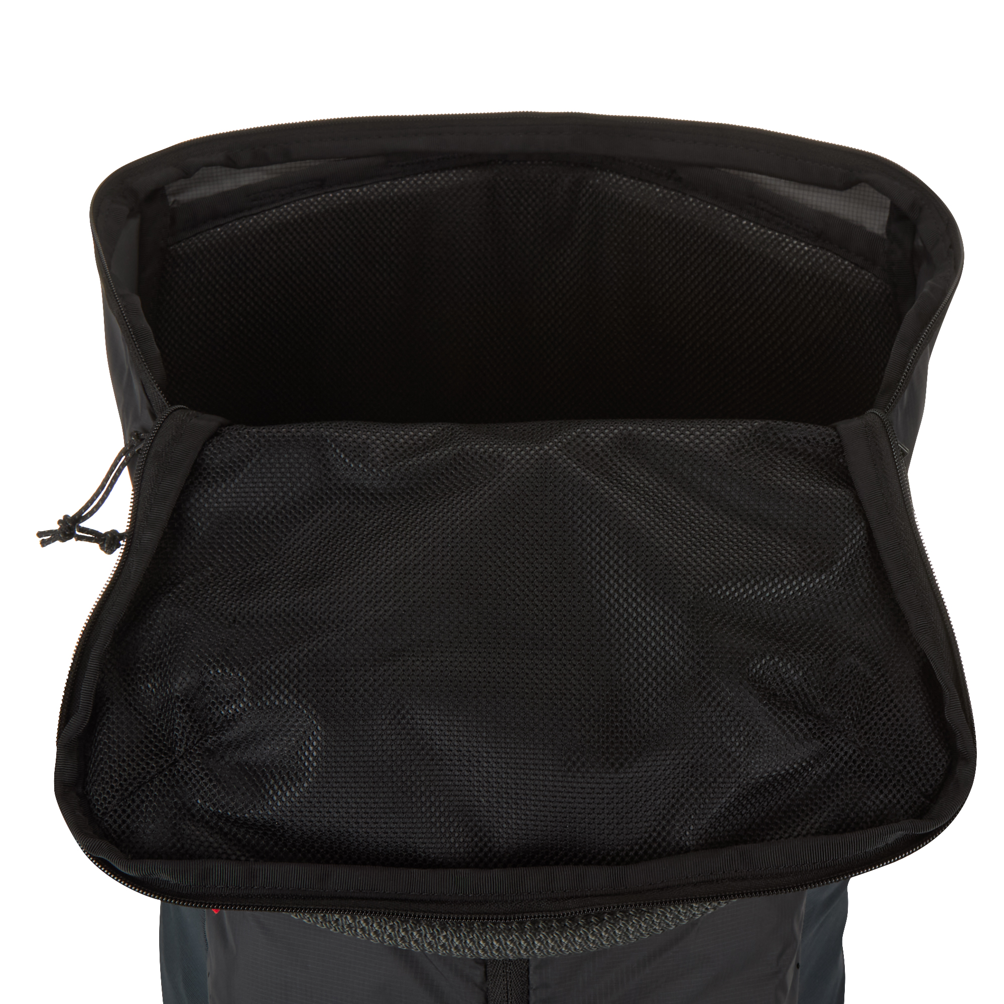 - Top carry handle, adjustable and padded diamond mesh shoulder straps, zip fastening, adjustable side compression straps, chest and waist belts, zipped exterior pocket at front and top, side pockets, logo print