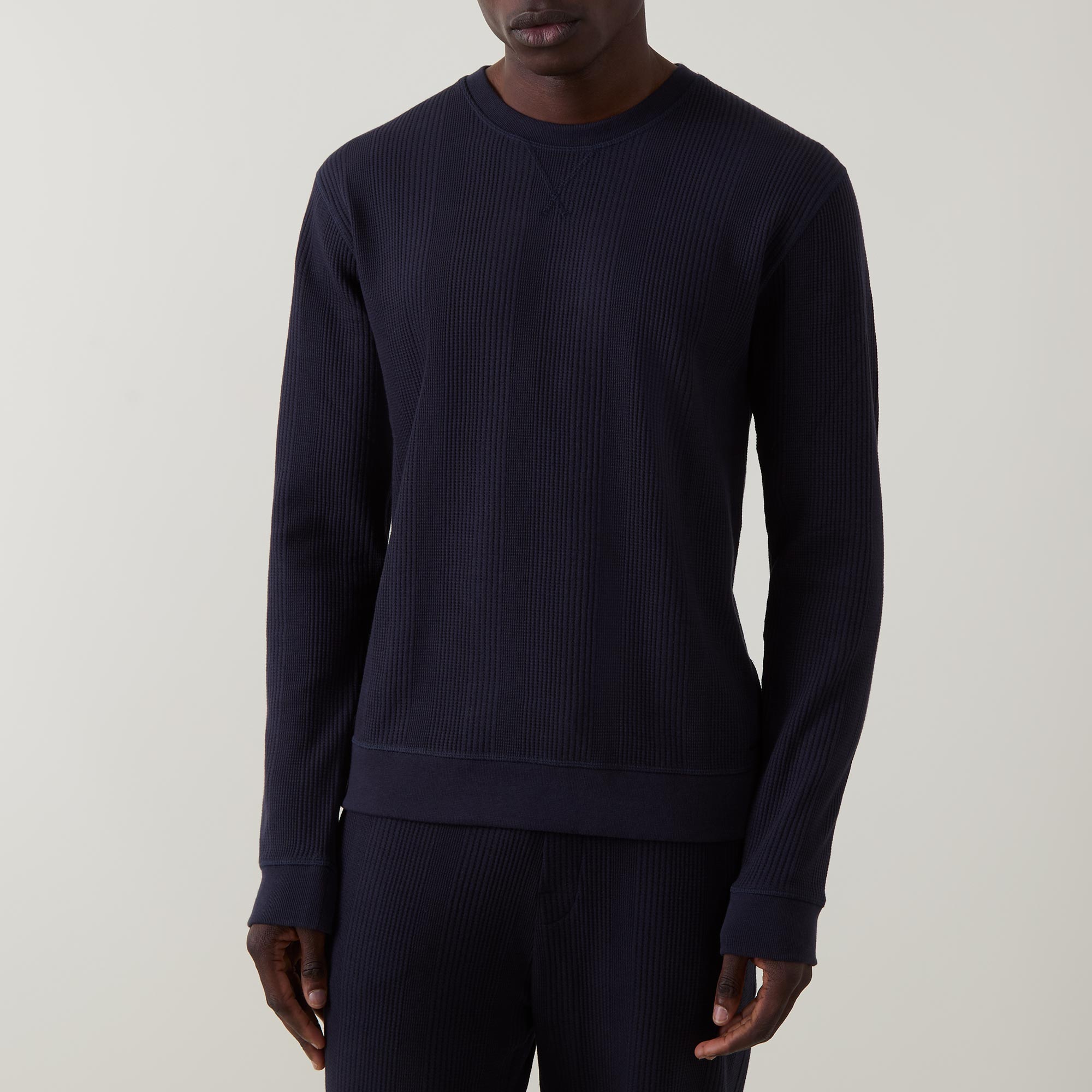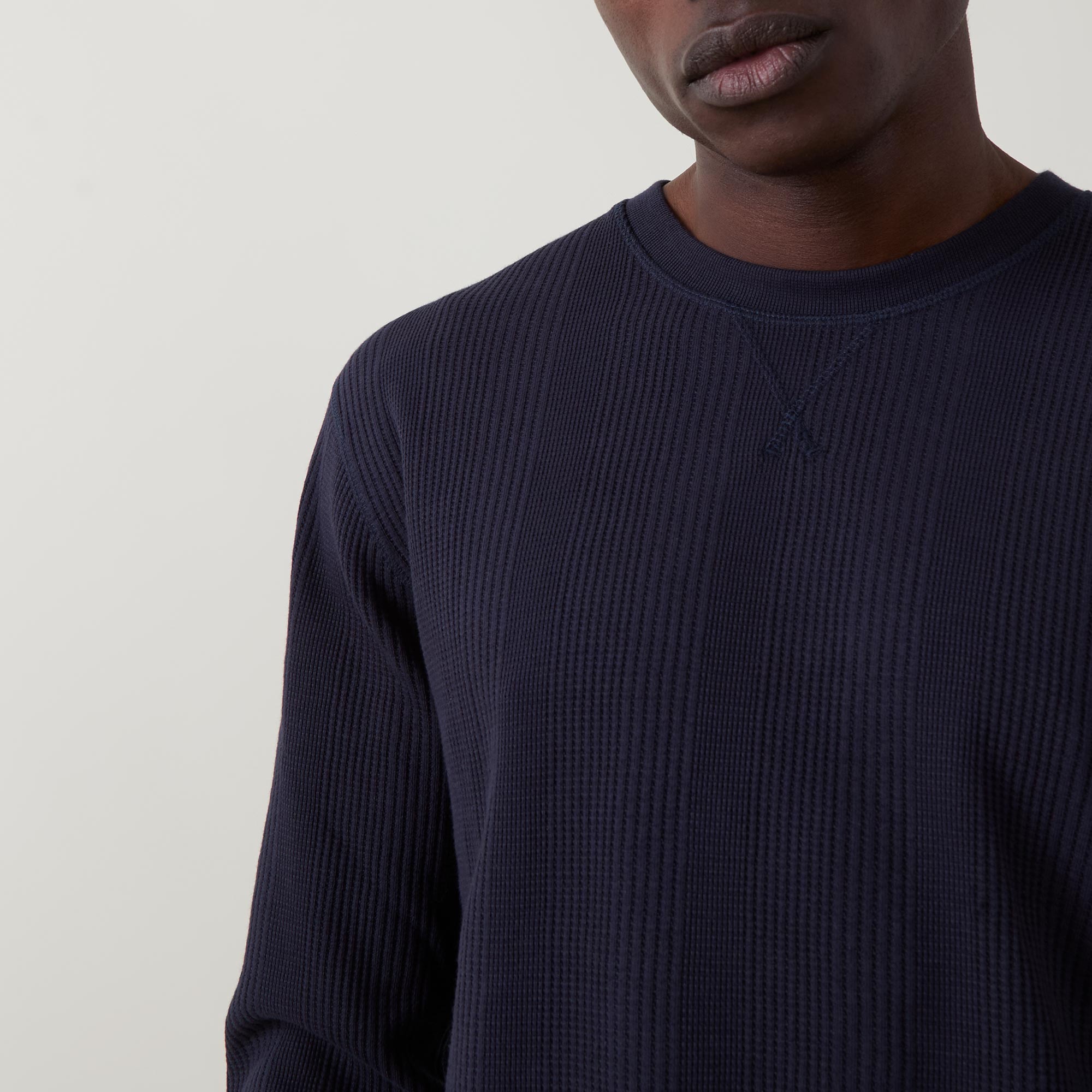 - Crew neckline, long sleeves, dropped shoulders, V-stitch detailing, pullover style, structured finish