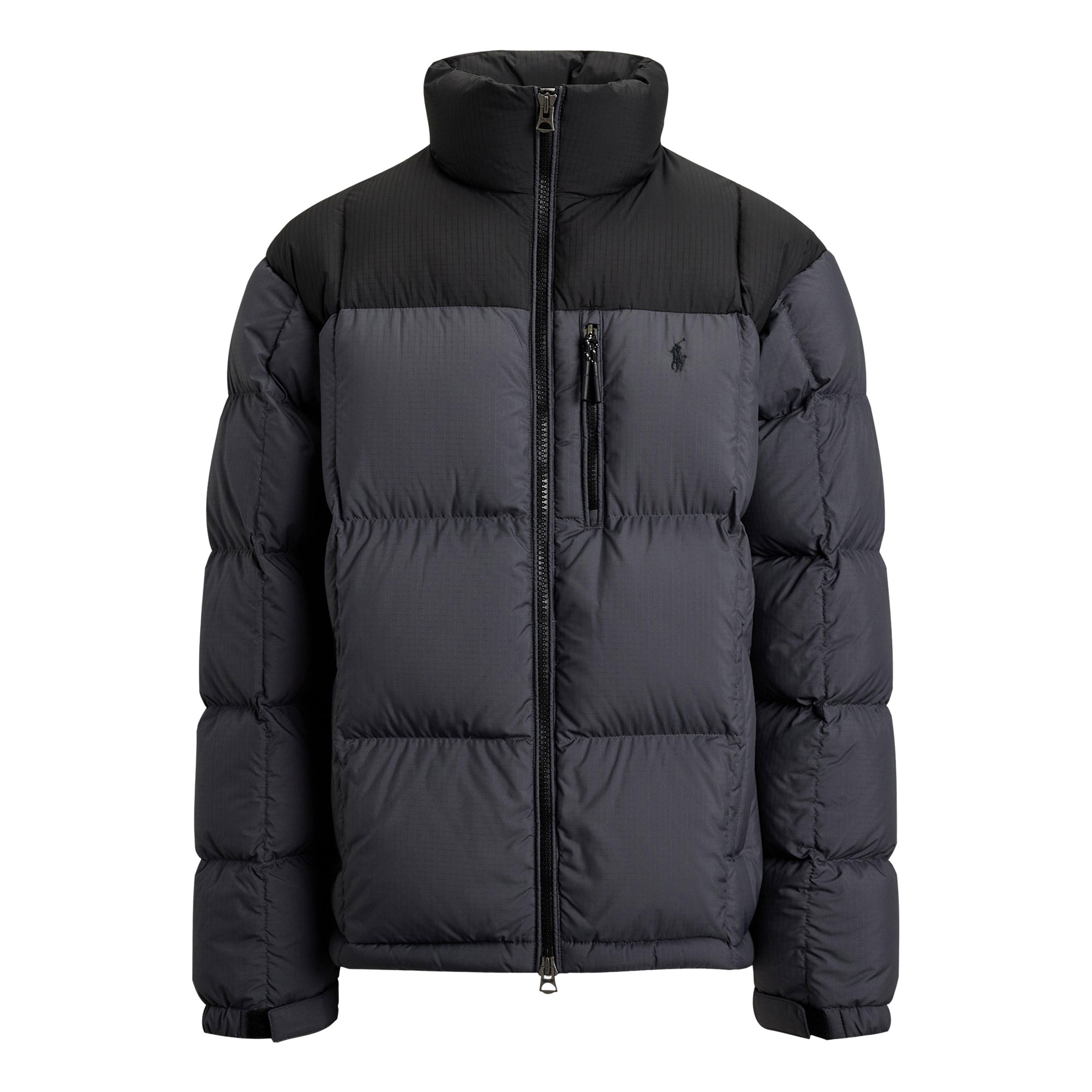 - Colour-blocked design, oversize box-quilted design, water-repellent ripstop fabric,750-fill-power down, mock neckline, two-way full-zip front, storm guard, flap, long sleeves, adjustable hook-and-loop tabs, elasticized cuffs, left chest zipped pocket, two front waist zipped pockets, internal right chest pocket, drawstring hem, fully lined, filled, signature embroidered Pony logo