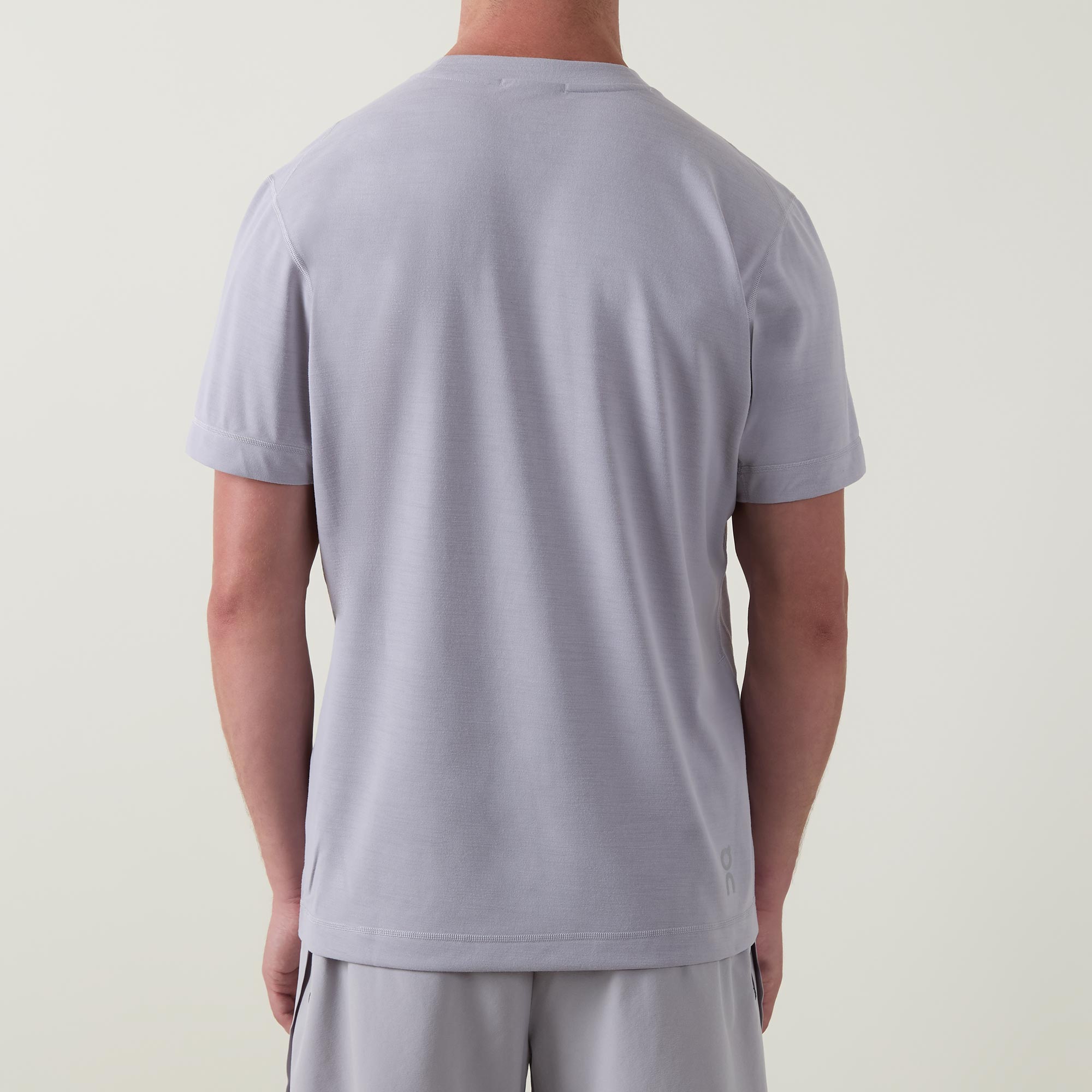 - Round neckline, short sleeves, flatlock decorative stitching lines, angled shoulder seam, straight hemline, heat-transferred logo at chest