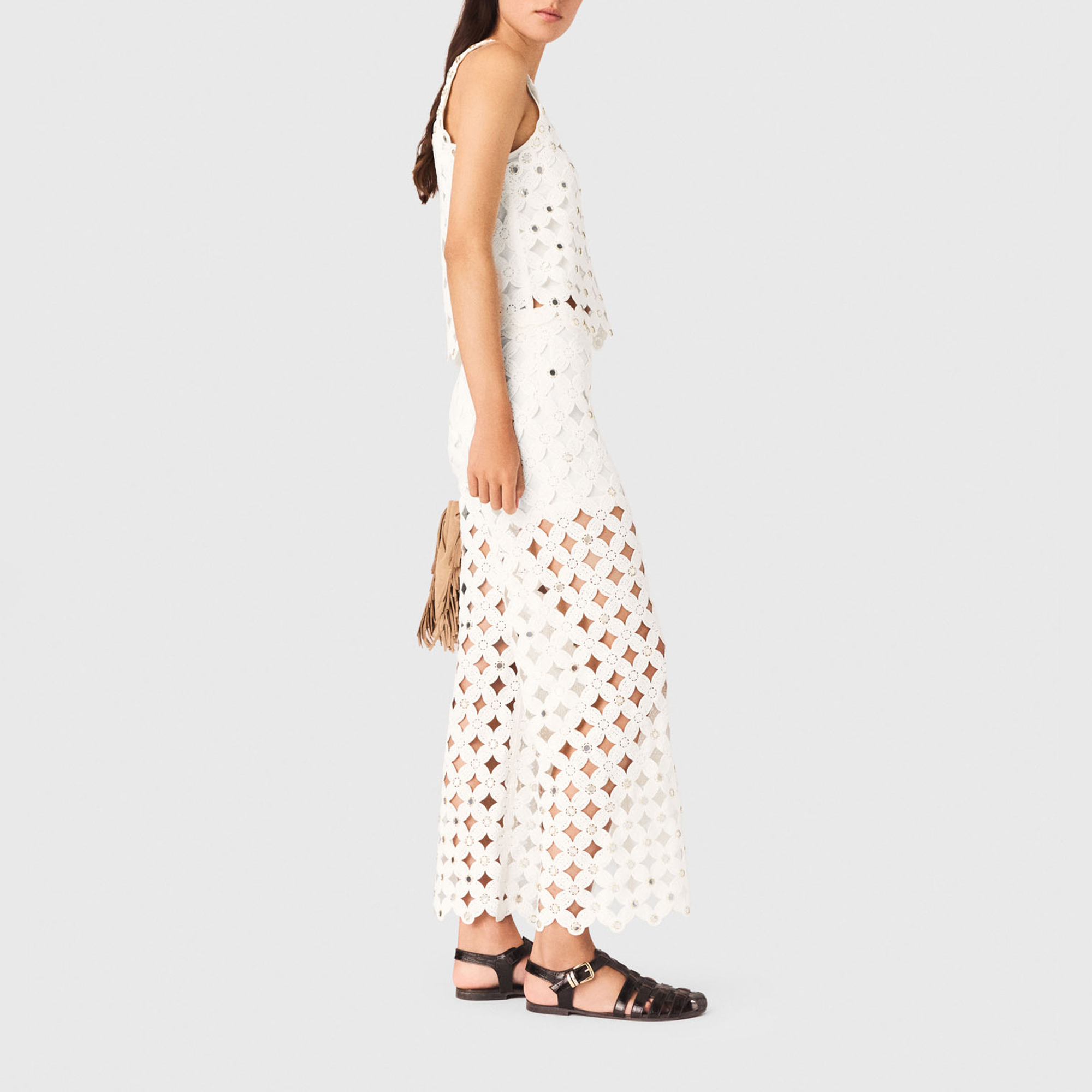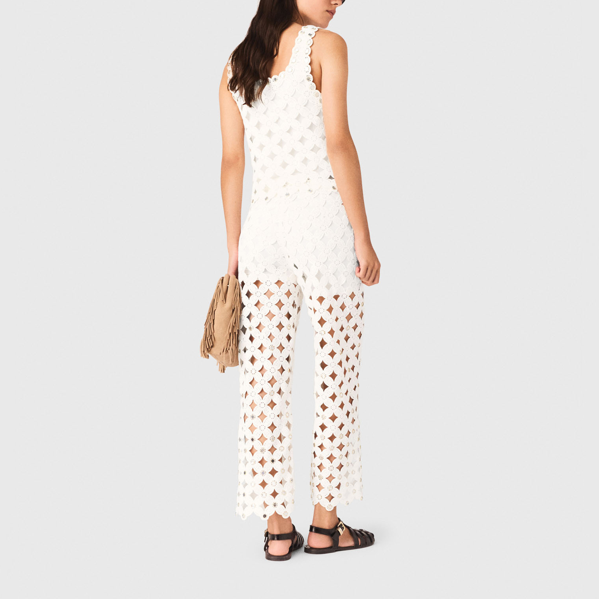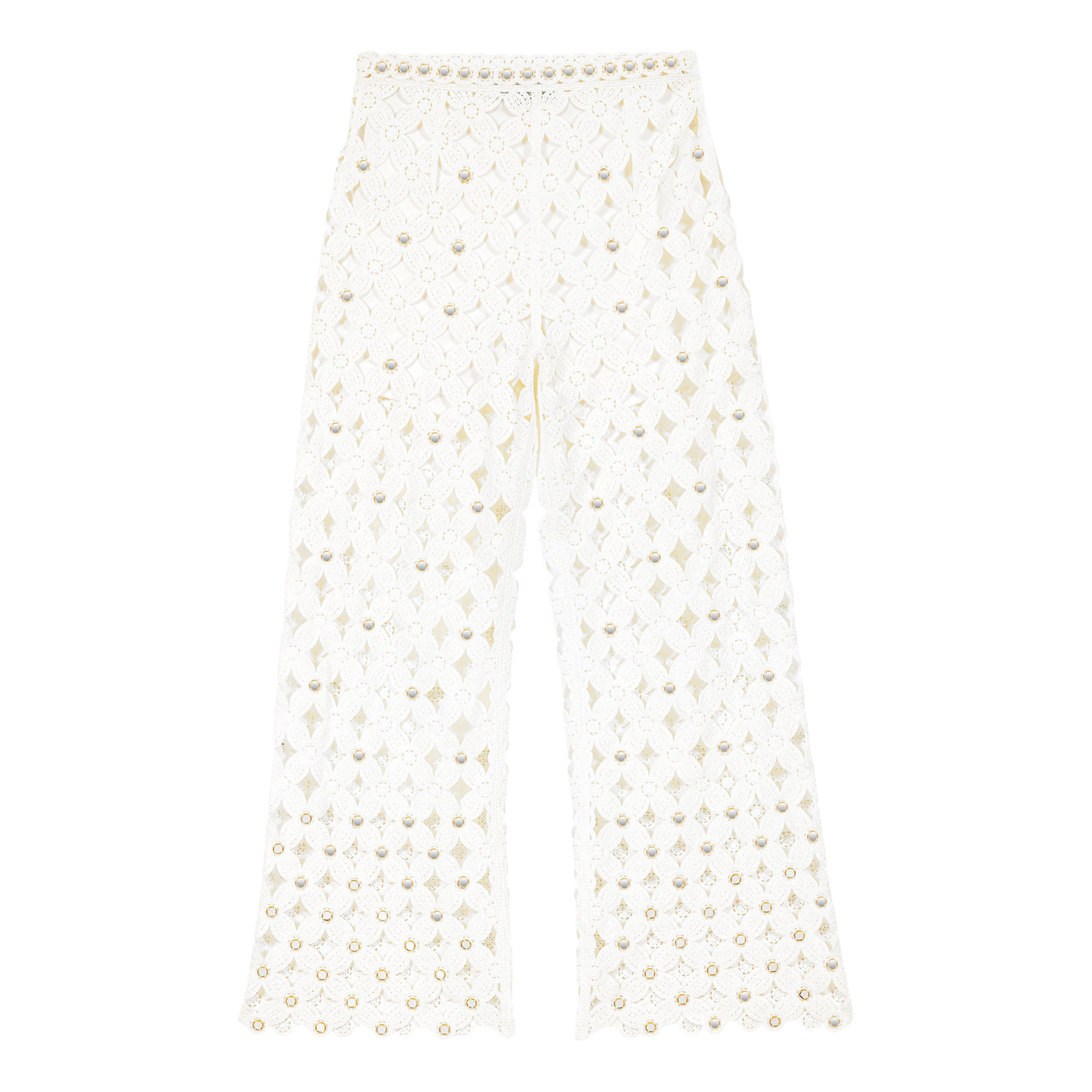 - Straight-leg silhouette, scalloped hem and waistband, visible short lining, fastening, openwork knit pattern, mirror-detail embellishment