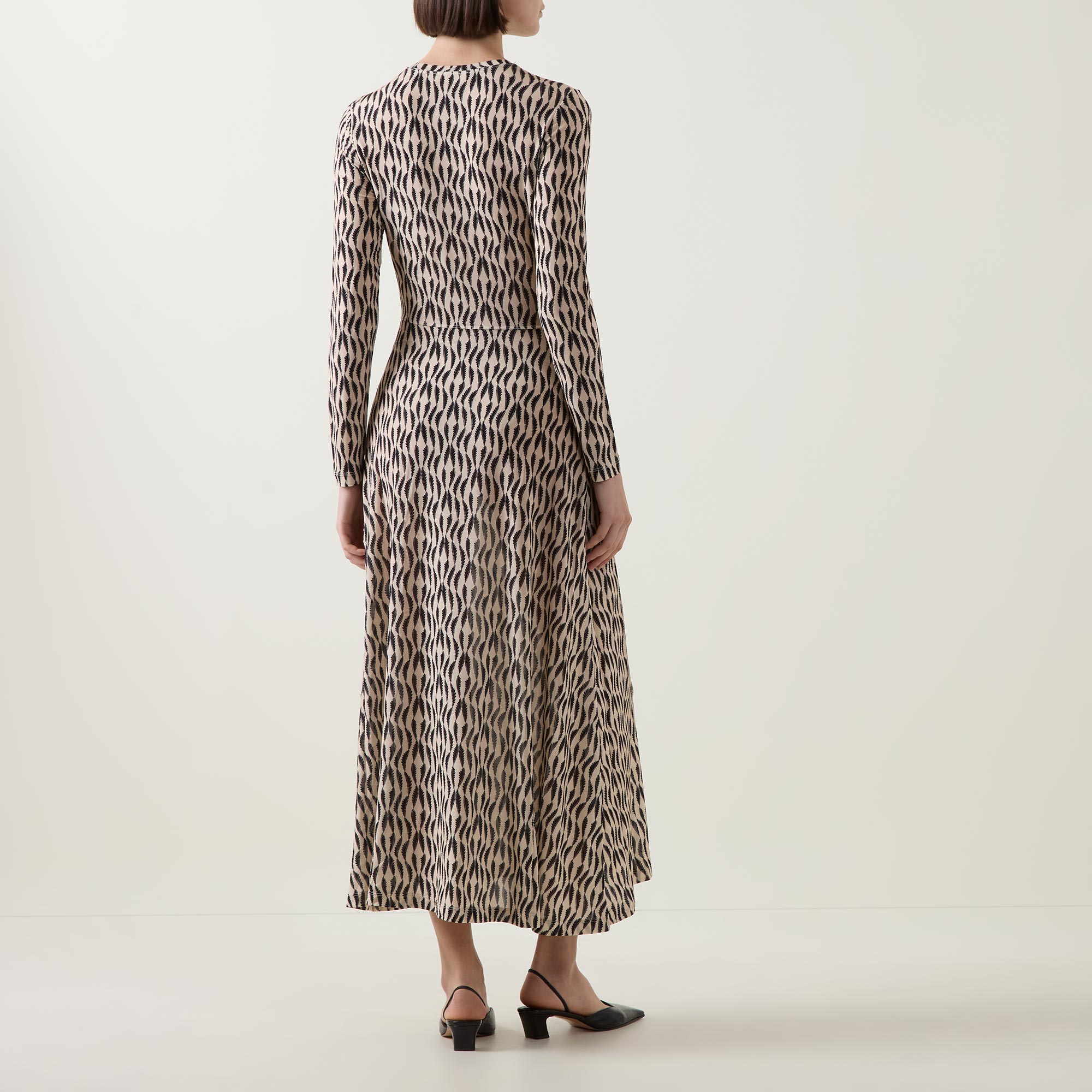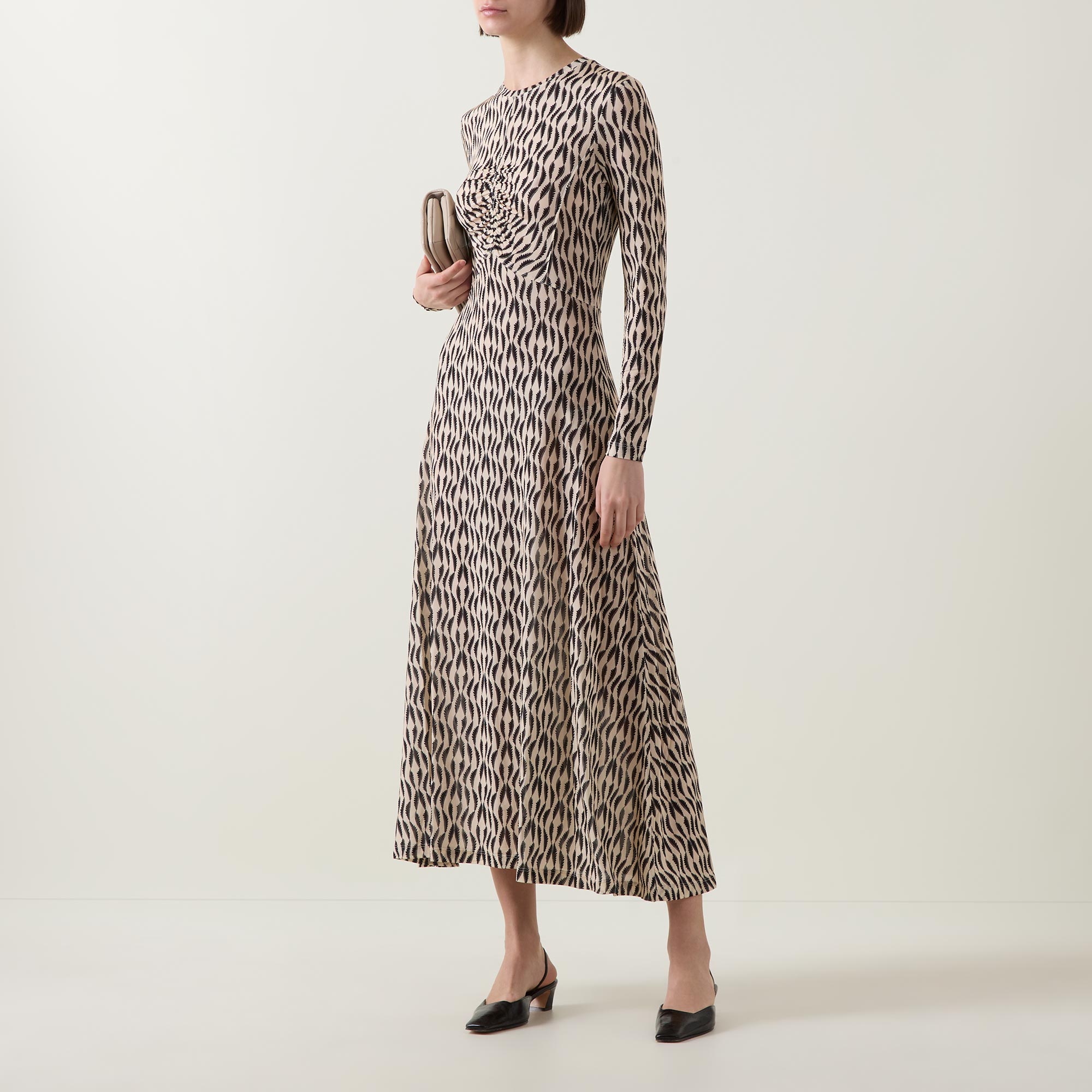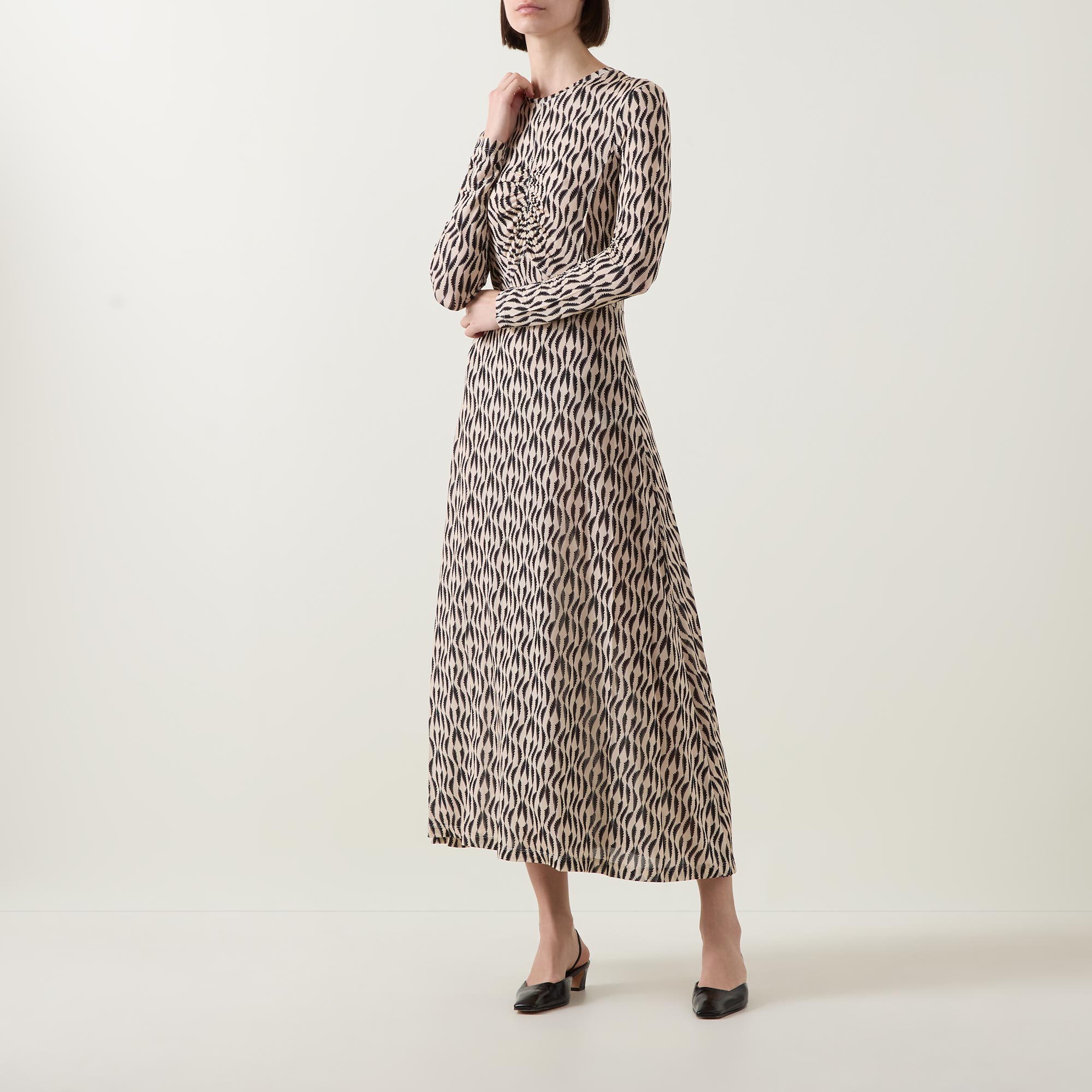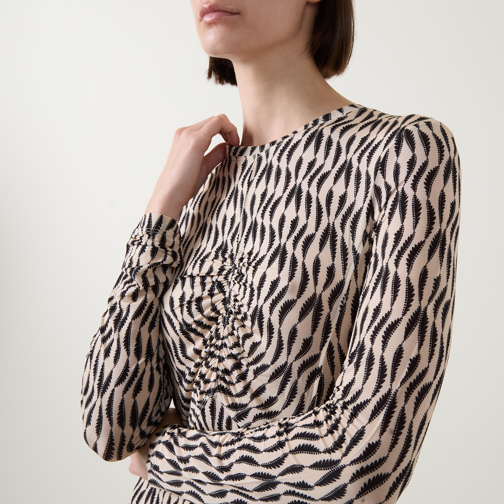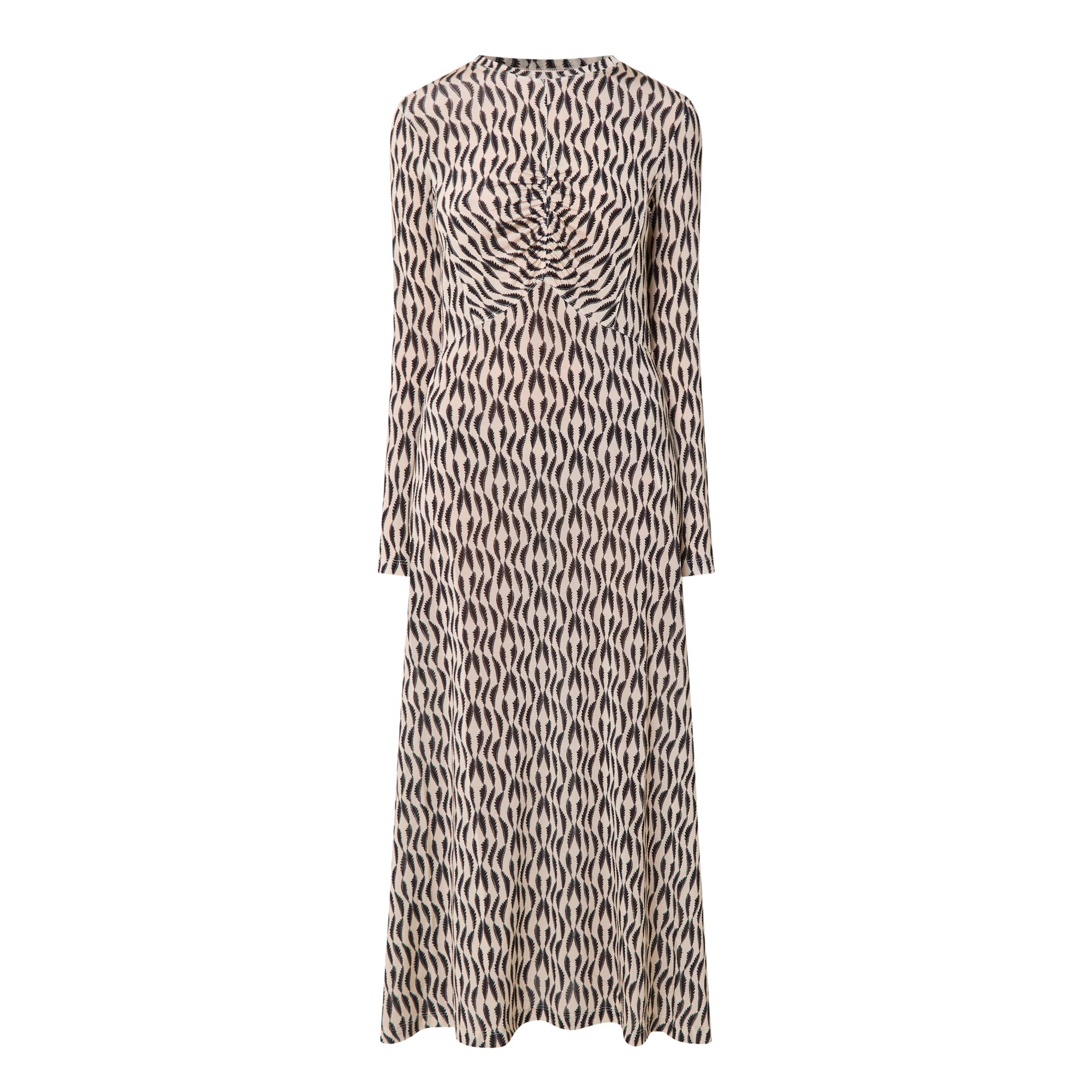 • Round neckline, long sleeves, fitted through the waist, ruched front detailing, flared skirt, straight hem, printed design, midi length