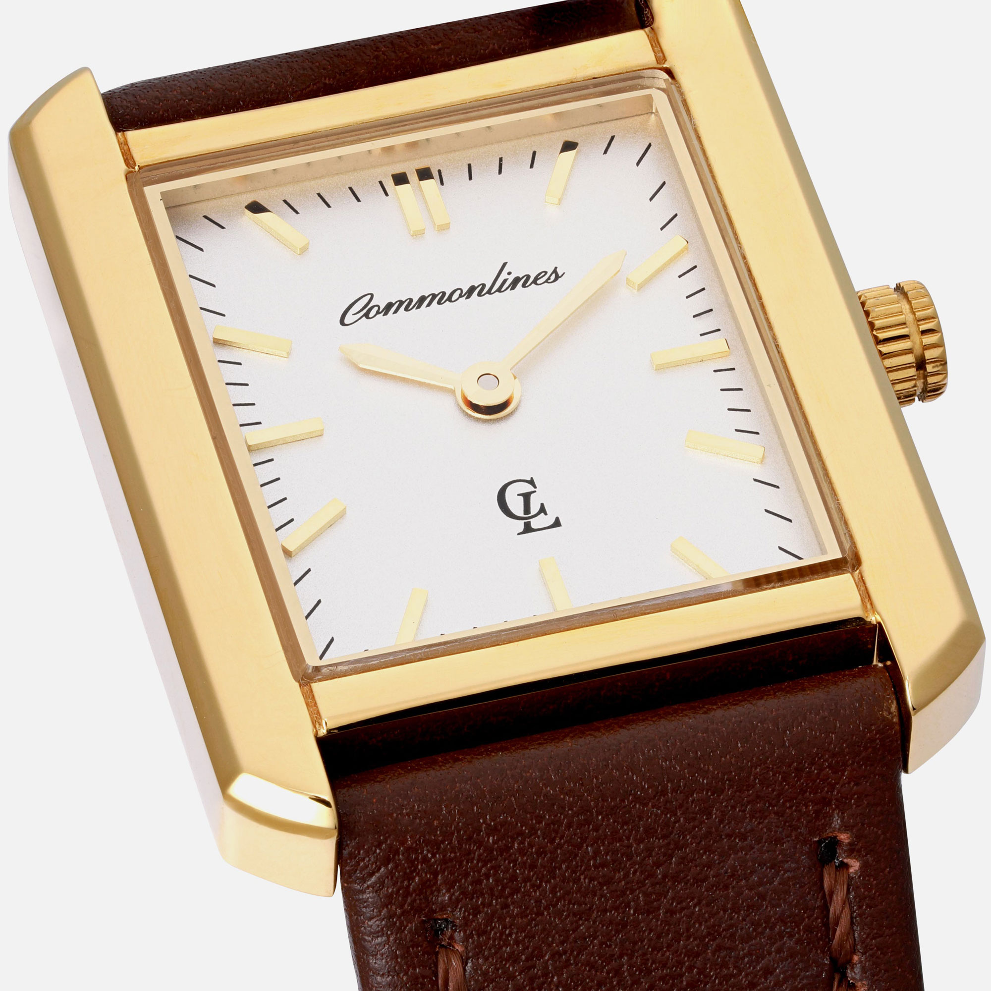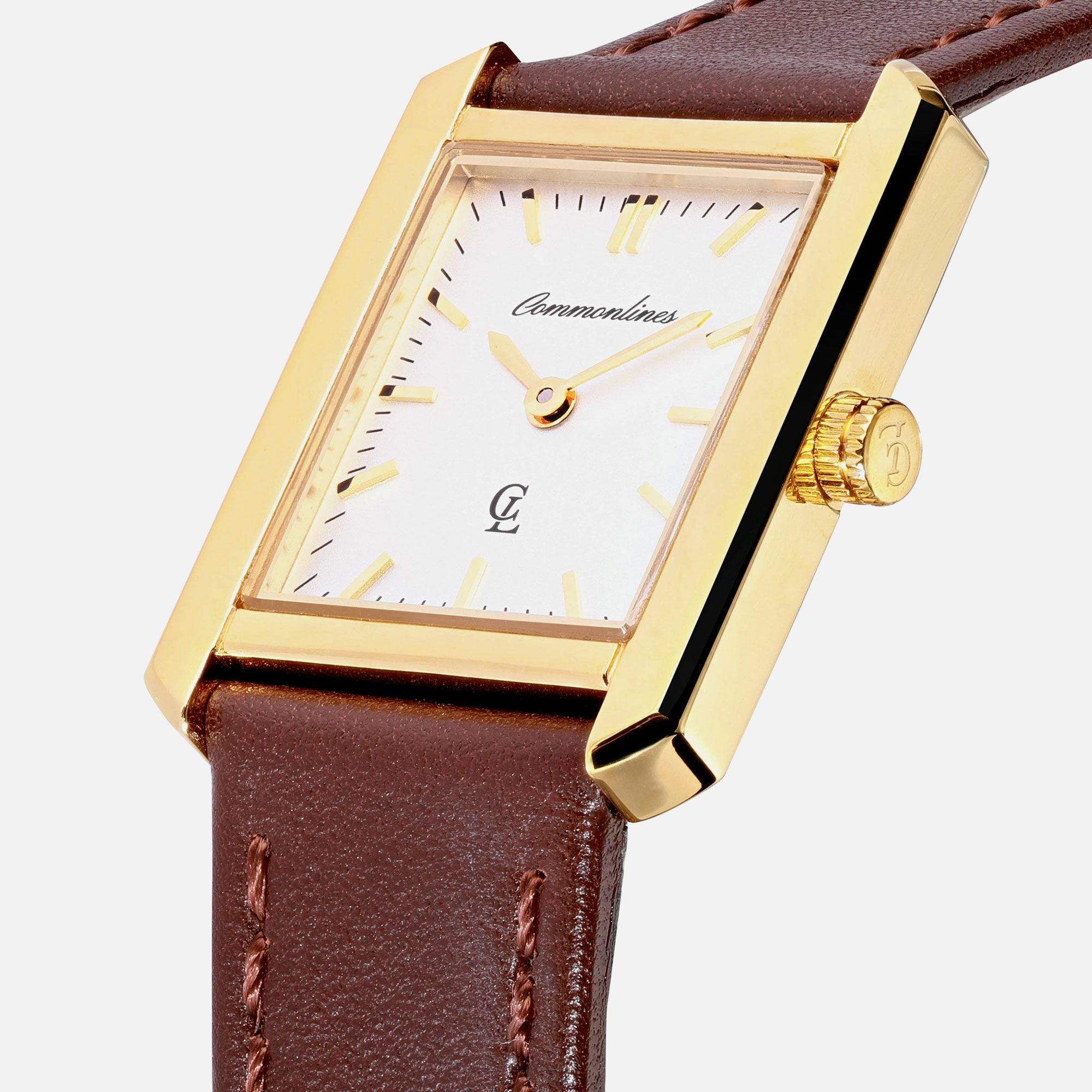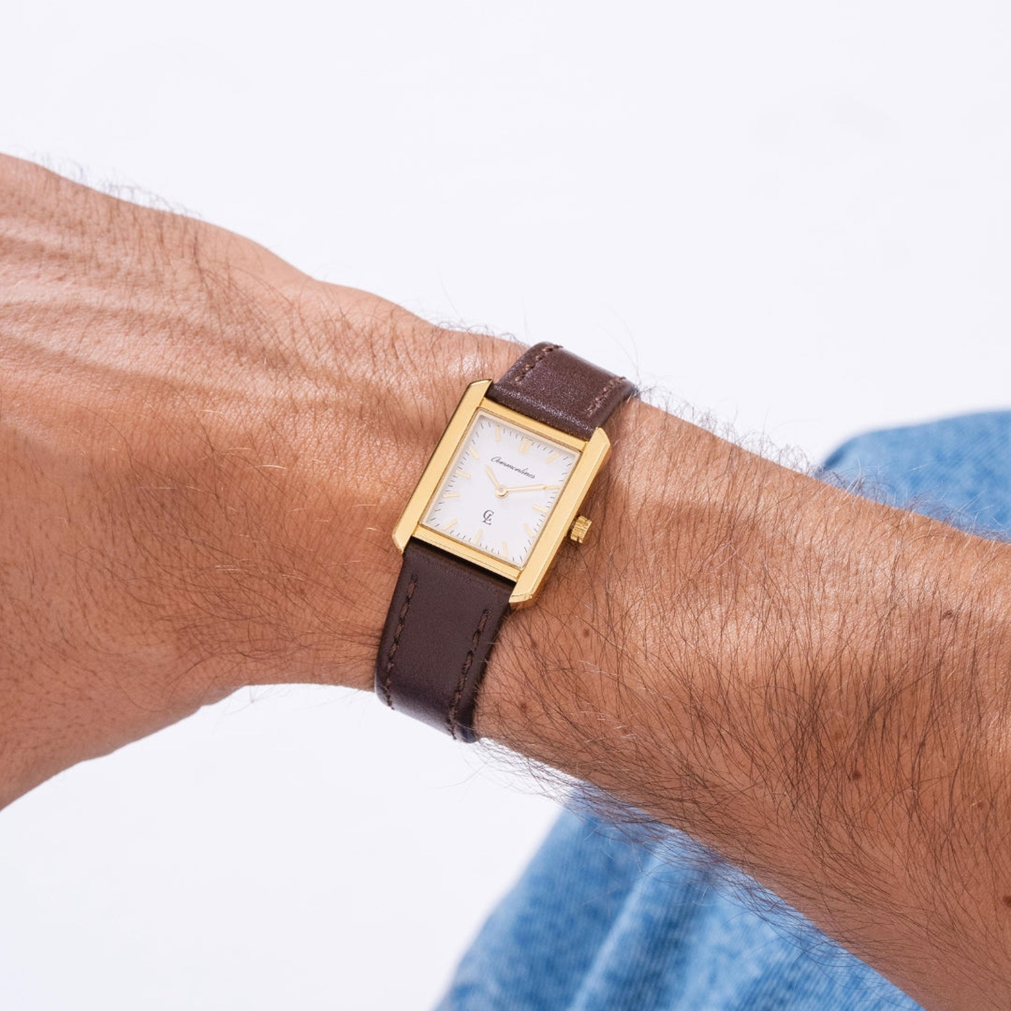 - Gold-tone hardware, scratch-resistant sapphire crystal, anti-reflective coating, Japanese Quartz movement, two-hand, battery powered, stainless steel case, leather strap, vintage-inspired rectangular silhouette, ivory dial, branding details, polish cloth, adjustment tool