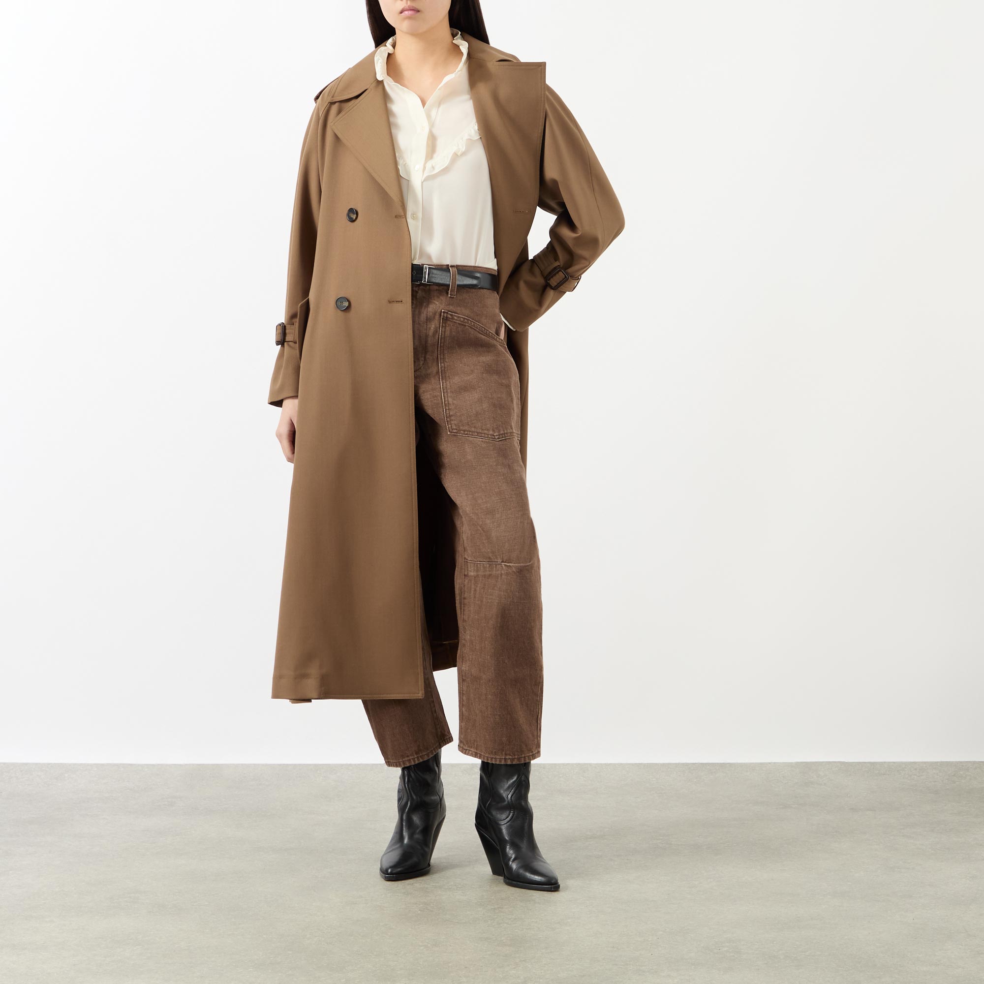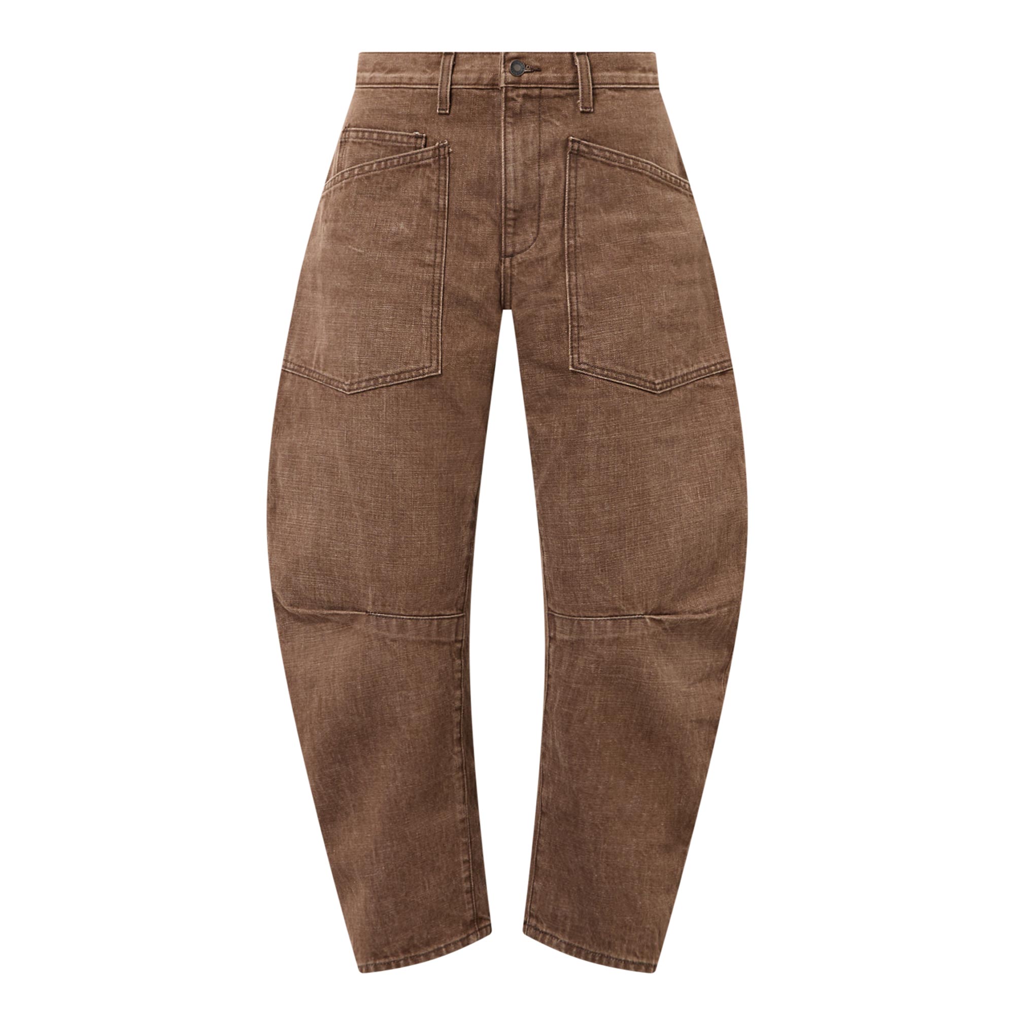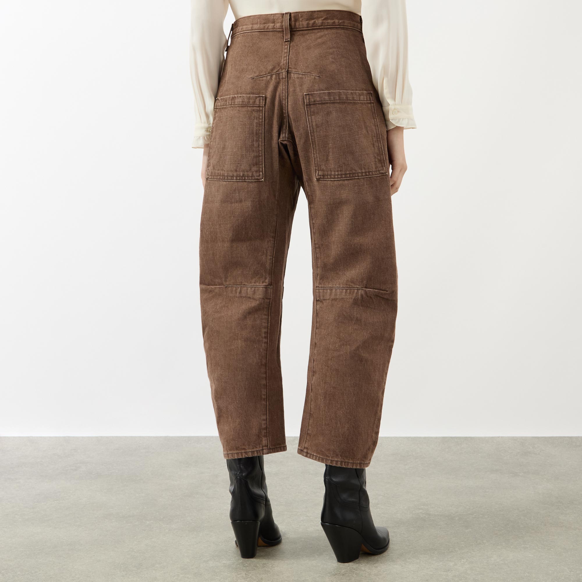 - Mid rise, barrel leg, curved silhouette, belt loops, zip fly and shank closure, top-stitched front and back pockets, clean hems, Japanese non-stretch denim, heavyweight