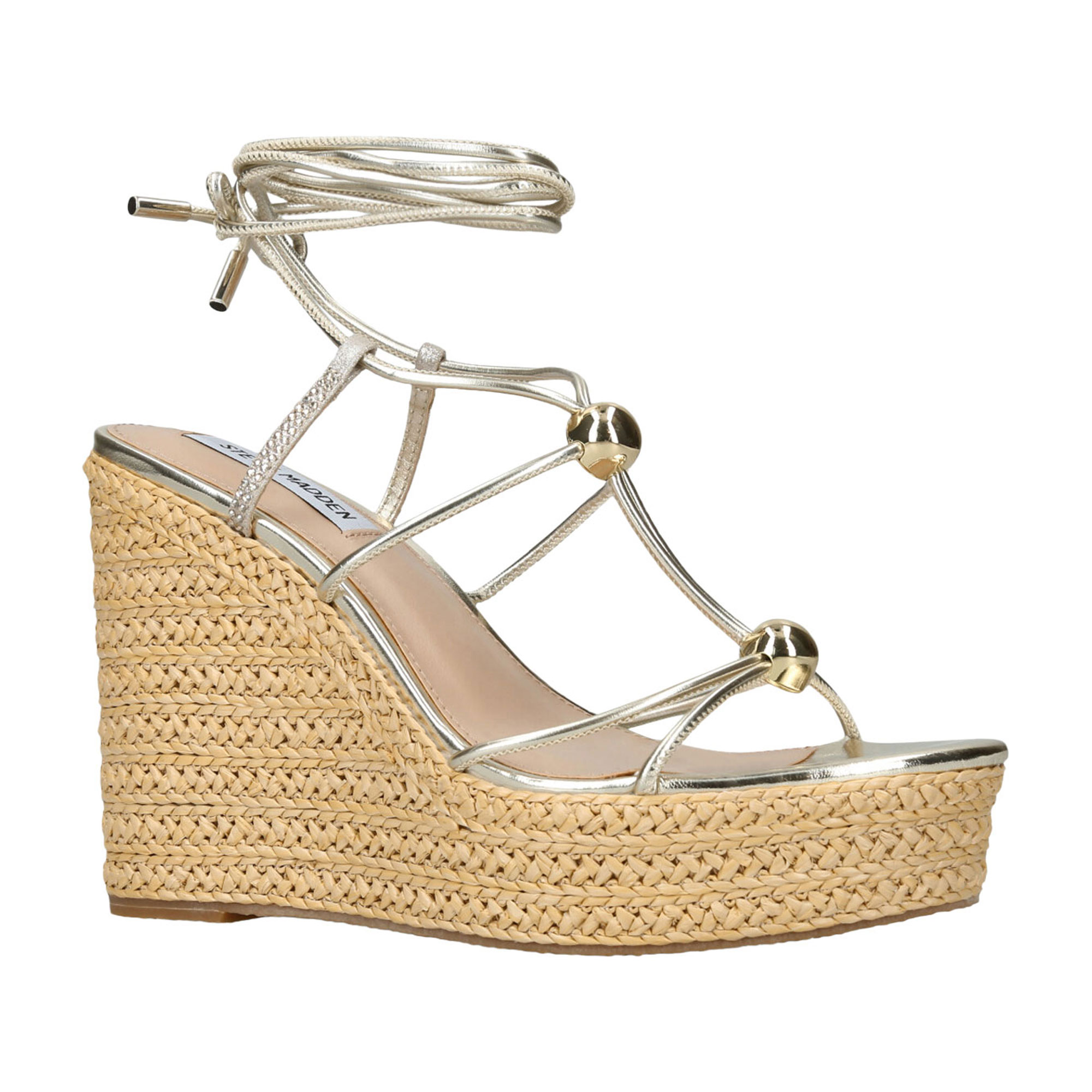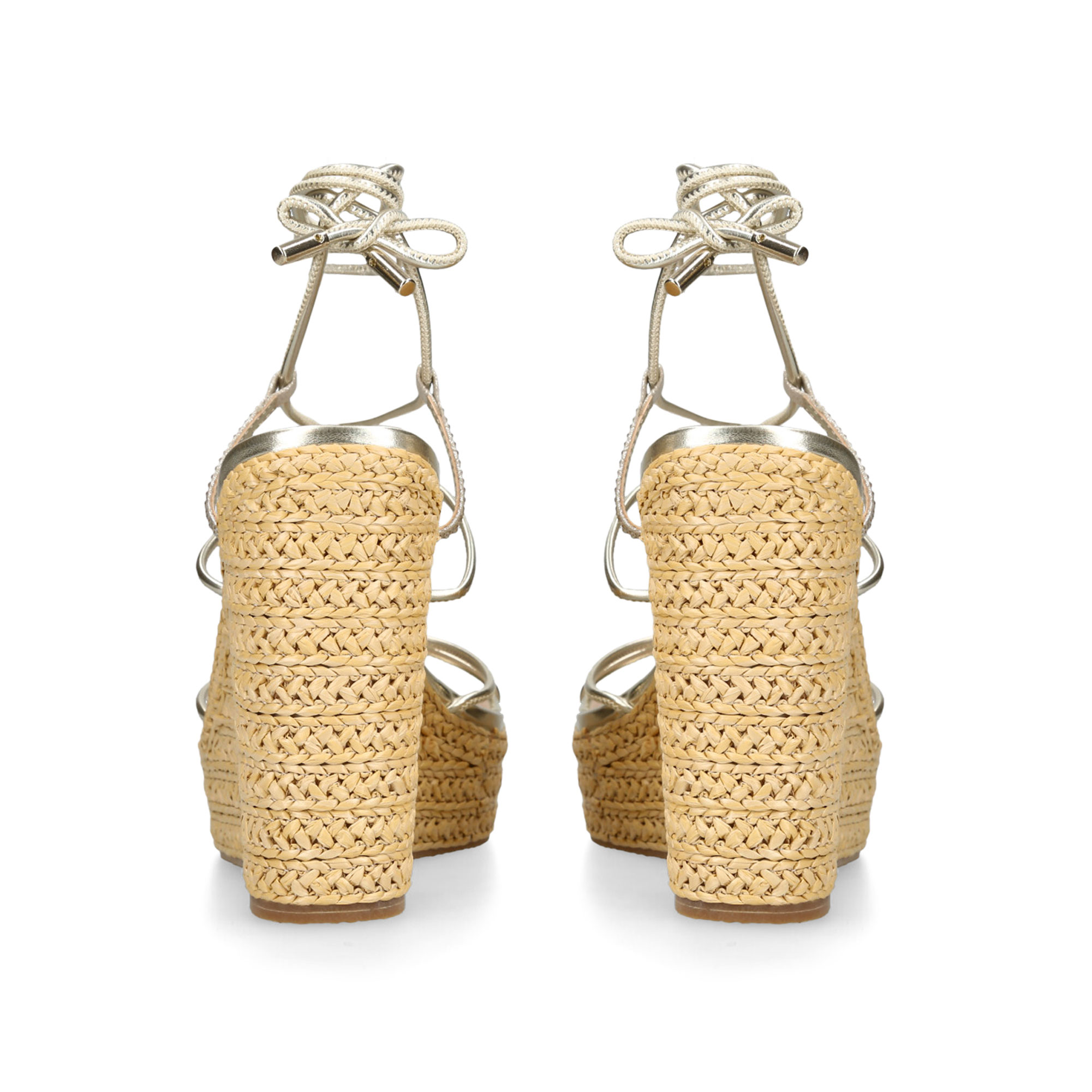 • Wedge heel, shimmering gold synthetic straps, delicate ankle ties, metallic bead accents