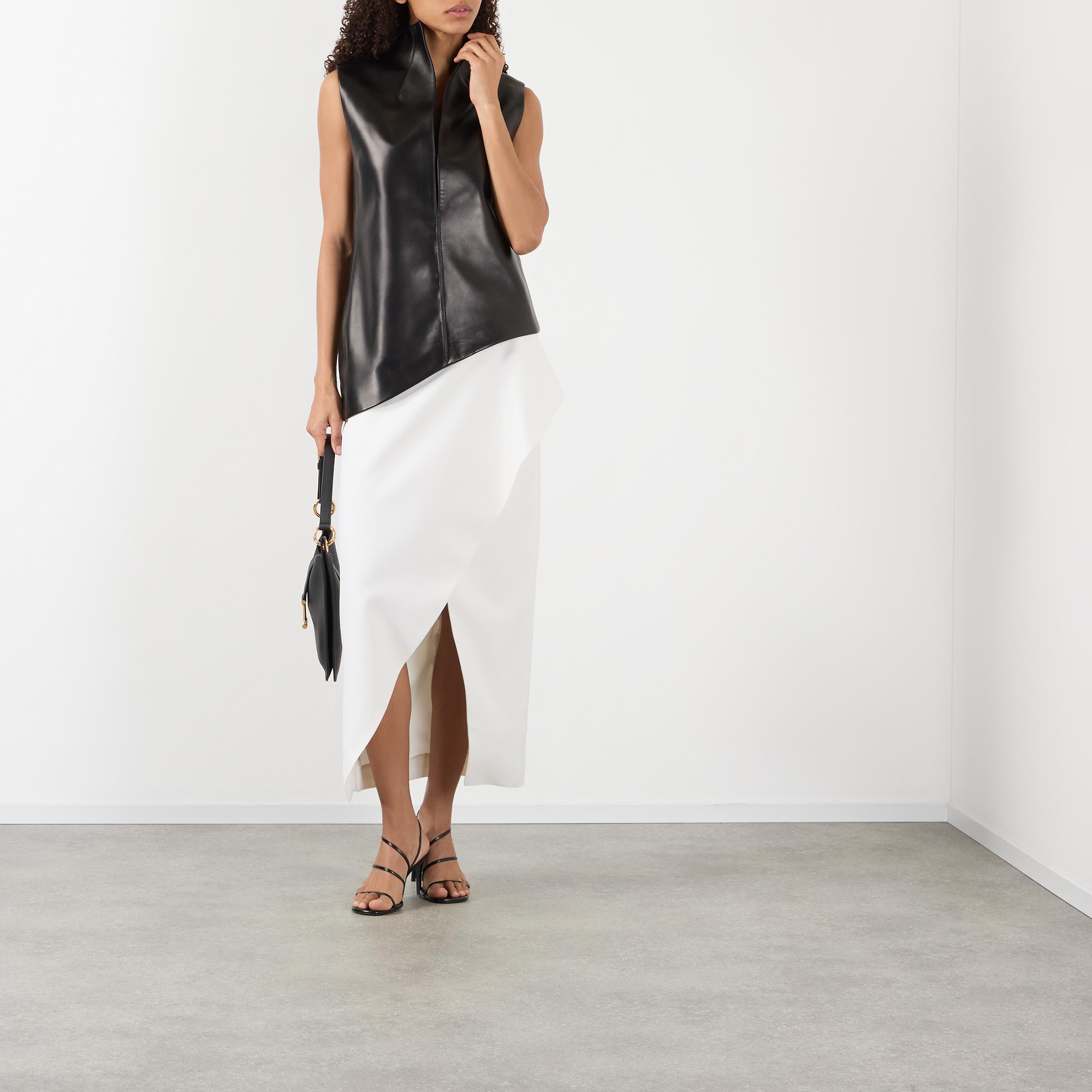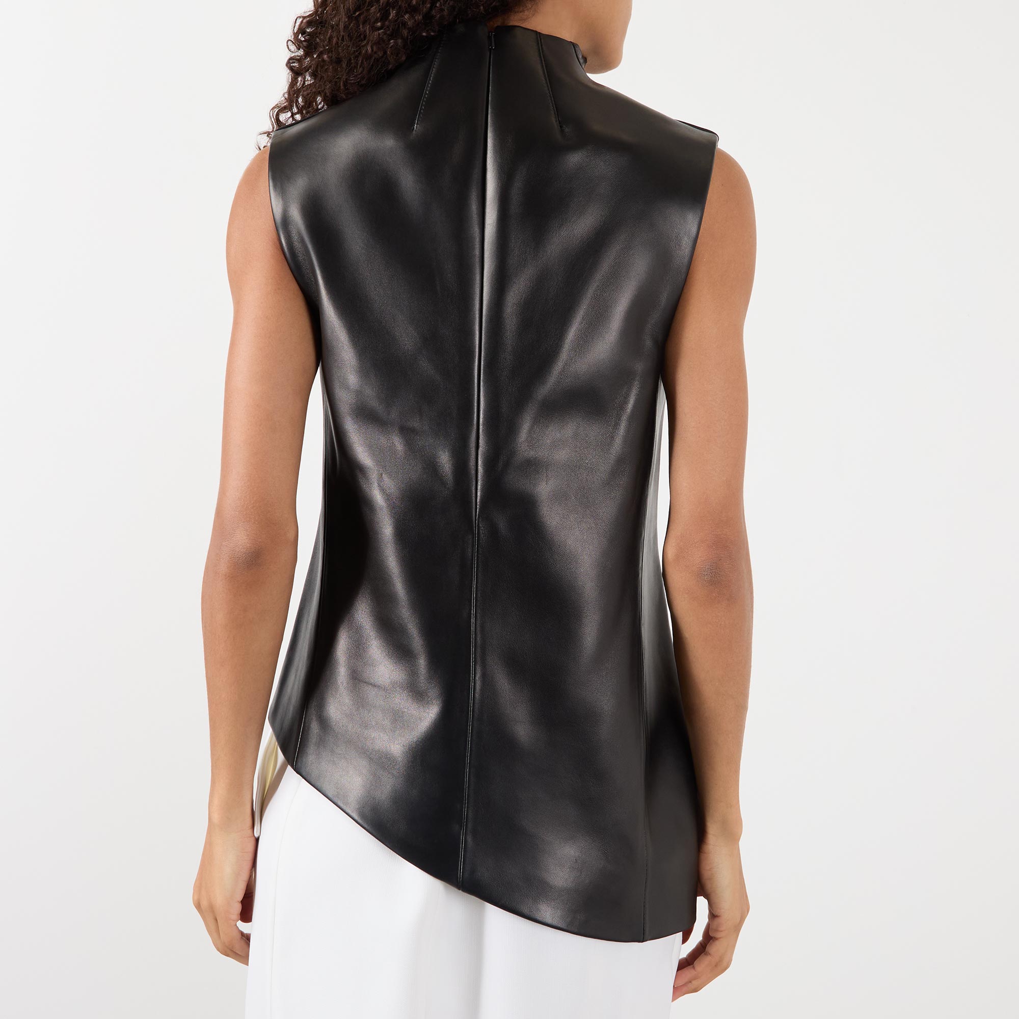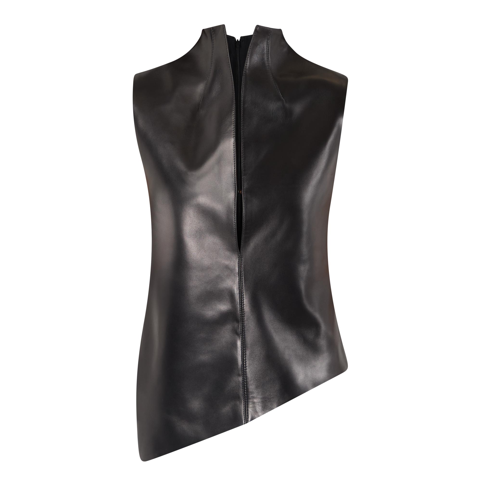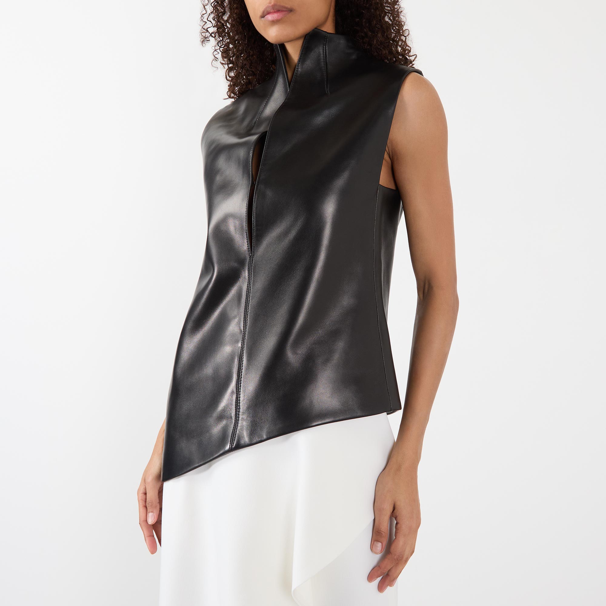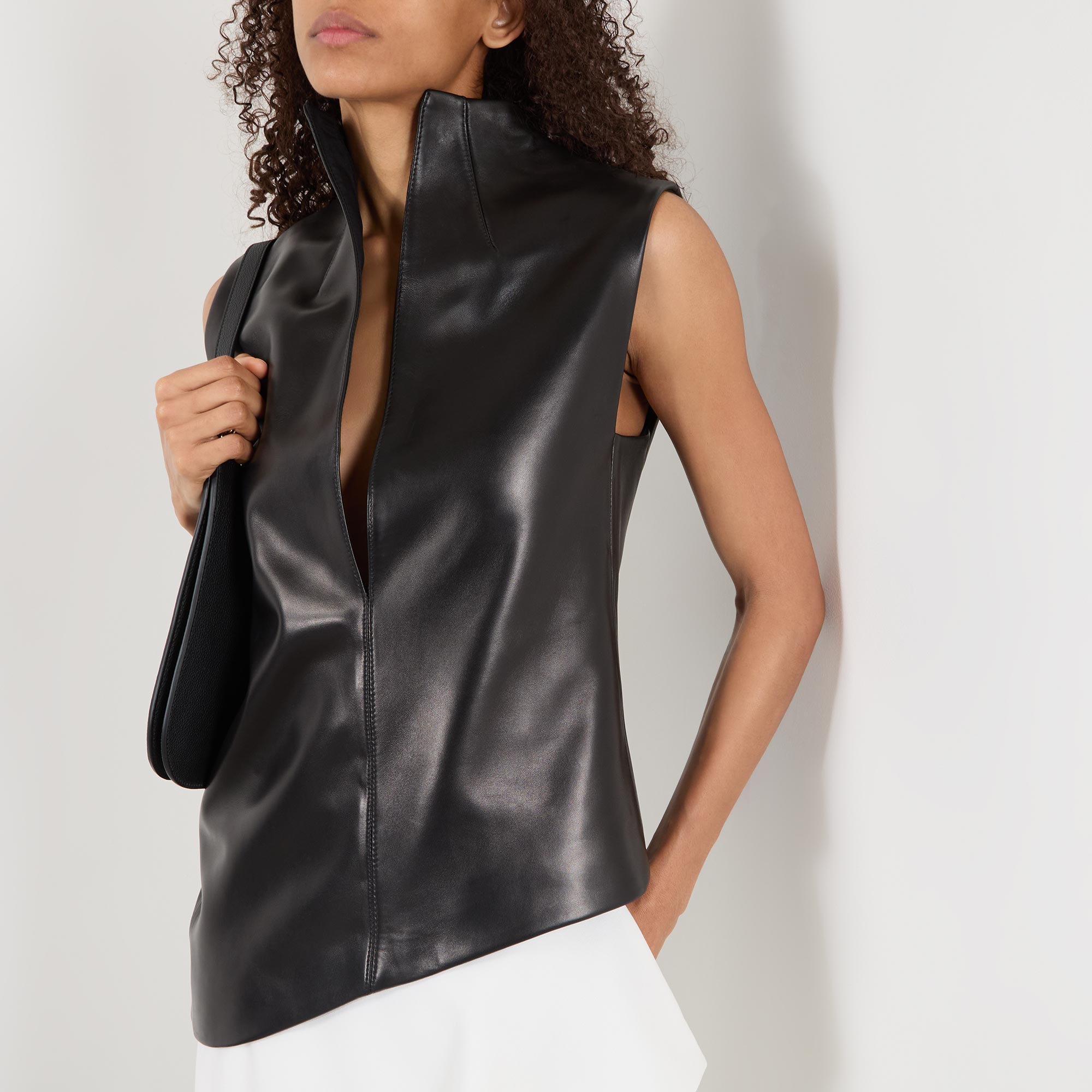 - Stand collar, sleeveless design, deep plunging neckline, discreet hook-and-eye closure at the front, rear zip fastening, asymmetric hem, smooth leather finish