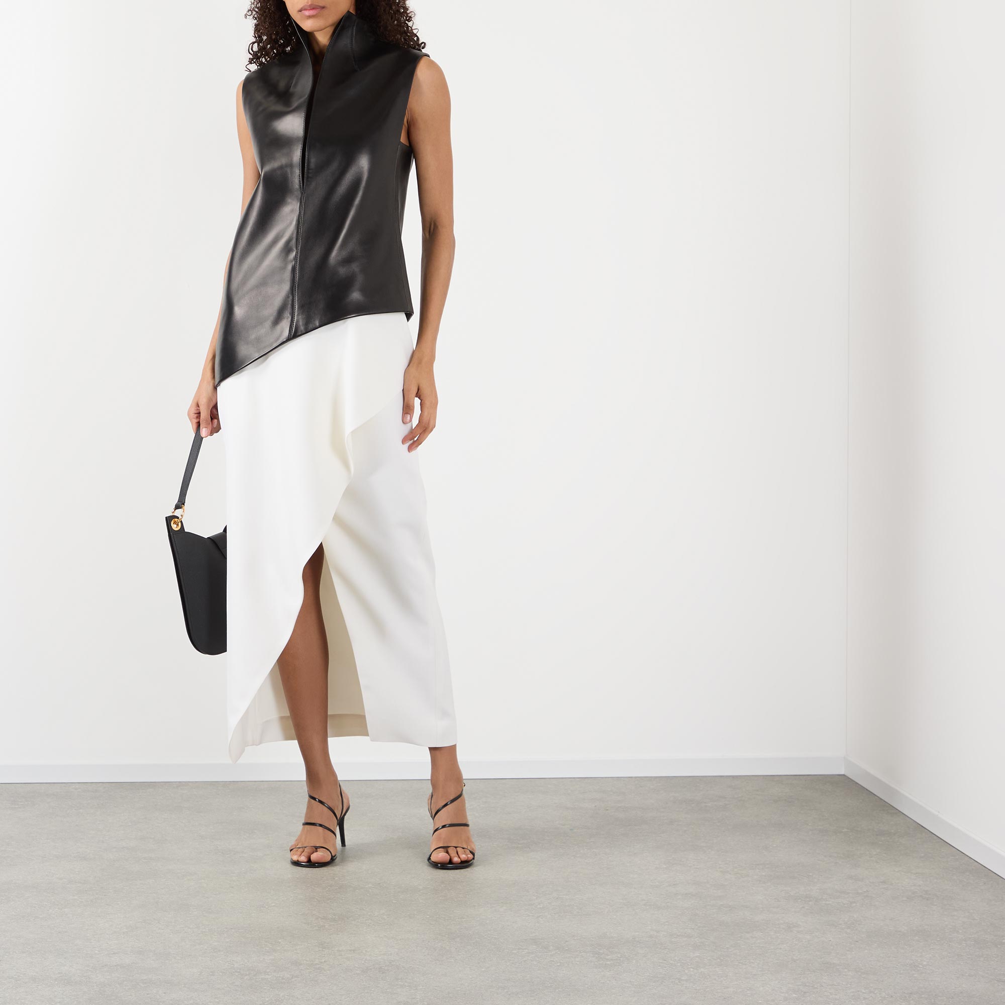 Angular seams and irregular folds feature across Khaite's SS26 collection, as seen here in this top. Crafted from pure leather, the sleeveless design is framed by a stand collar and plunging neckline, which fastens at the front with a discreet hook-and-eye closure, and falls to an asymmetric finish.