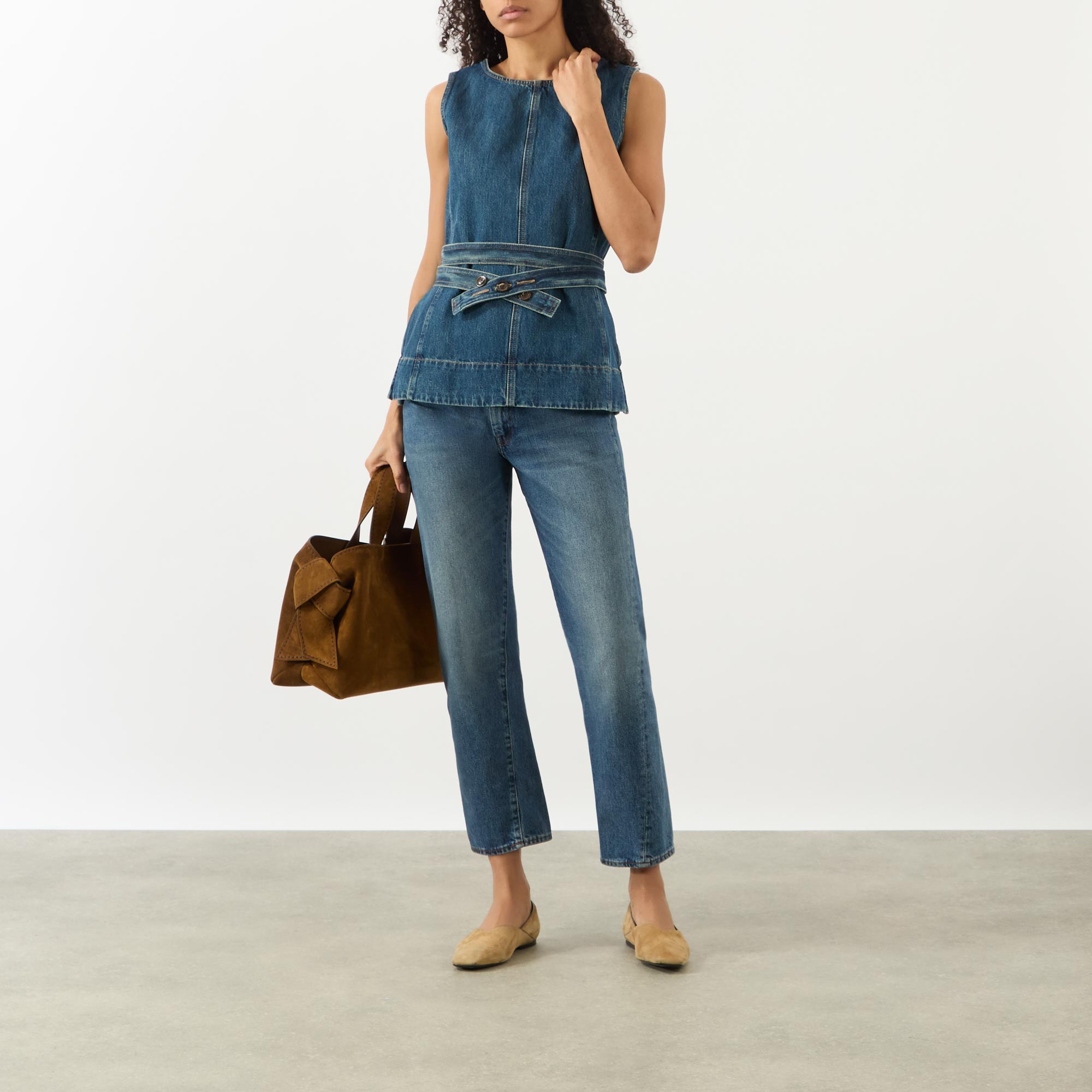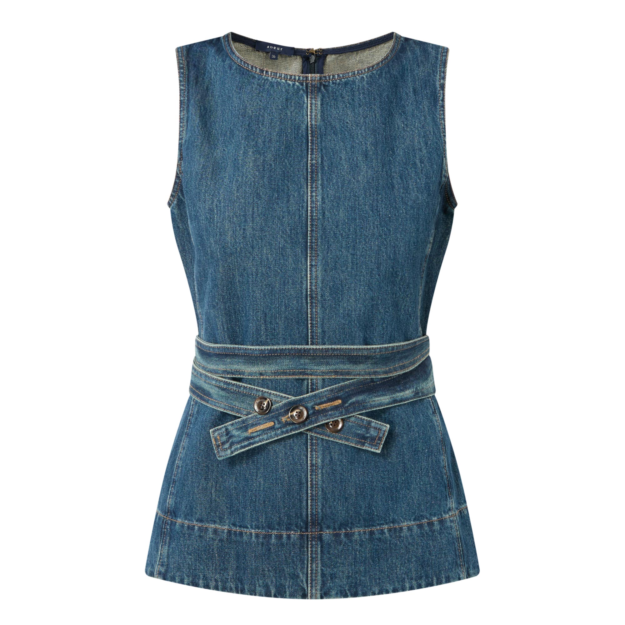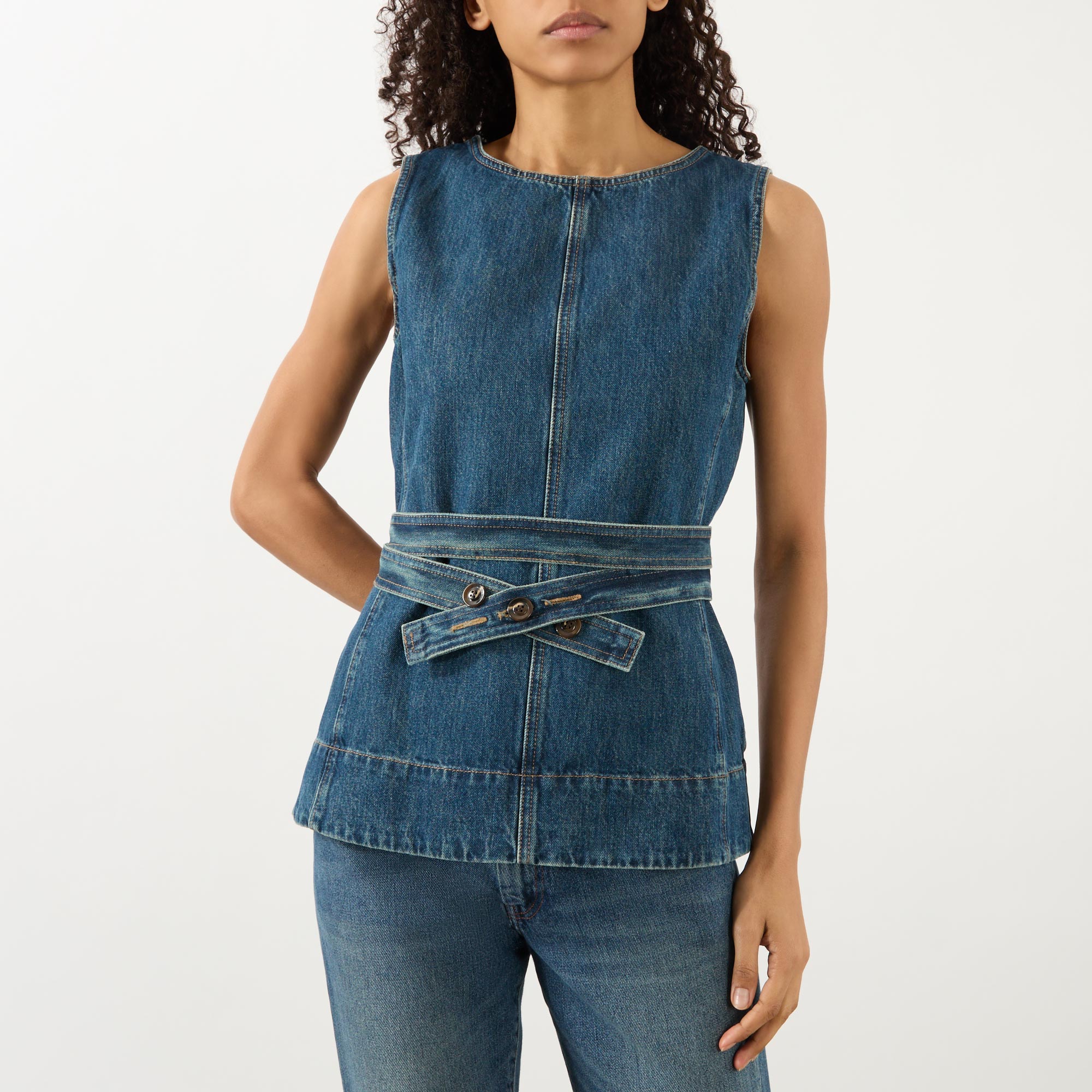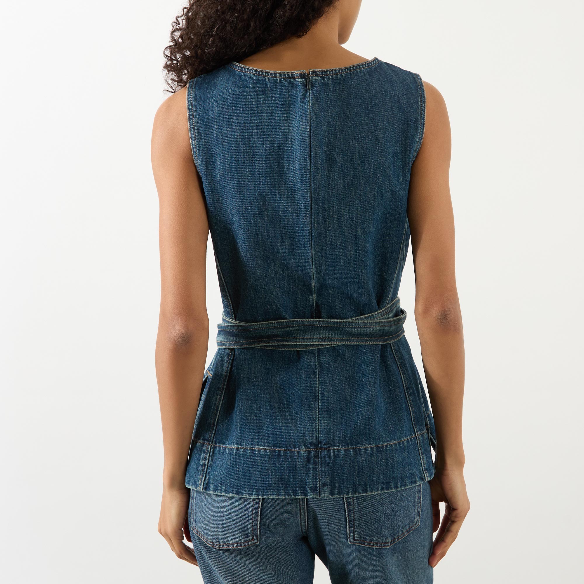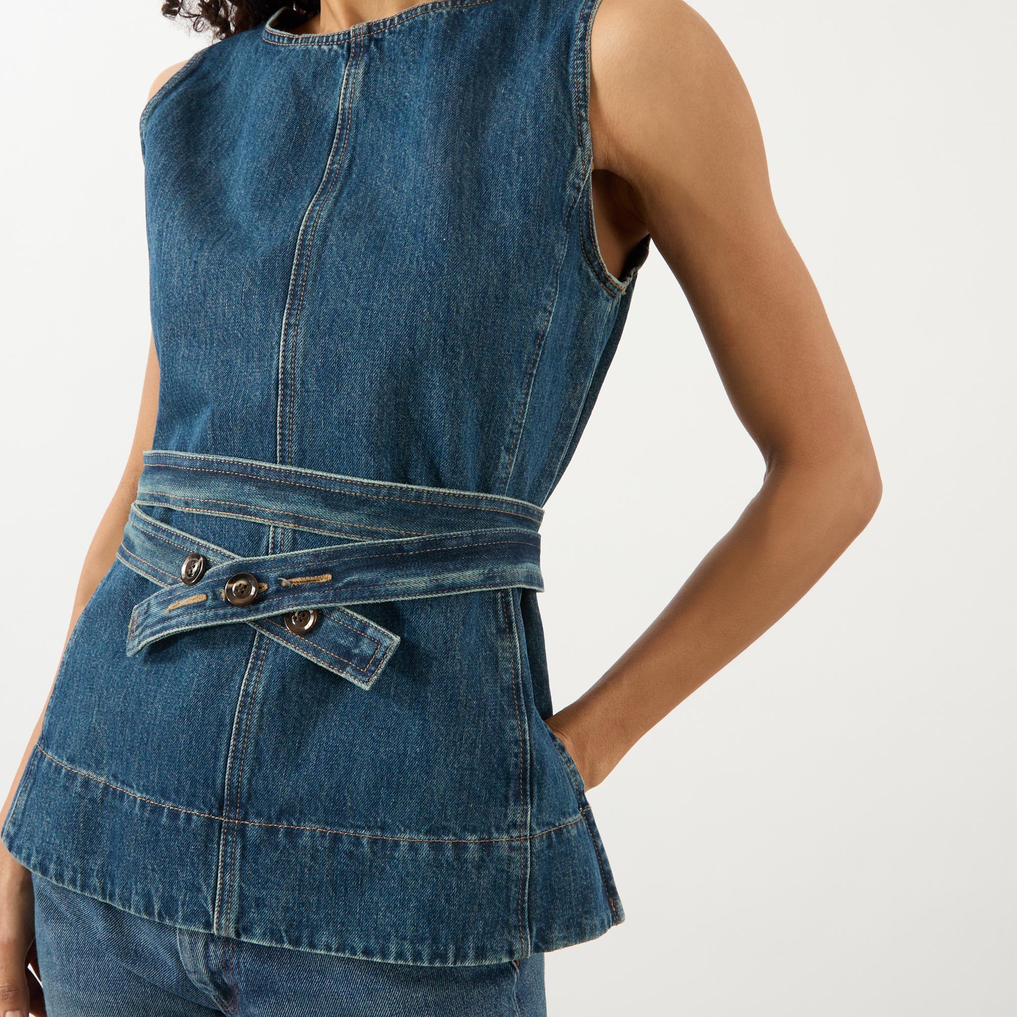 - Round neckline, sleeveless design, rear zip fastening, detachable belt fastening, wrap-around design, fitted through the waist, straight hem, tobacco stitching, mid wash finish
