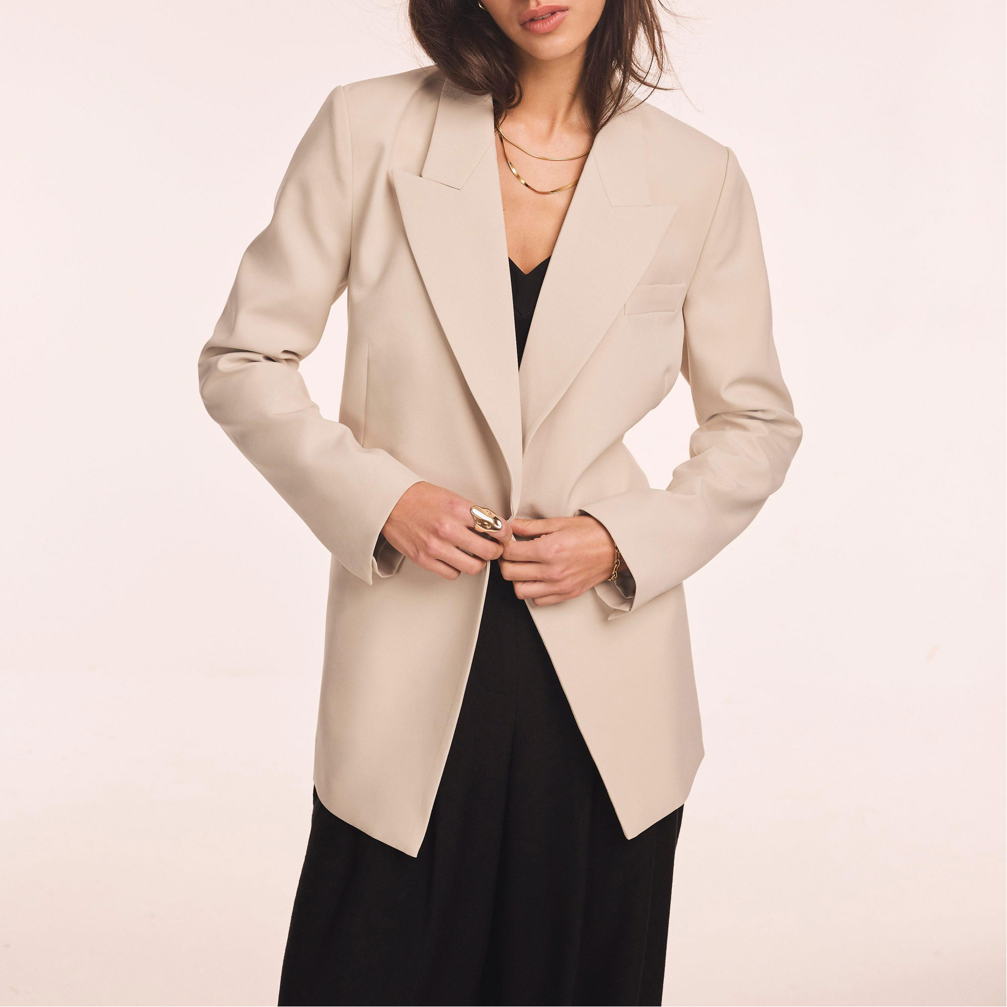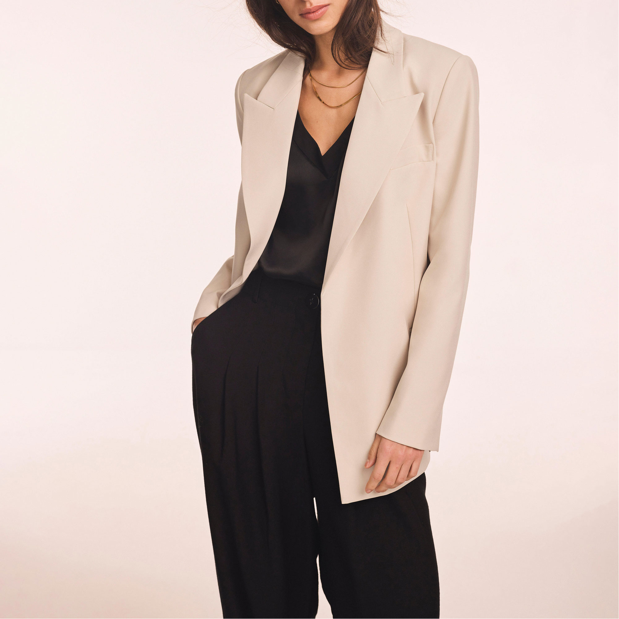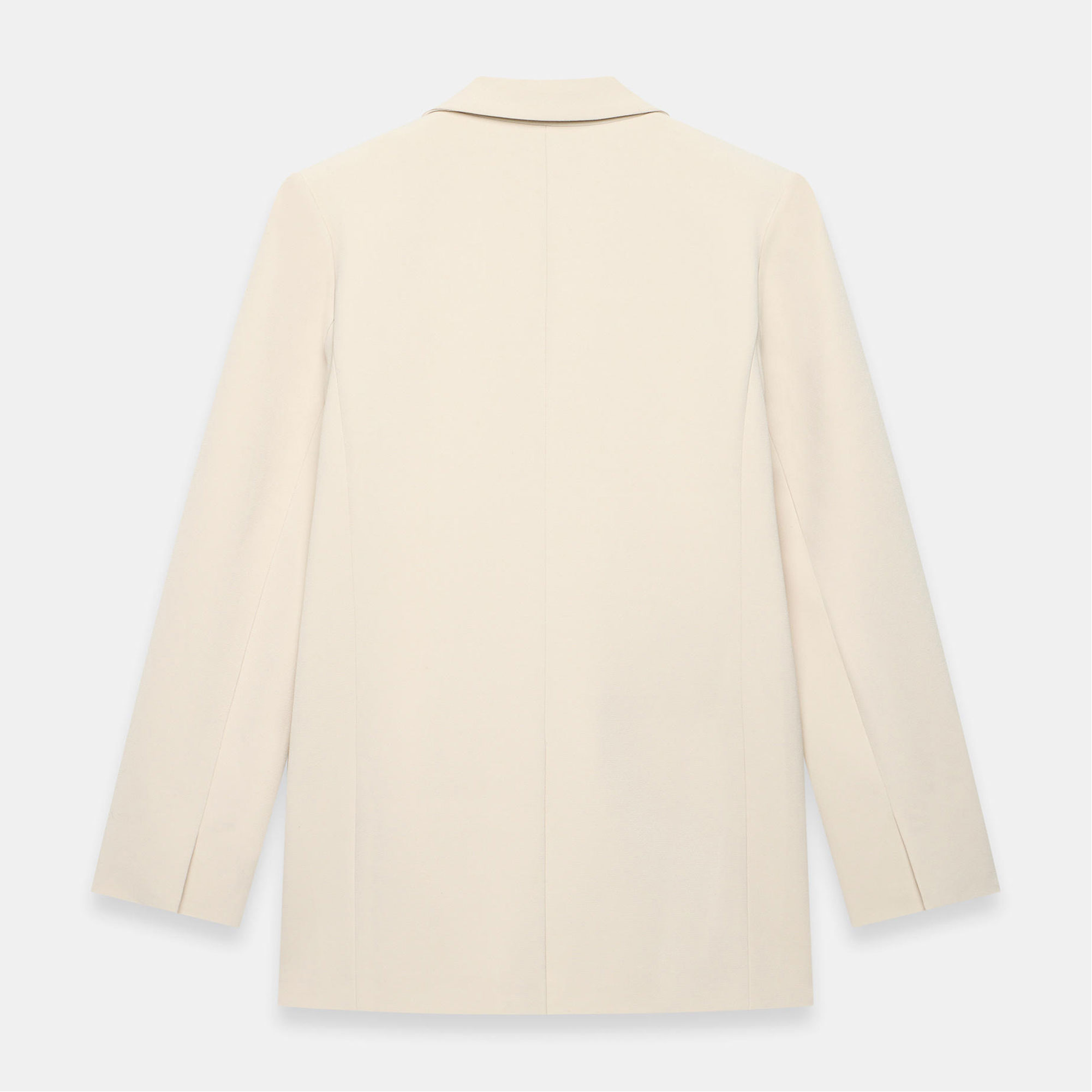 - Longline silhouette, single-breasted, peaked lapels, welt pockets, long sleeves, rear vent, fully lined