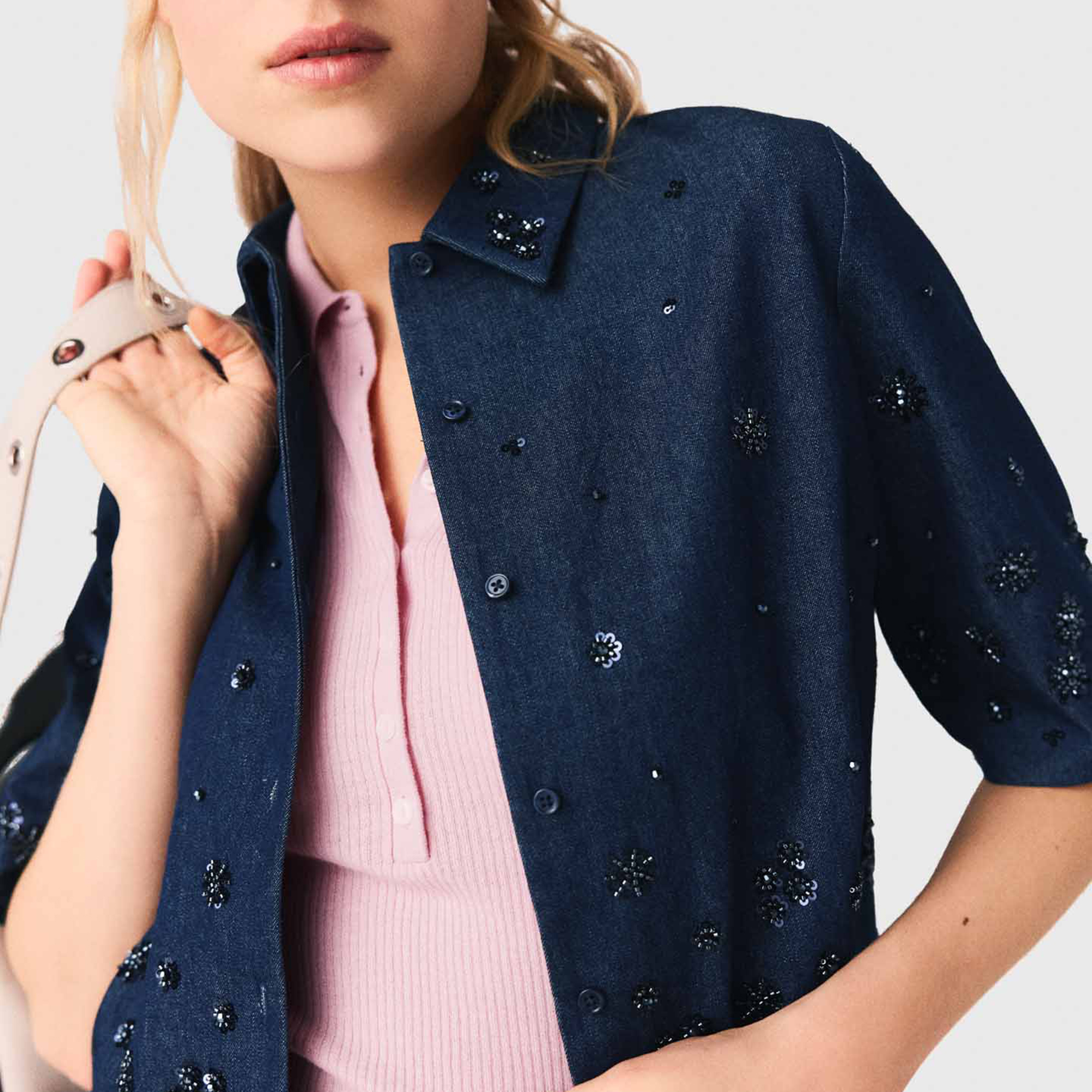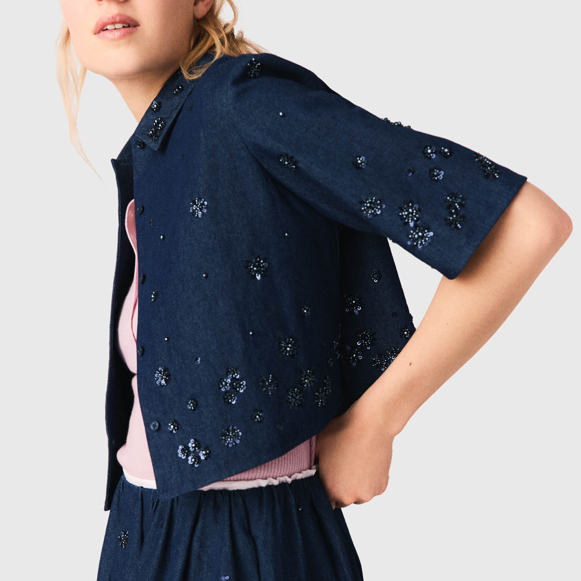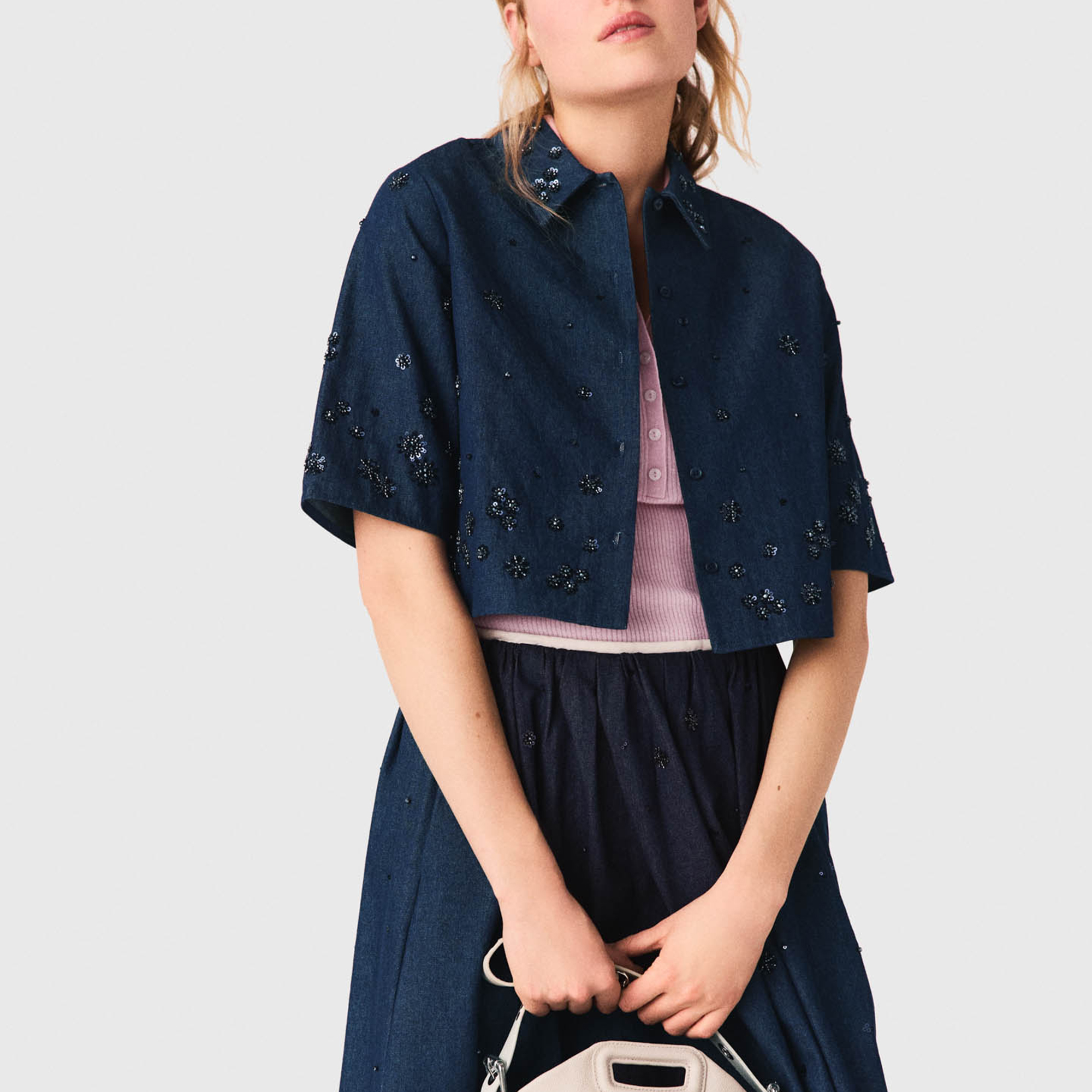 • Denim, sequin and bead floral embroidery, mother-of-pearl buttons, short sleeves, straight cut, matte texture