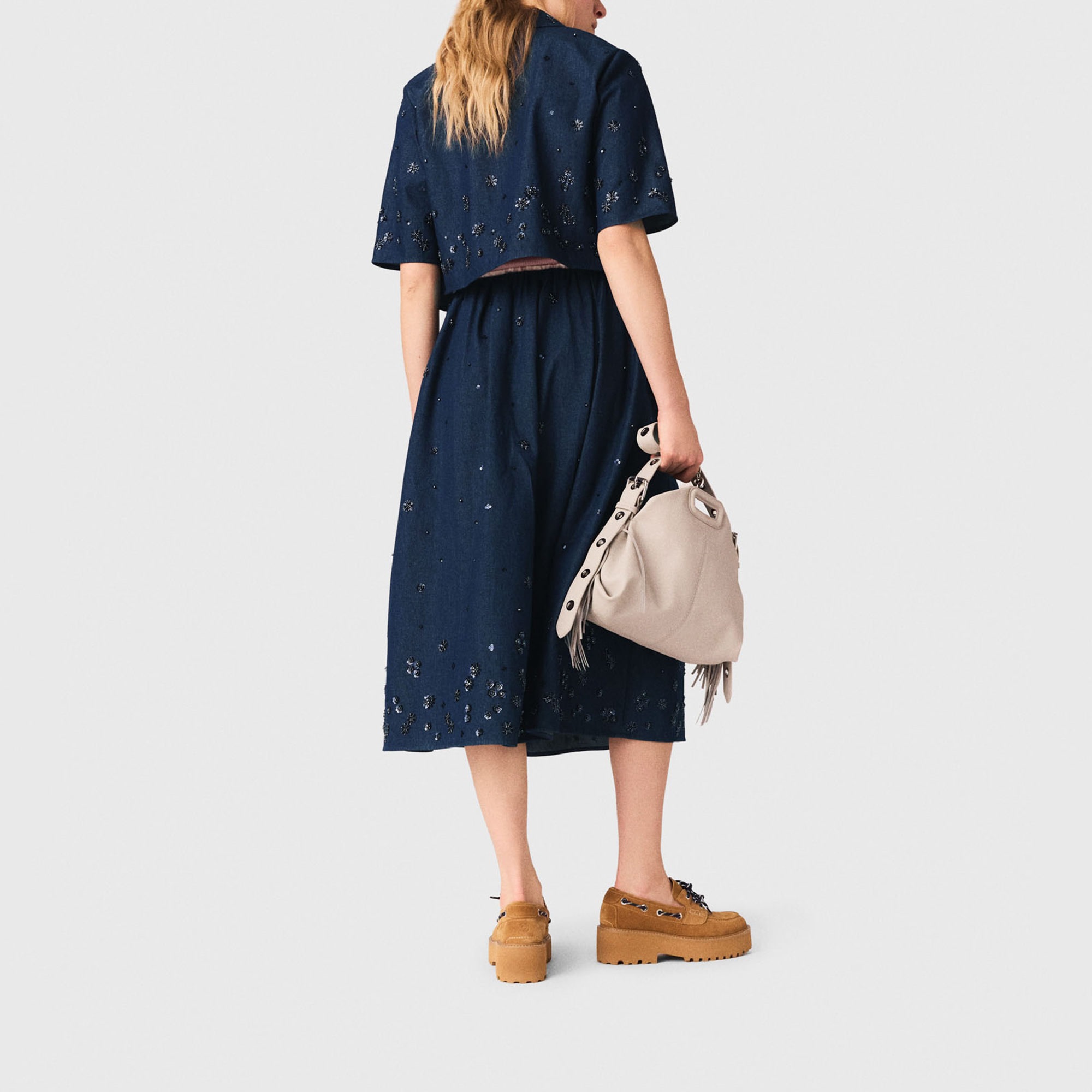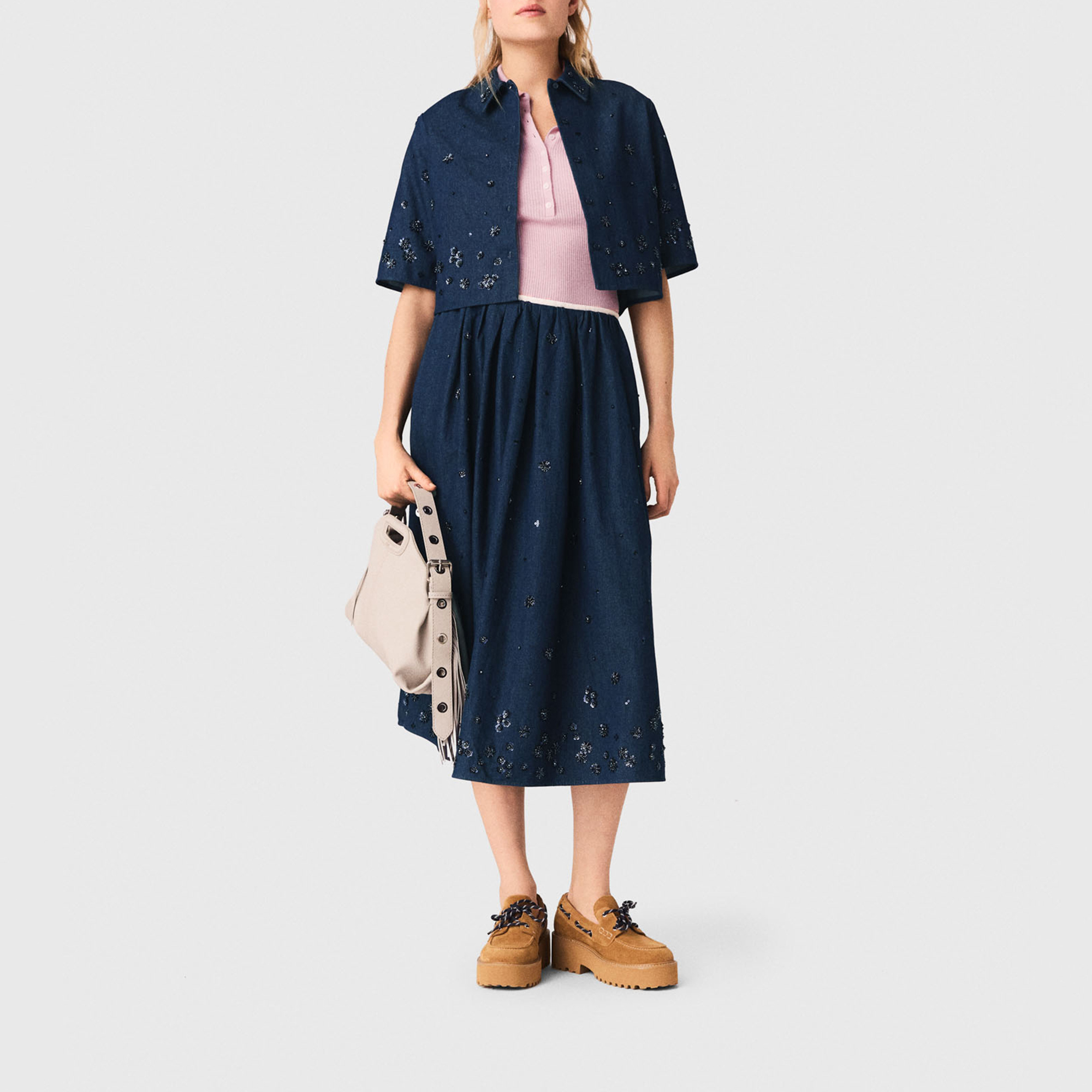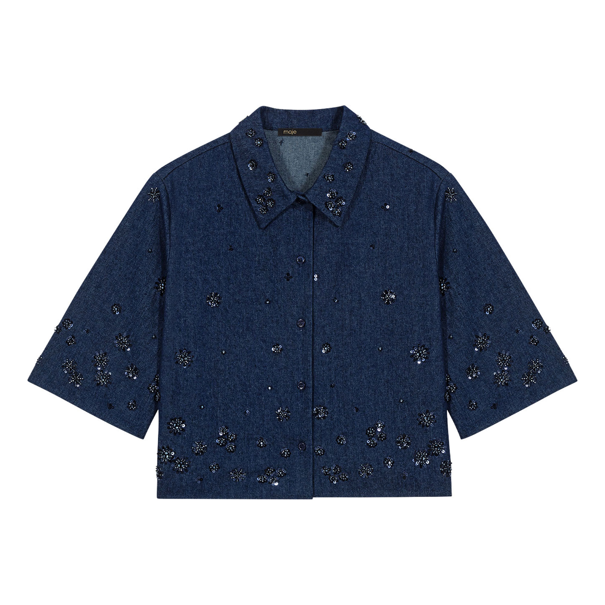 • Denim, sequin and bead floral embroidery, mother-of-pearl buttons, short sleeves, straight cut, matte texture