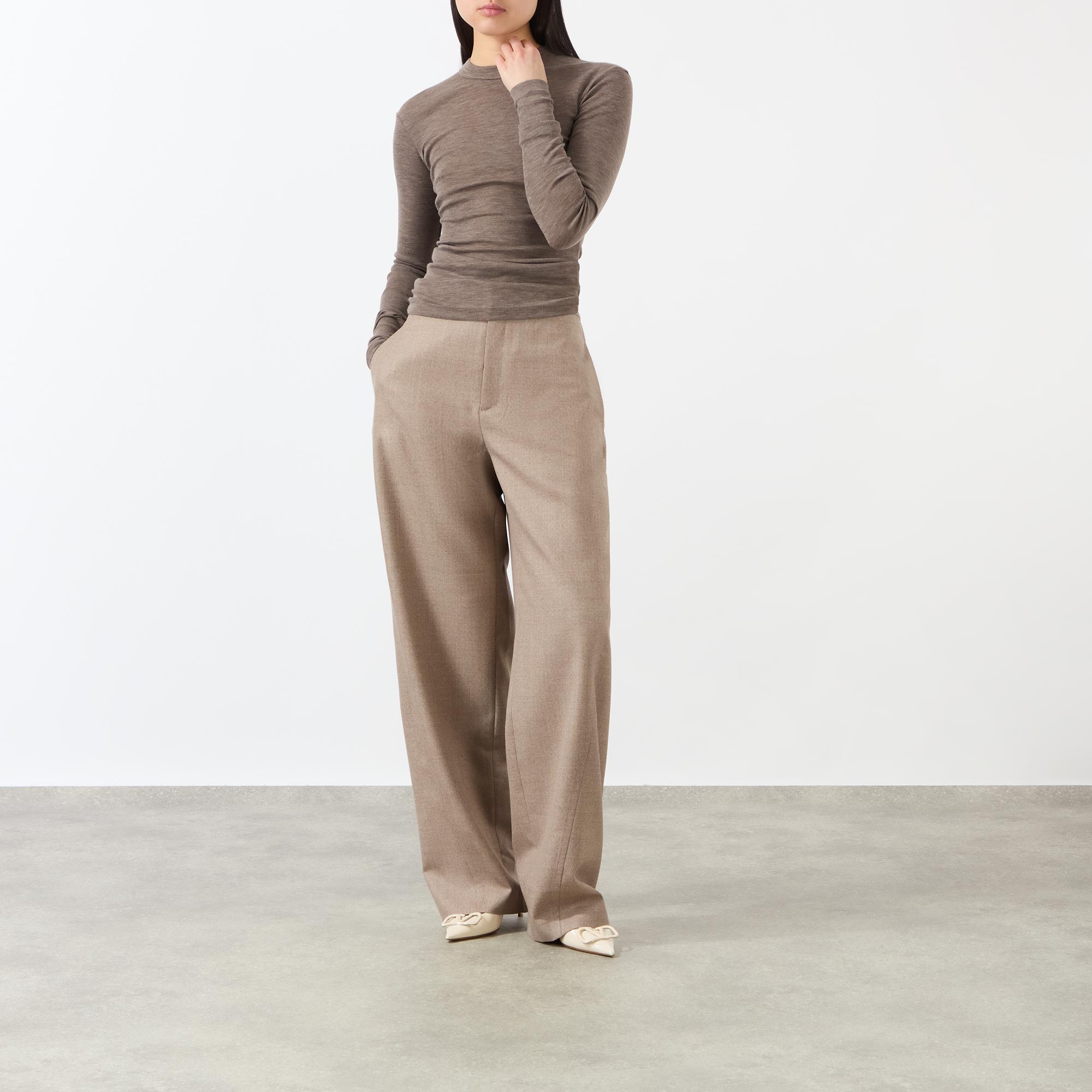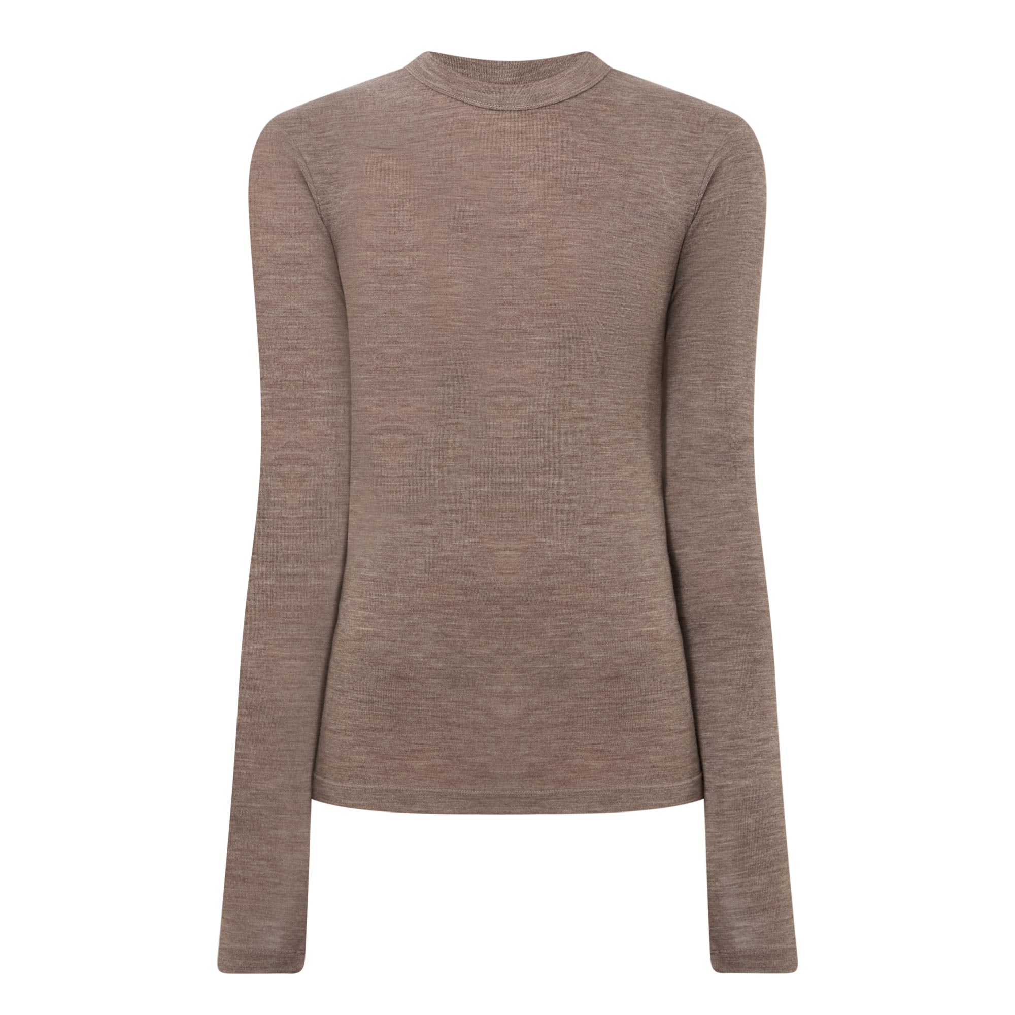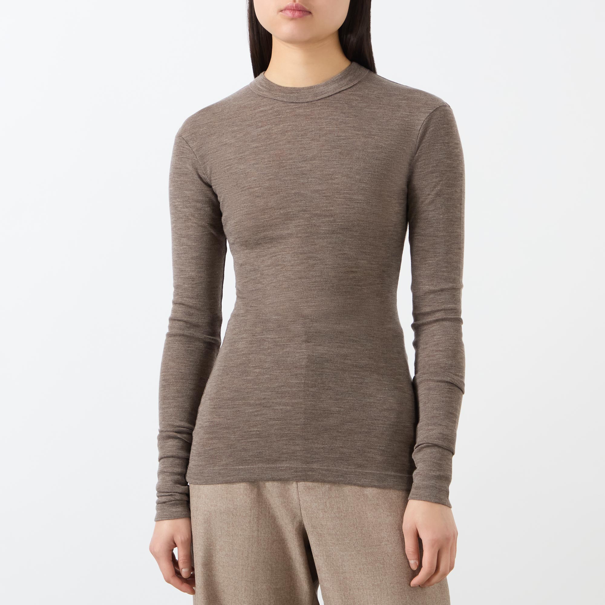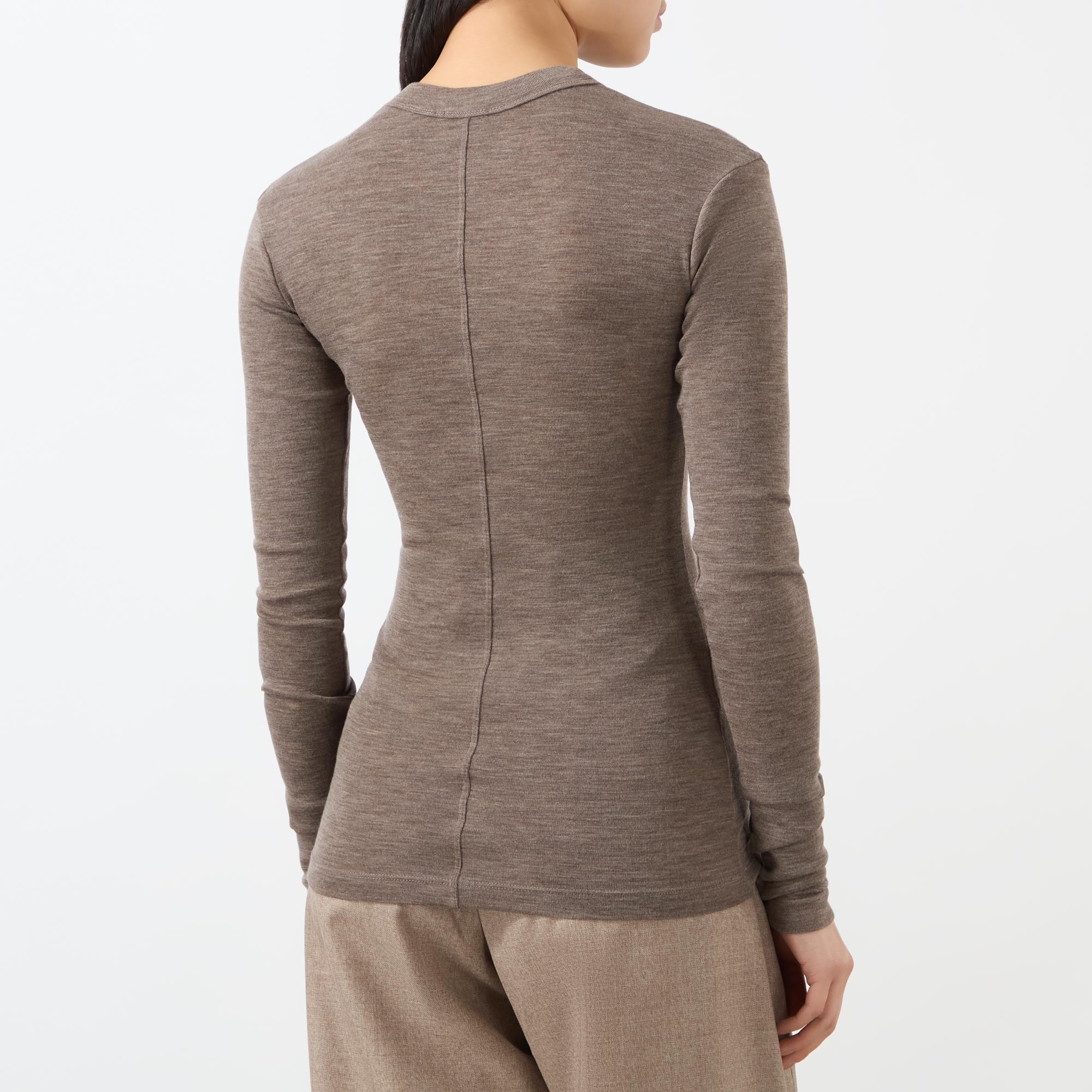 - Round neckline, long sleeves, straight hemline, fine-gauge merino wool, raised seams