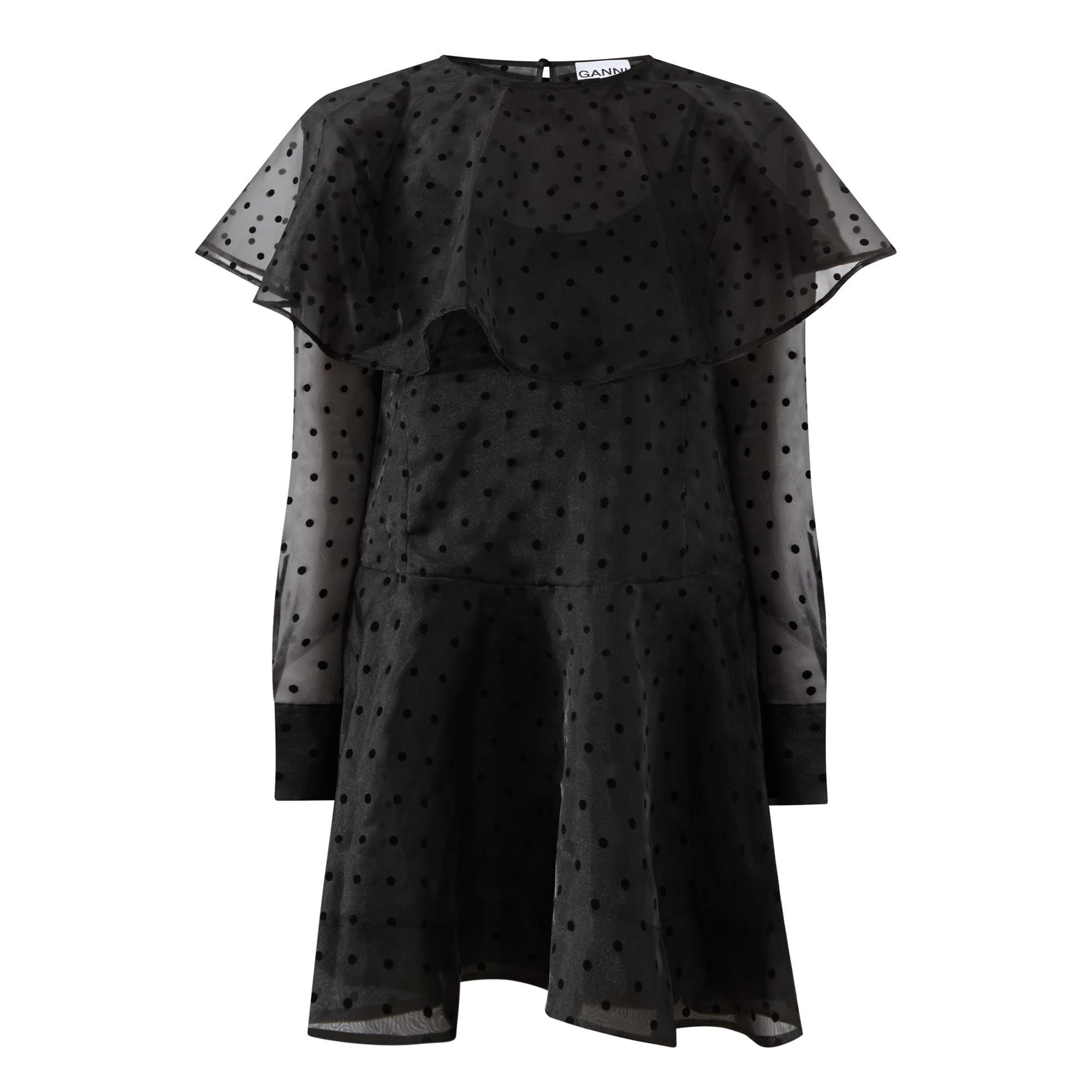 - Removable slip underneath, polka dot organza overlay, long sleeves, round neckline, tie-fastening neck cape, single-button cuffs, flared hemline, mini length