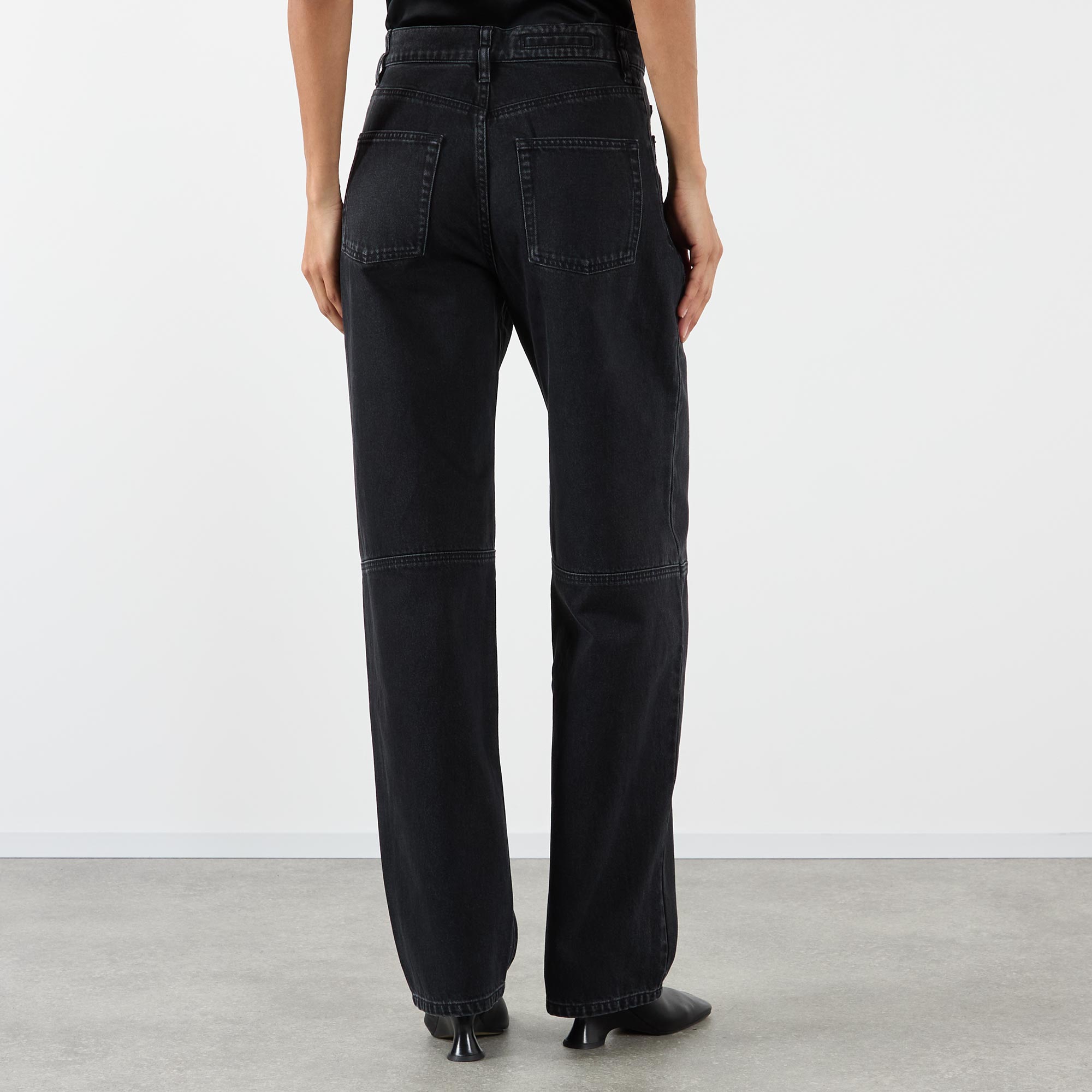 - High rise, barrel leg, belt loops, concealed fly and button fastening, five-pocket styling, clean hems, panelled design, defined knee seams, subtle fading throughout