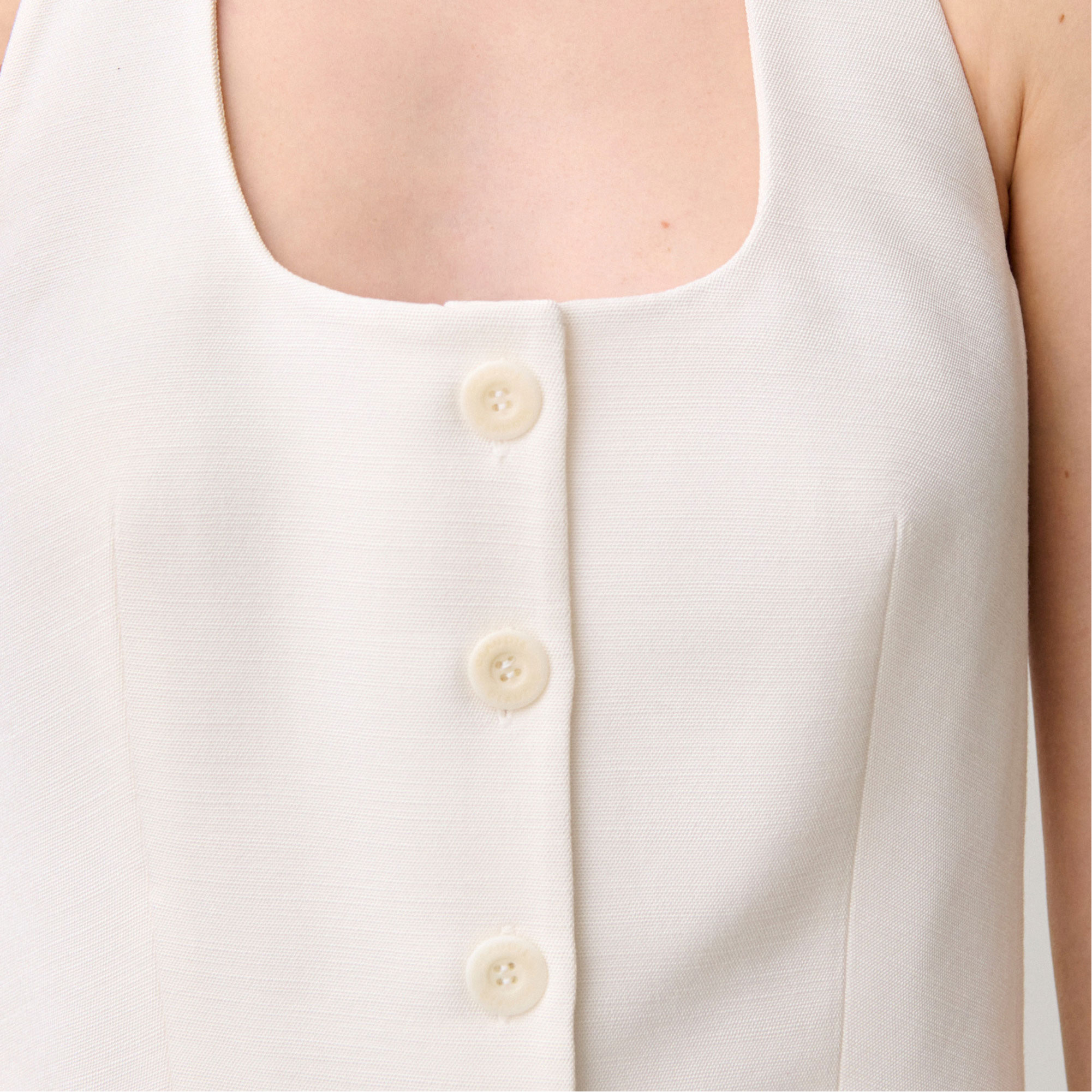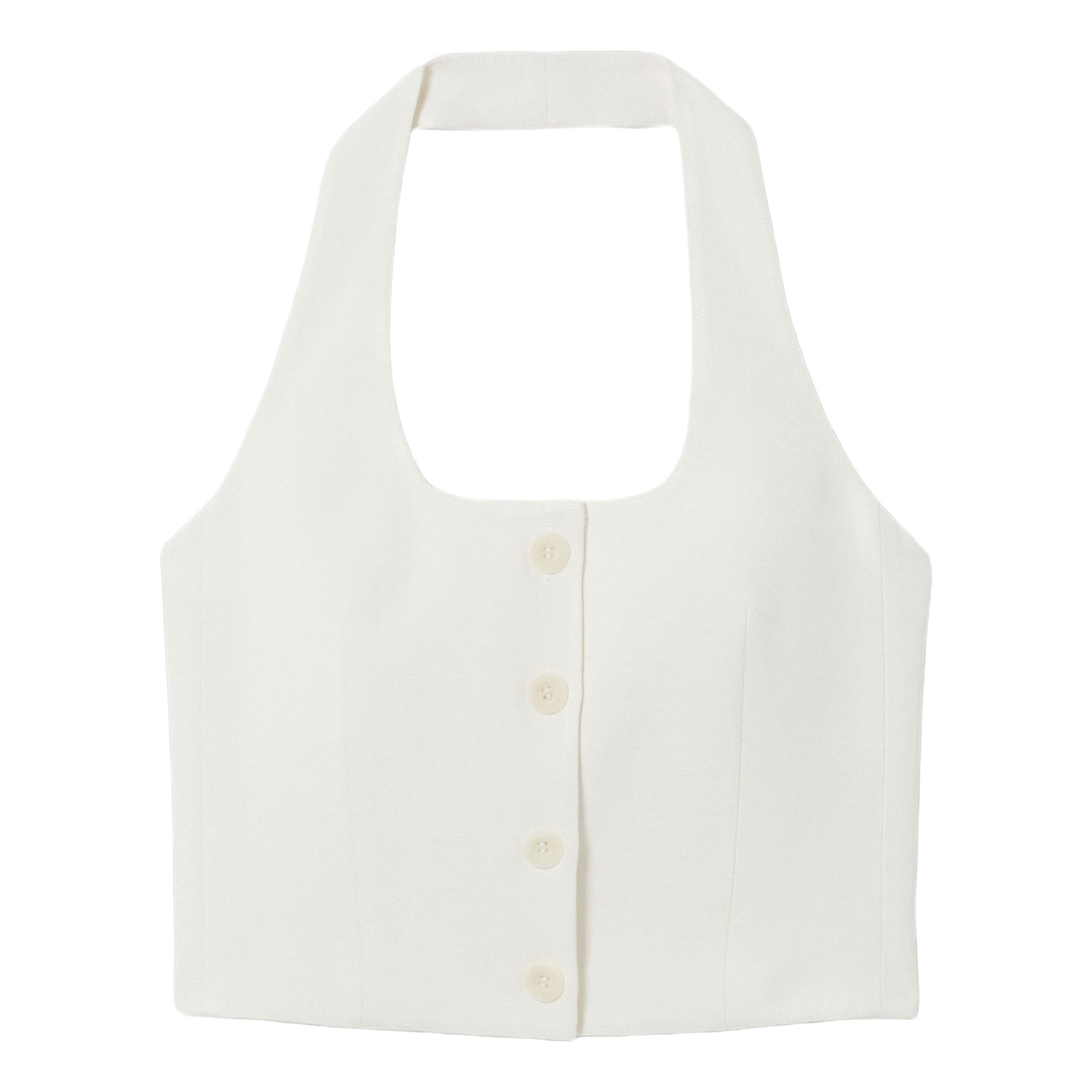• Backless, sleeveless, waistcoat style, button placket, scoop neckline, four buttons, tie with buckle fastening