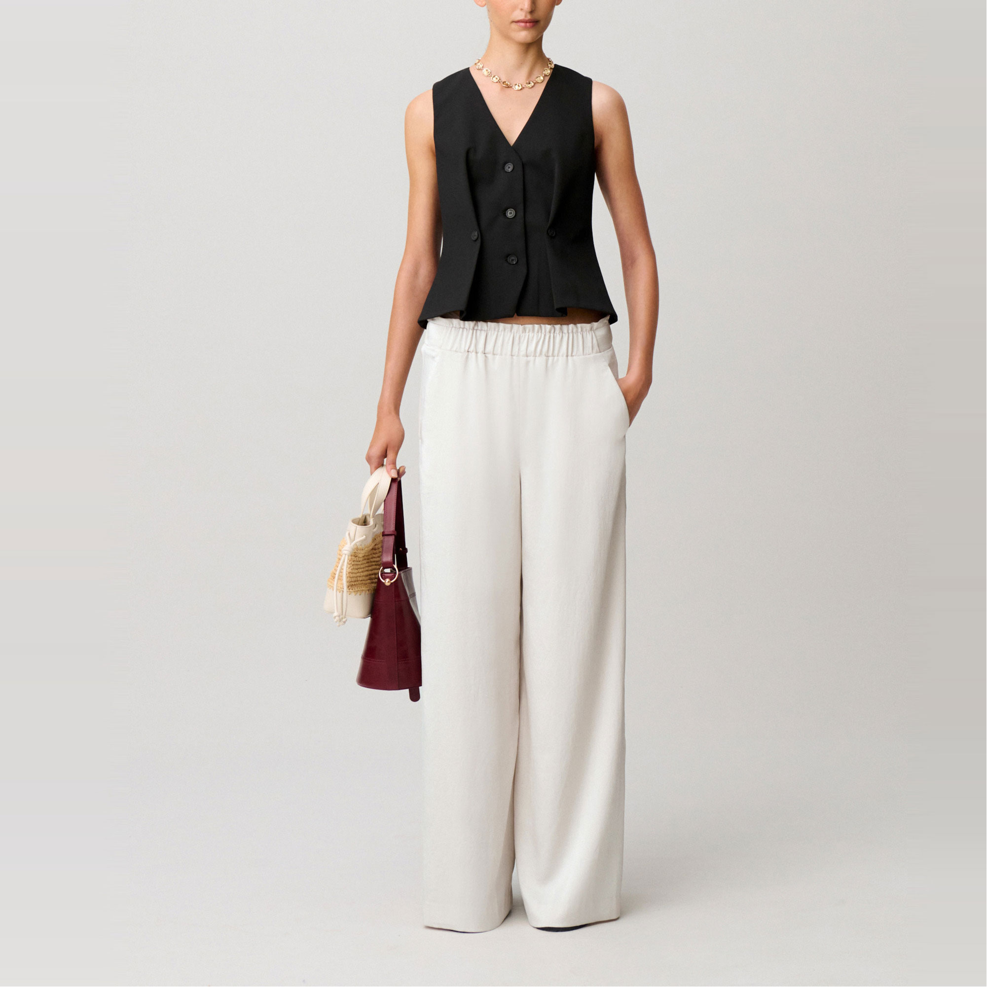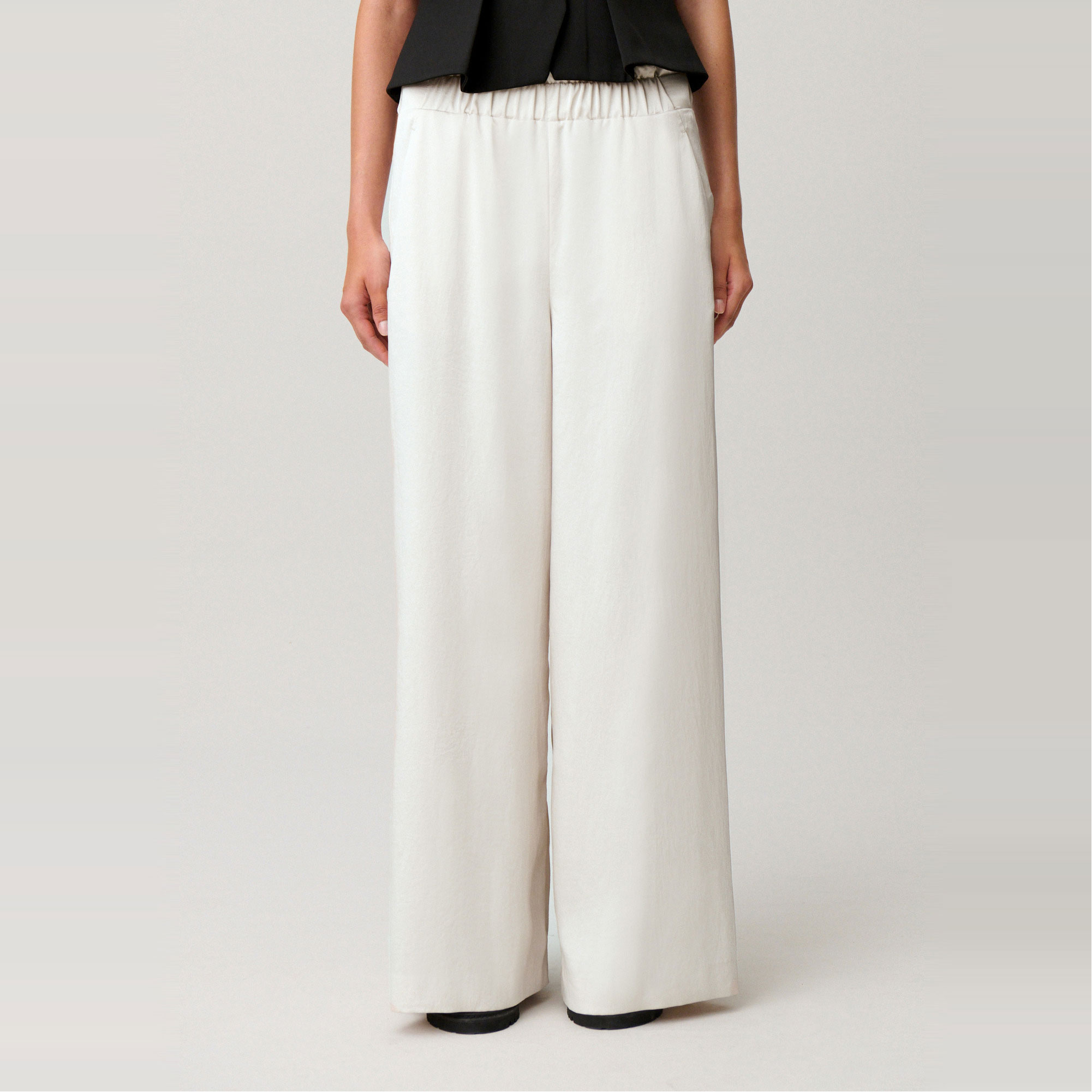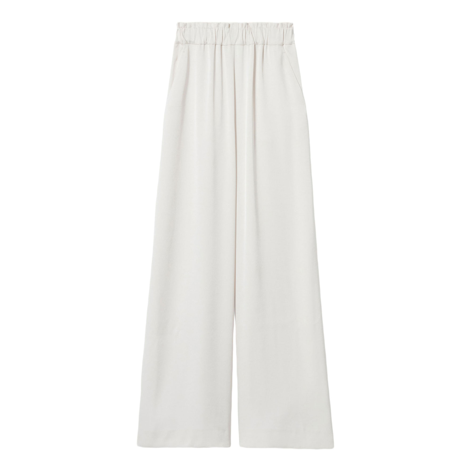 • Satin style, wide straight-leg silhouette, elasticated waistband, gathered details at the waist, two Italian pockets
