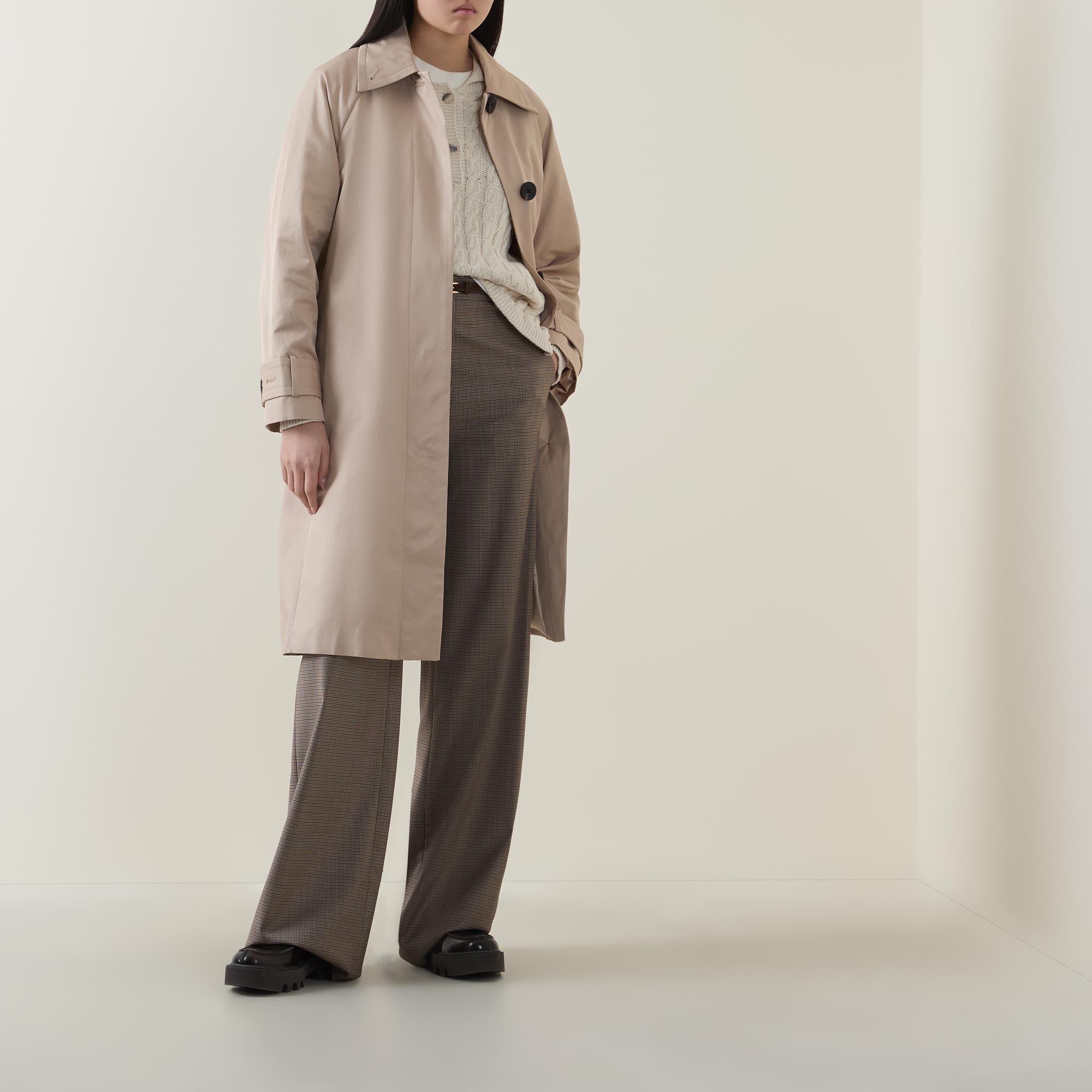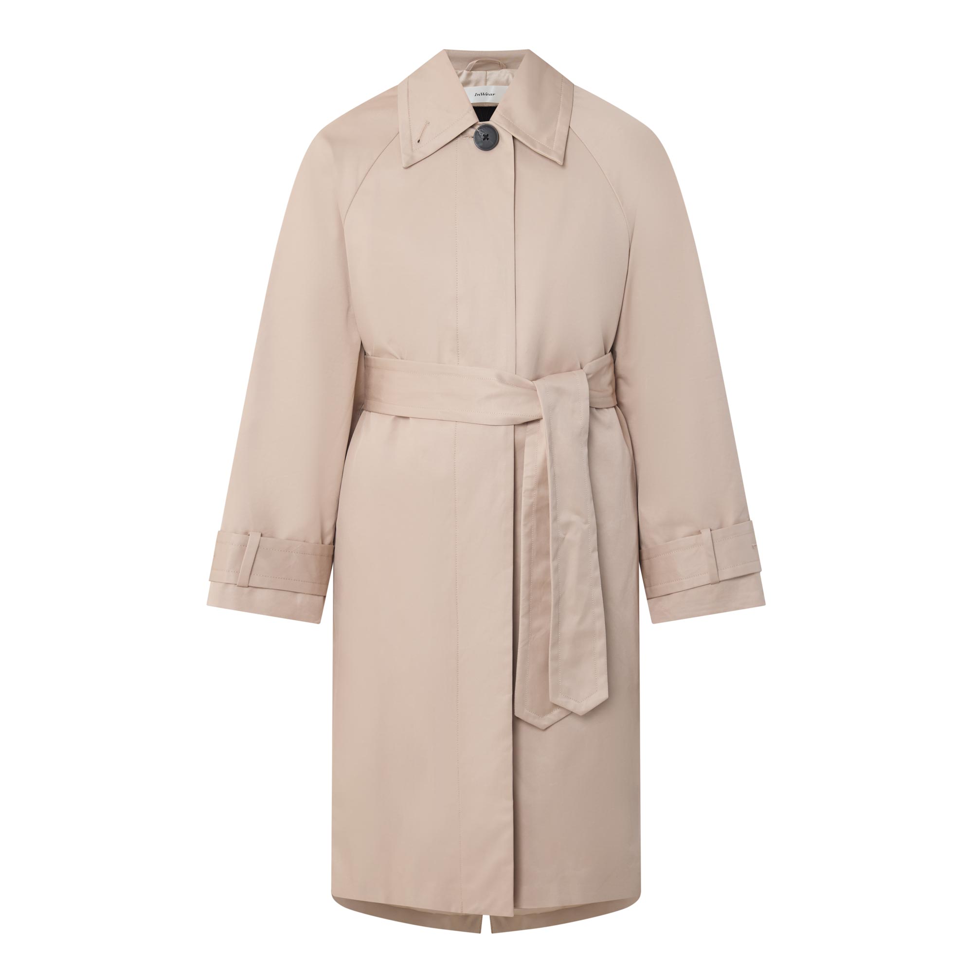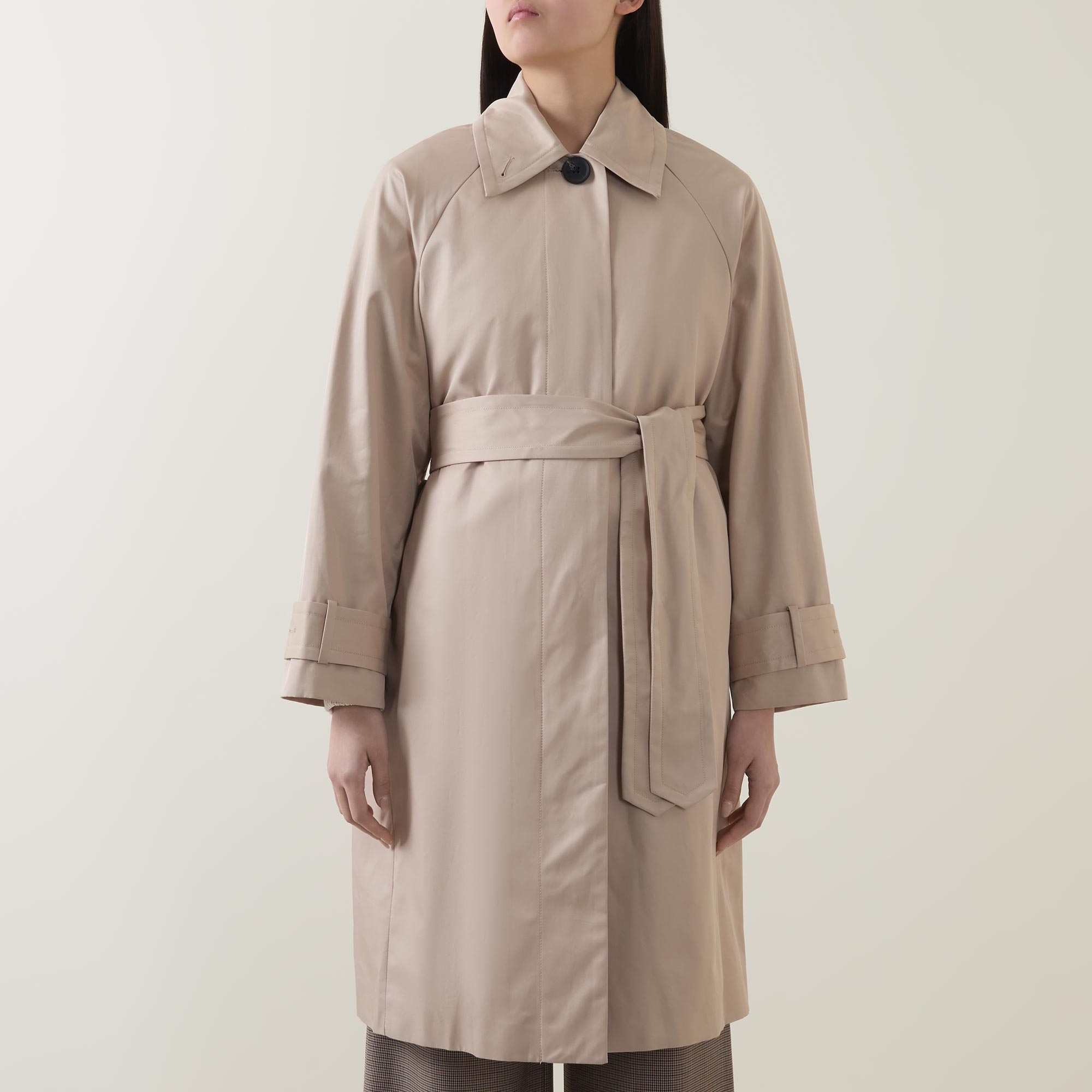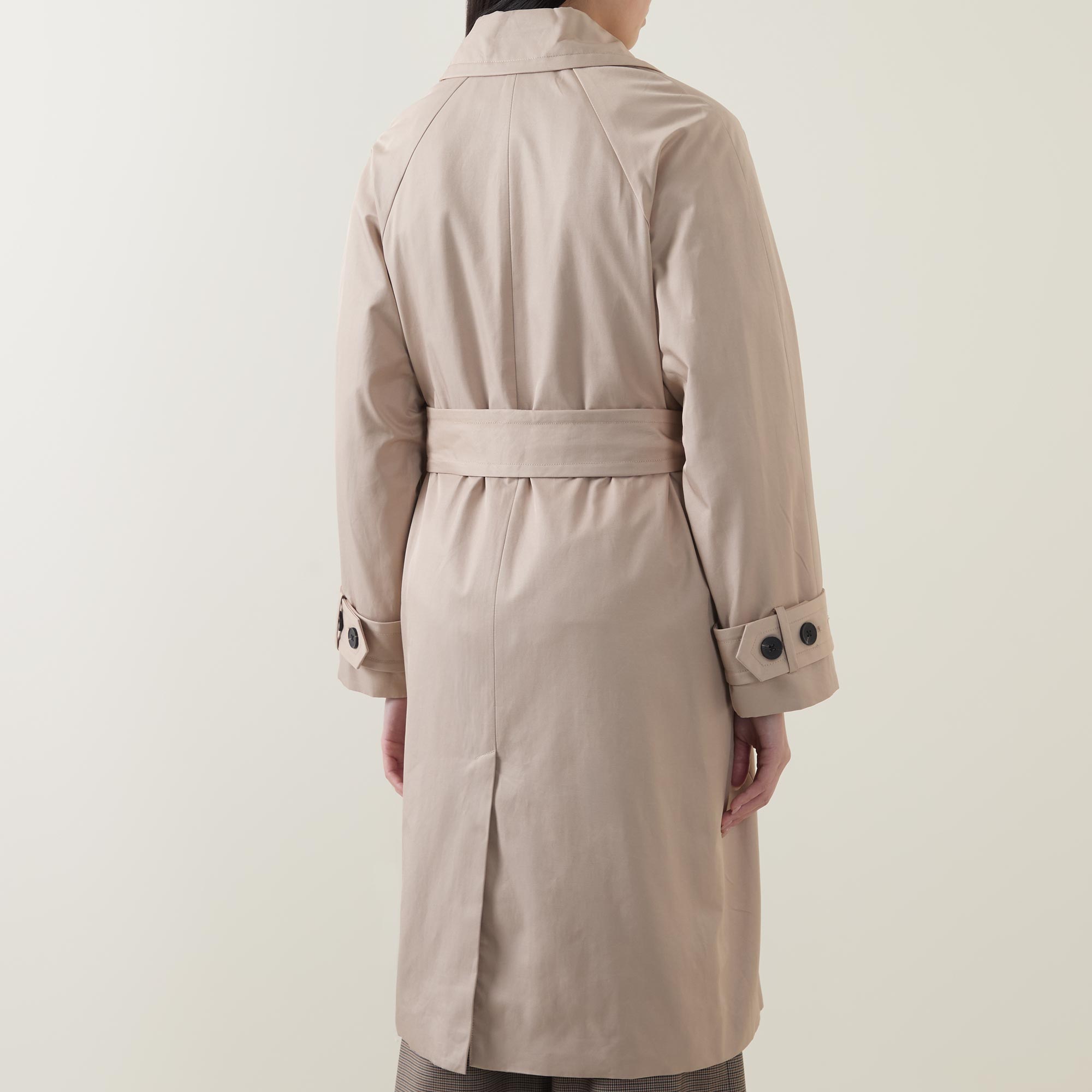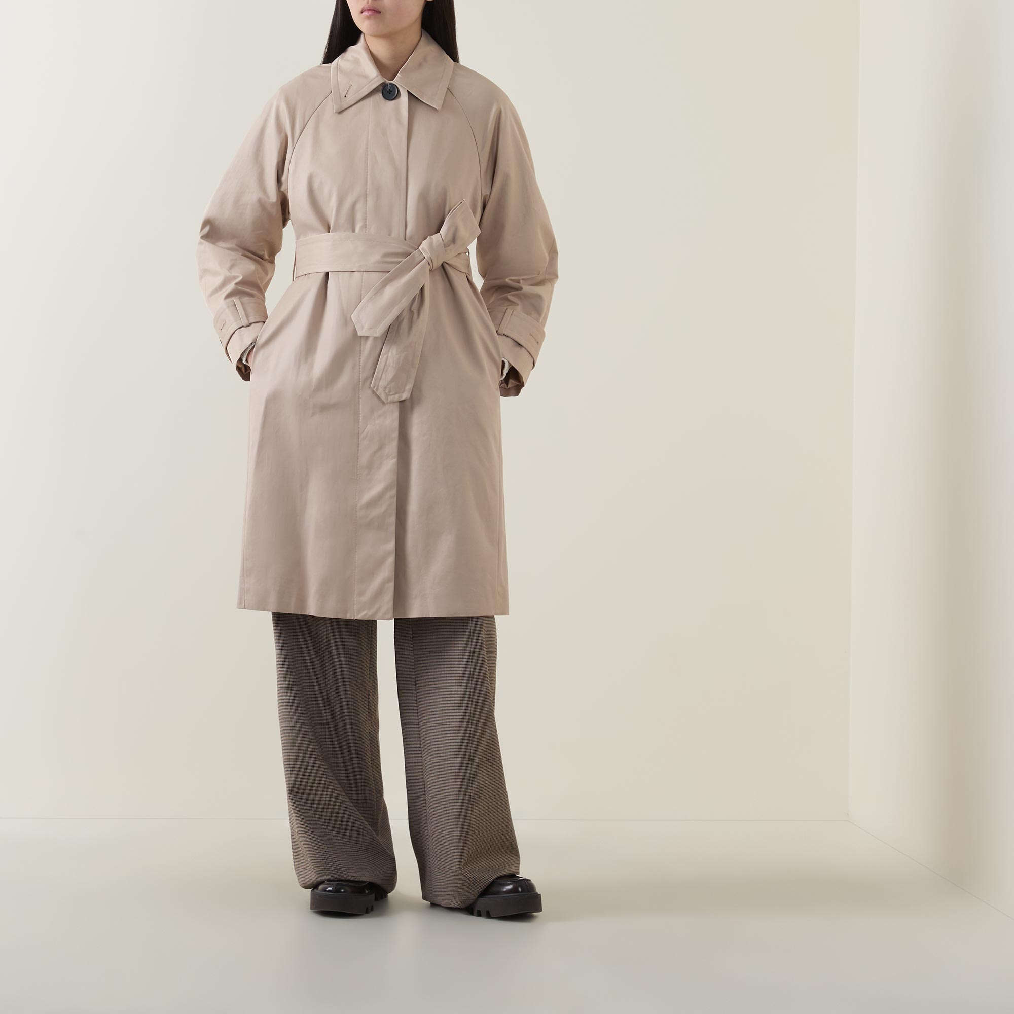 - Flat collar, concealed button fastening, self-tie belt at waist, belt loops, side entry pockets, vent to the rear, tab adjustable cuffs