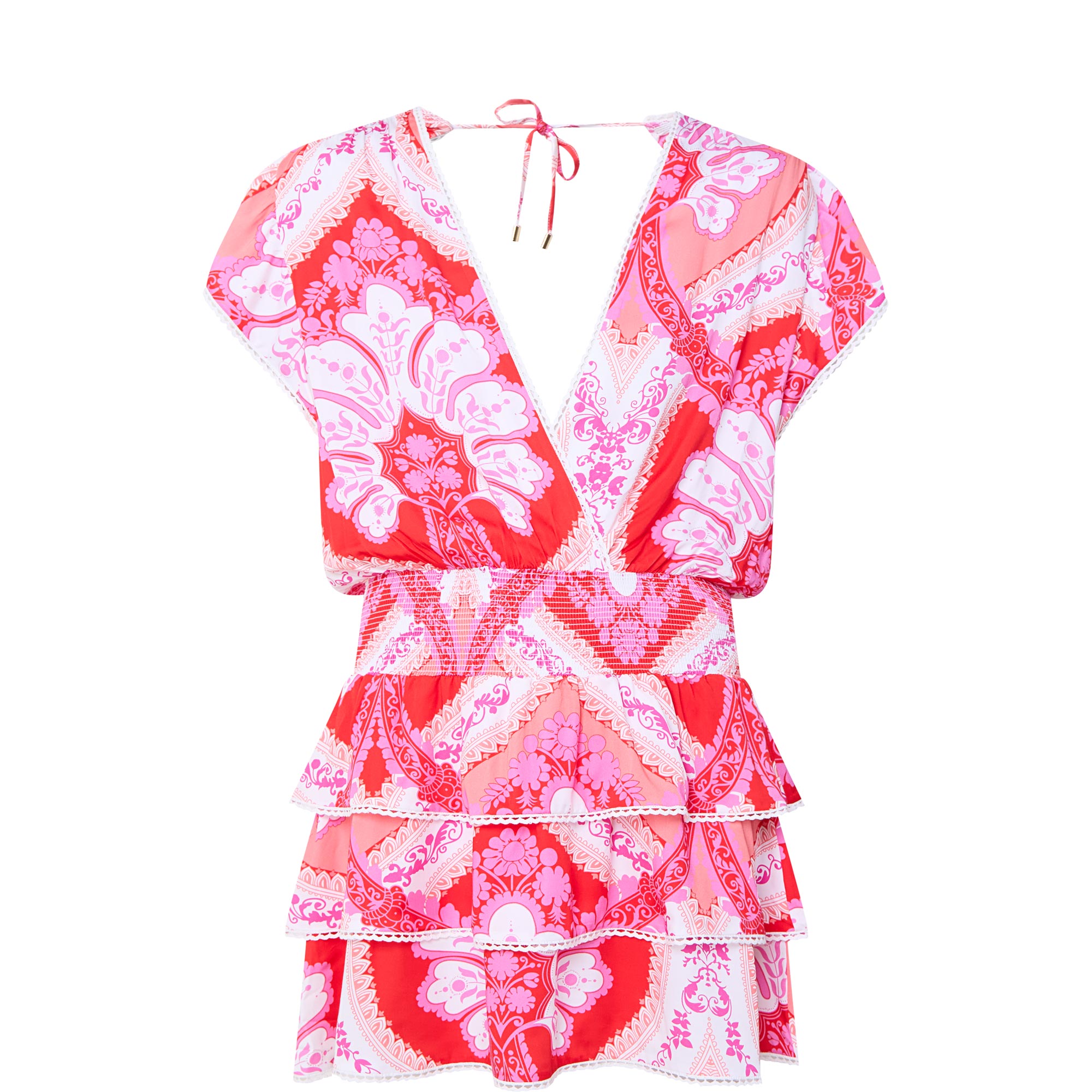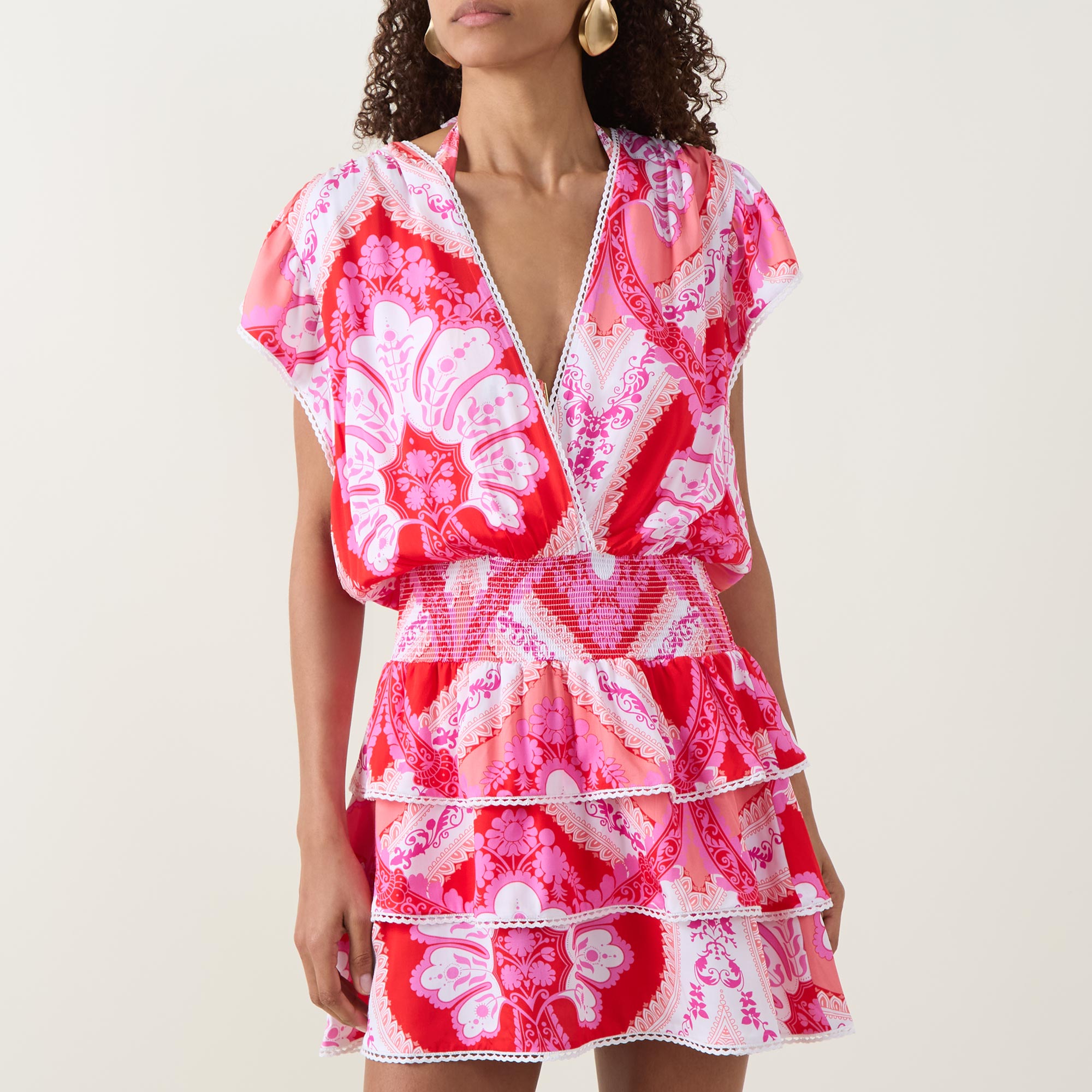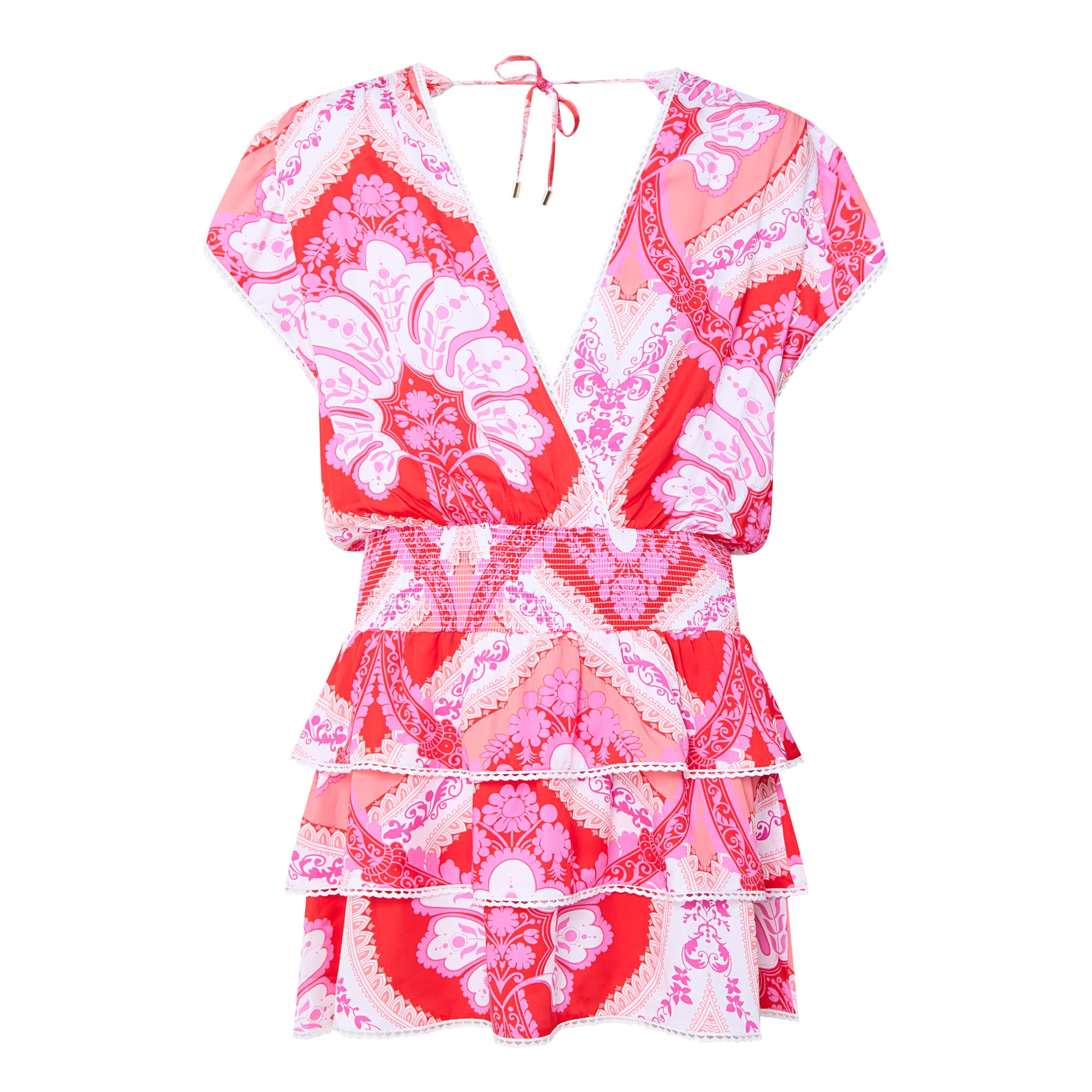 - Plunge neck, tiered frills, elasticated waistband, tie back fastening, gold cord ends, ornate print