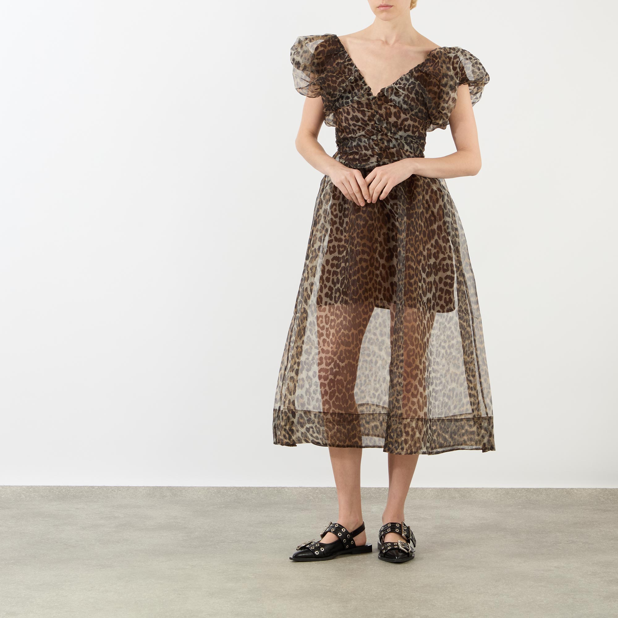 - Round neck, dropped shoulders, short sleeves, two side seam pockets, rear zip fastening, dropped waistline, flared hem, leopard print pattern, mini length, stretch fabric