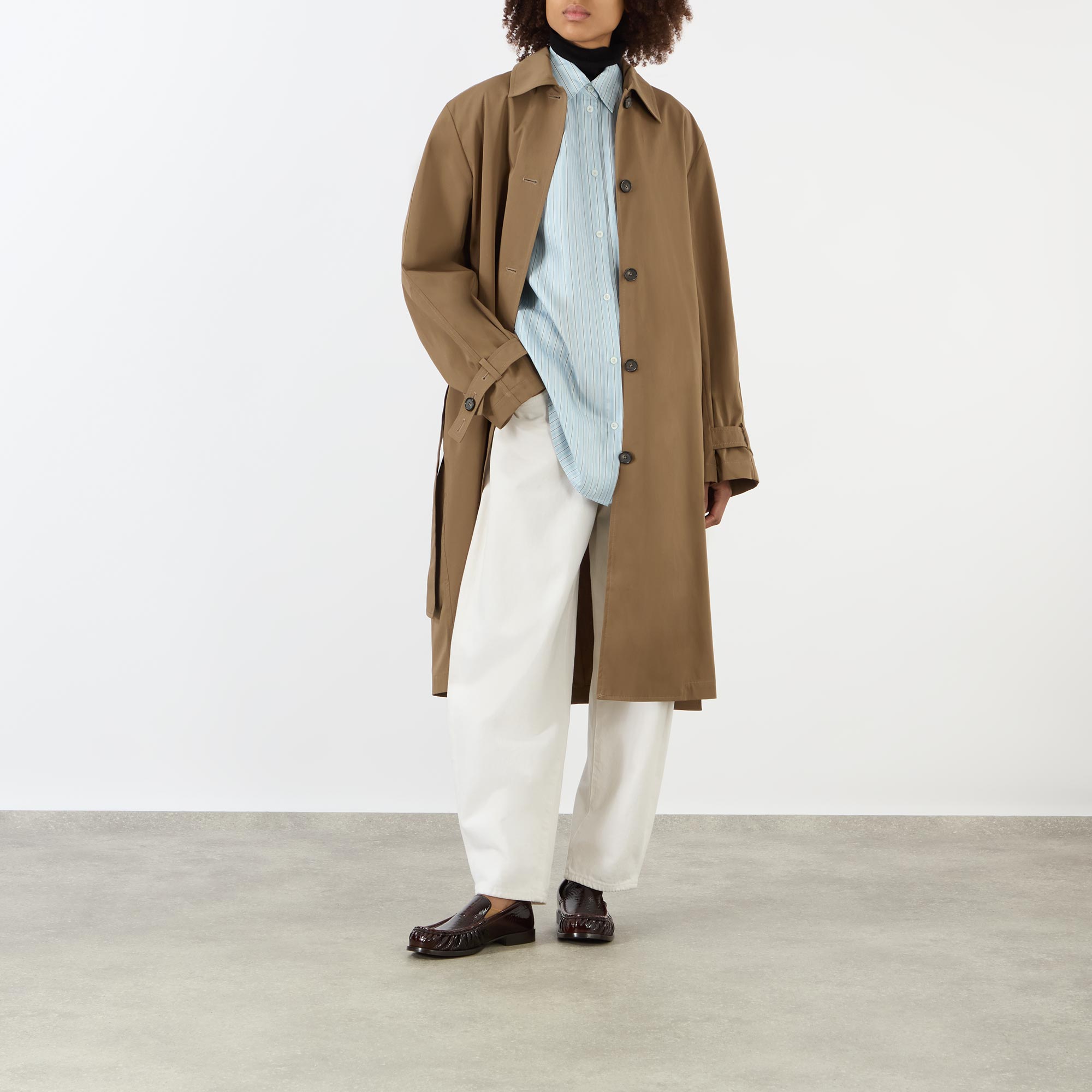 The SS26 collection by Totême embraces a new wave of outerwear, where precision tailoring meets looser, more relaxed silhouettes, take this trench coat. Crafted from pure cotton, it's framed by a shirt collar and long sleeves with tabbed cuffs, securing with a button placket and matching self-tie waist belt, while equipped with two side seam pockets to store your seasonal essentials.